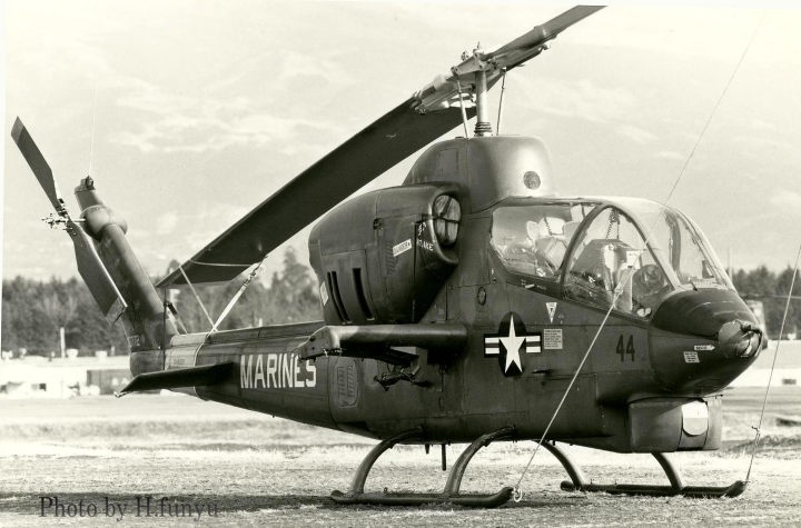 1978年2月キャンプ・富士にて訓練を行ったHMM-262(Rein)のCH-46F・AH-1J。この時は所属部隊は不明ながら、同じHMM-262(Rein)でETのレターを付けたCH-53Dも飛来しており、各機 雪のかかる富士山をバックに盛んにフライト訓練を行った。特にCH-46Fの機首右手防弾版には、各機様々なオリジナルのアートが書き込まれ、富士を訪れたマニア諸氏を喜ばせている。