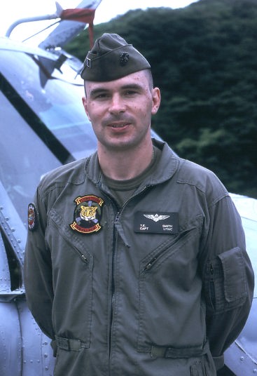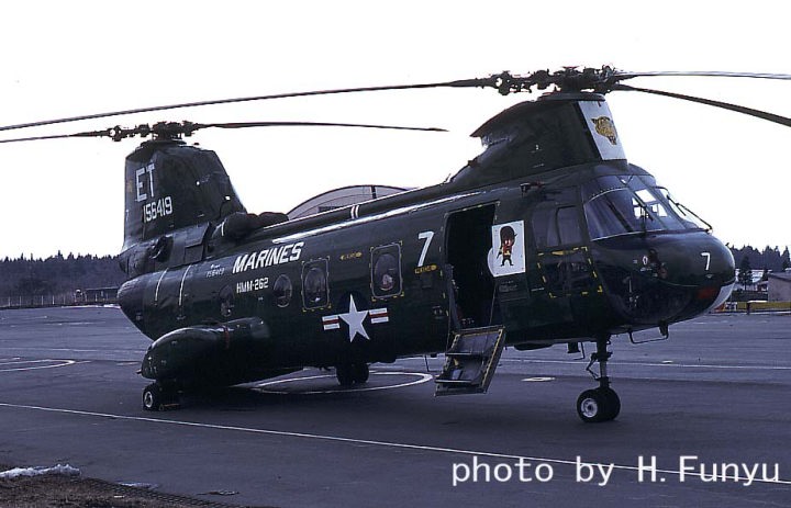 NAVY/MARINEのヘリ部隊の魅力は、その機体に部隊マーキングを始め、部隊にまつわる様々なペイントが施されている事だろう。以前はダークグリーンのボディーに部隊/機体ナンバーが白で、部隊マークは夫々のカラーでペイントされていたので実に鮮やかであった。最近は濃淡グレーとなったが、やはり魅力的な存在には変わらない。撮影できるチャンスが少ないせいもあり、私は戦闘機部隊よりこれらのヘリ部隊の方が、撮影出来た時の喜びが大きい。HMM-262もよく日本を訪れる部隊で撮影の機会は比較的多かったが、特に1978年2月彼らは大挙してCamp、Fujiに訪れ訓練を行ったので、多くのマニア.がキャンプ富士で彼らを撮影する事が出来た。私は沖縄遠征中でかれらを撮り逃がし、この事が今でも悔やまれる。海兵隊のヘリ部隊が、強襲揚陸艦に搭載されて作戦遂行する際は、大型ヘリ/中型ヘリ/攻撃・軽ヘリコプター/ハリアー等のV/STOL機とチーム編成するが、この時海兵隊中型ヘリコプター飛行隊(HMM)が基幹部隊となるのだ。従って全てHMM部隊のテールレターに統一される。HMM-262は”ET"の為、彼らと同じ強襲揚陸艦で行動すれば、CH-53やAV-8Bハリヤーまで全部隊が、全て”ET”のレターを入れている訳である。