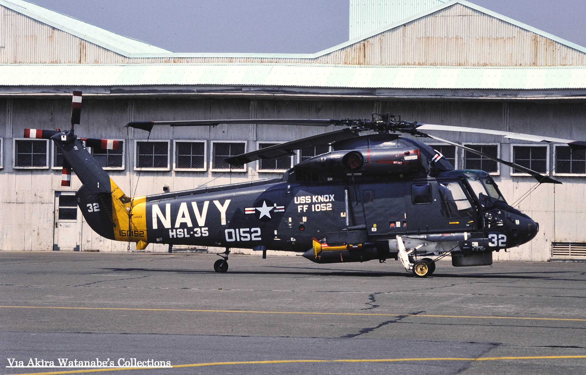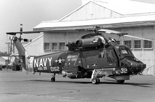 アメリカ海軍フリゲートの中で大量に発注されたノックス級の一番艦FF-1052ノックスに搭載されていたSH-2F(150152)、厚木基地のOHで珍しくフライト・デモンストレーションを行った機体である。胴体の上部に艦名が書かれていたのは、この時代珍しかった。テール・レターが入っていないが ”TG”である。
