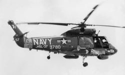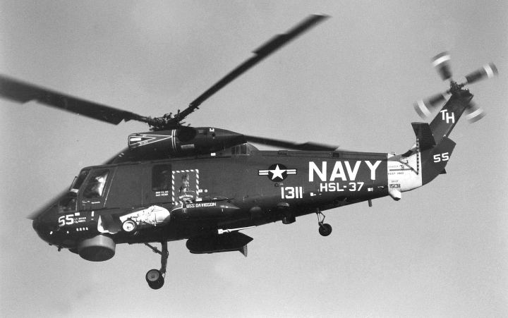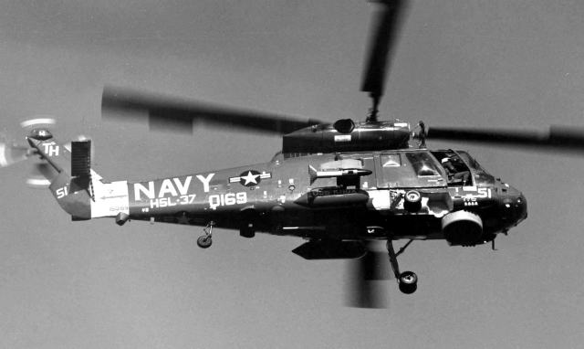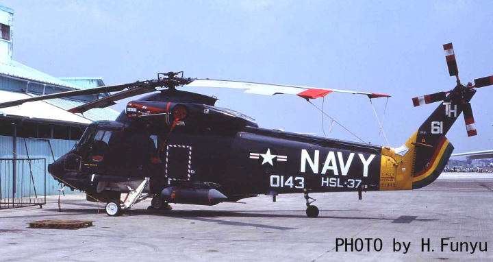 LAMPS計画・・アラジンの魔法のランプではない。”Light Airborne Mulch Purpose System”の略で つまり小型のフリゲートにでも搭載可能なヘリに、ASW(対潜)から対艦攻撃 救難 輸送にいたる様々な役割を持たそうという当時ではかなり欲張りな計画だった。今ではどんな電子機器でも小型化され車にでも搭載できるが、1970年代ではこれだけの事を1機のヘリに負わせることは中々難しい事だったのだ。そこで 長期の海軍1大プロジェクトとしてMk-T.、Mk-U、Mk-Vと発展させてきた。最終形はSH-60Fである。H-2ヘリは、陸軍で言うとUH-1イロコイスのような多目的ヘリであった。エンジンを2つにして もっと多目的の”何でも屋”に仕立て上げたのが、SH-2D〜SH-2FでLAMPS Mk-Tと位置づけられ1971年から各フリゲートに配備が始まった。SH-2Fシースプライトは、小さな機体にレーダー、ソノブイ、MAD、魚雷、増装タンク、救難用ホイストなど可哀想なくらい組み込んで しかも艦隊とのデータリンク機能も持っていた。
