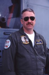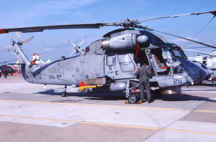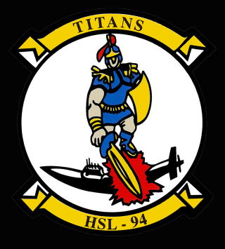 「Titans」・・タイタンと言うとギリシャ神話に出てくる巨人神、ギリシャ神話には4つの巨人族が登場するが そのひとつで どうもモデルはアフリカの黒人をイメージした黒巨人であった。この名前は、太陽系で一番大きい土星の惑星やICBMにも付けらているので よく聞く。HSL-94のインシグニアは正に甲冑を着けた巨人タイタンが剣の一太刀で潜水艦を断ち切るデザインである。1985年10月に予備役部隊として ペンシルバニア州のウィロ・グローブ海軍航空基地で創設された。カマン社のSH-2Gシースプライトの配備を受け 対潜、救助、捜索、補給などの任務を主として来た。しかし 2001予算で 大西洋と太平洋にあったSH-2Gの最後の飛行隊は閉鎖となり姿を消した。(2006年5月 記)