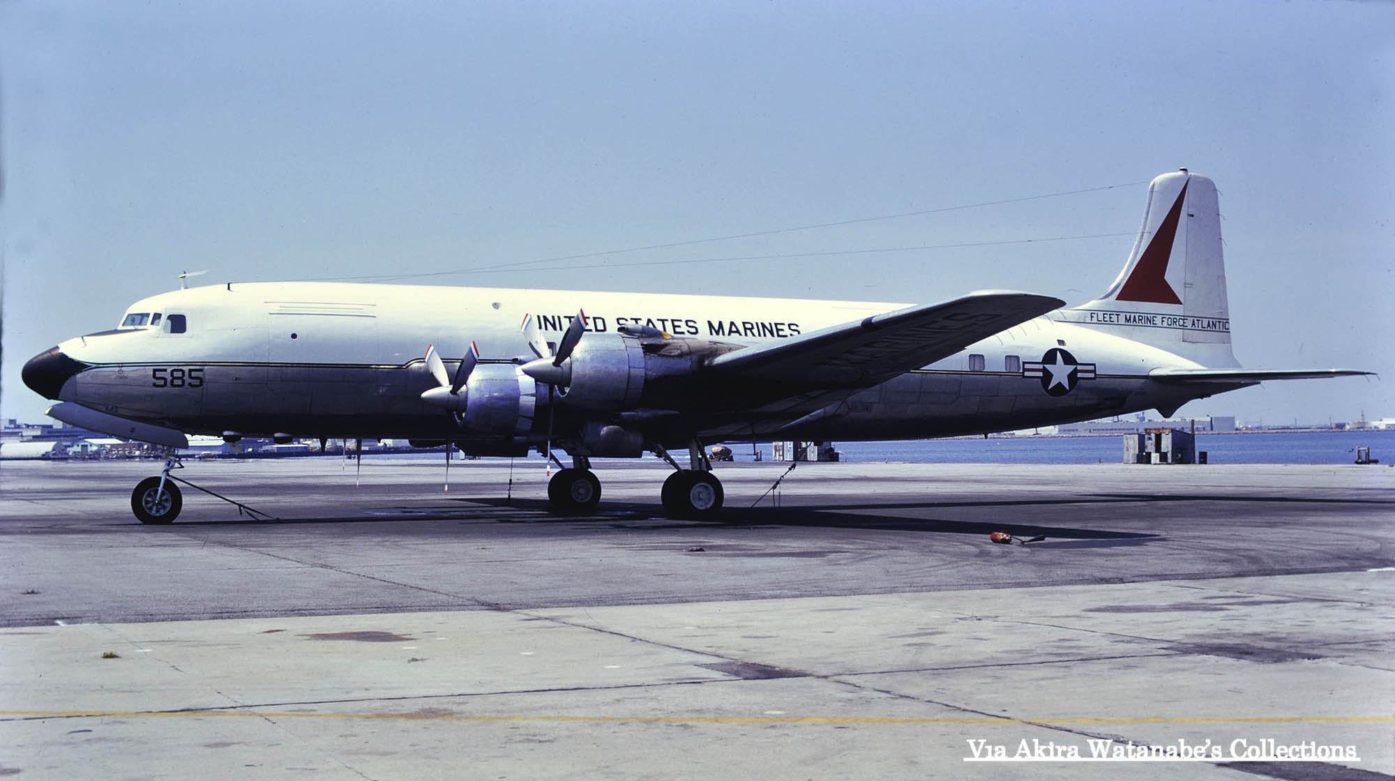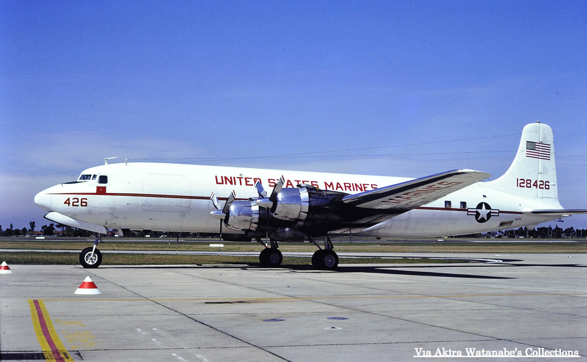 ↑ 厚木のマニア間でも海兵隊の”赤いC-118”と言われ、1970年代末、来日する珍機の一つであったVC-118Bリフトマスター/Bu.No.128426。この機体と同形で塗装も同じVC-118Bリフトマスター/Bu.No.128427の2機が存在した。上の写真VC-118Bリフトマスター/Bu.No.128426は、1980年事故で失われたが、VC-118B/Bu.No.128427は、現役引退後は、暫くMCASチェリーポイントで展示されていたようである。しかし、どうやらその後老朽化により解体された模様。またVC-118B/Bu.No.128427は、海兵隊で運用される前は、VR-21に所属して”RZ”のテールレターを付けており、当時の太平洋艦隊司令官用のVIP機だった。