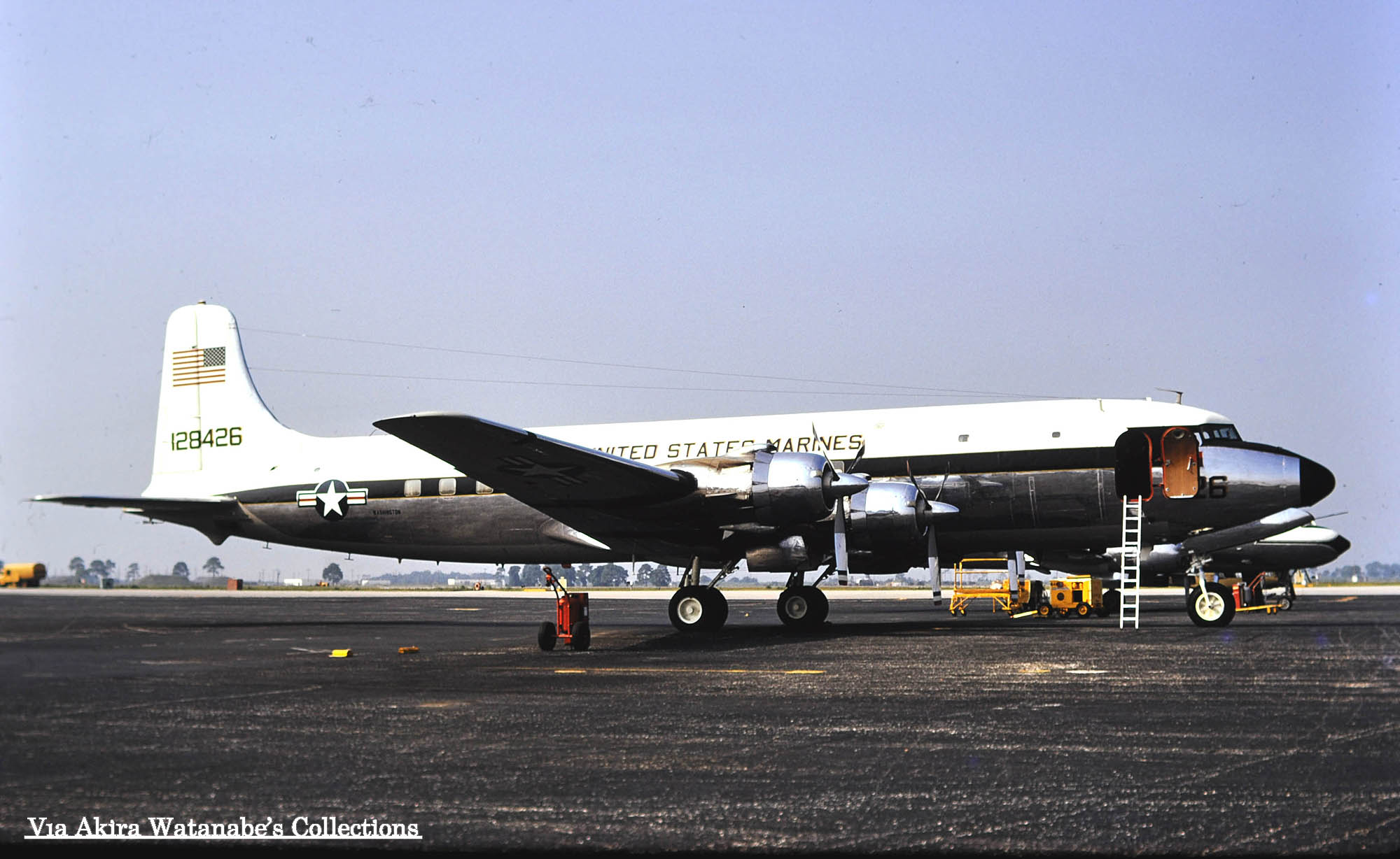 ↑ 赤く塗られる前のVC-118B/Bu.No.128426、1952年製造の機体である。最後は1980年1月にまでサンフランシスコの傍にあるアラメダ海軍航空基地で事故で失われているが、それまでの間NAFワシントンを拠点にVIP輸送に使われた。所属はUSMCHQとなっており、海兵隊司令部直属の機体だったらしい。