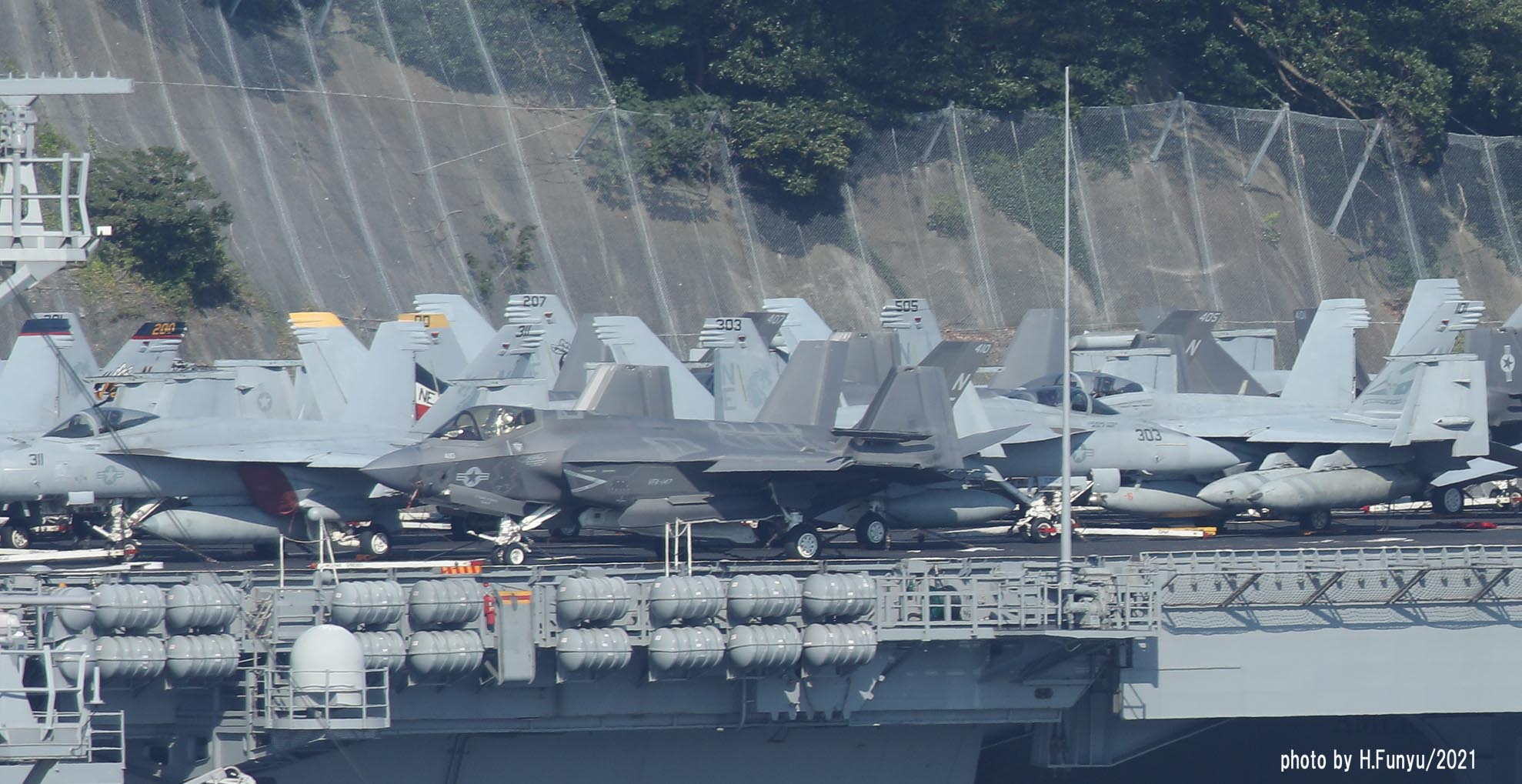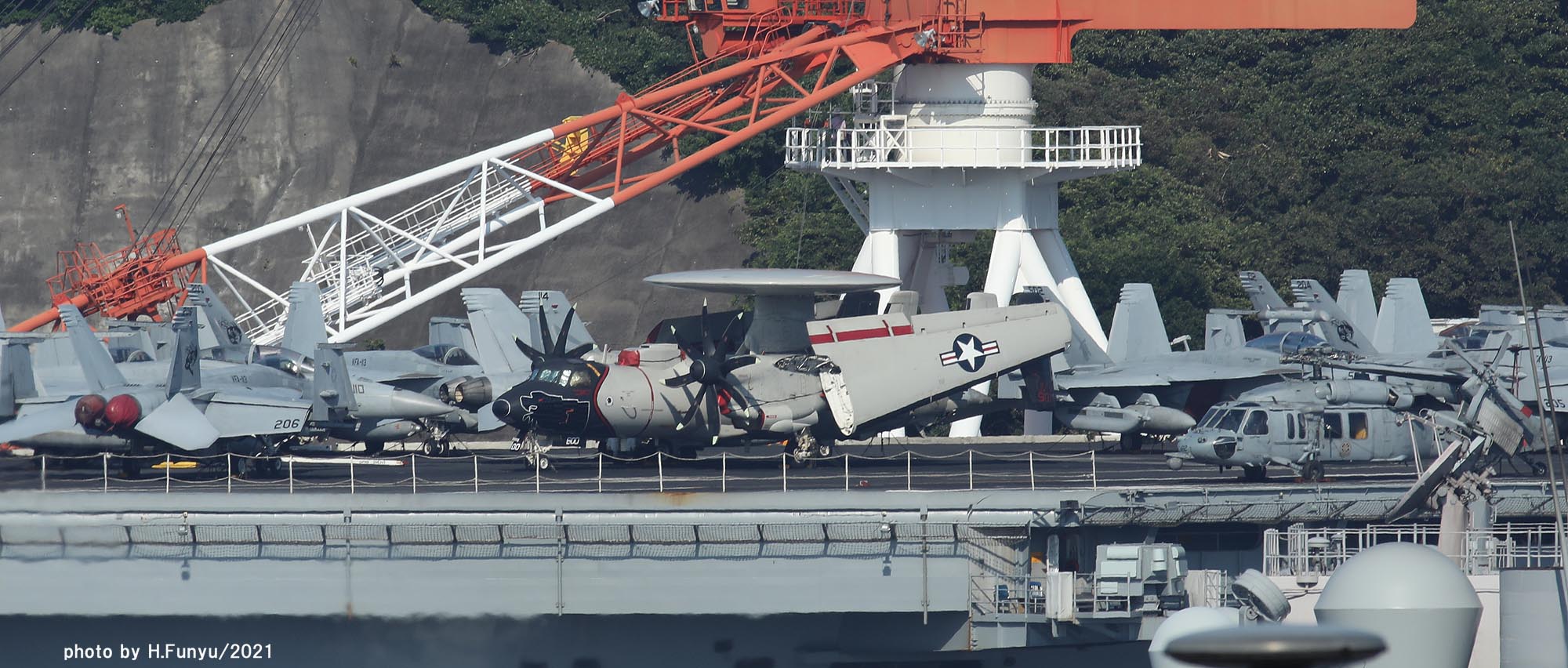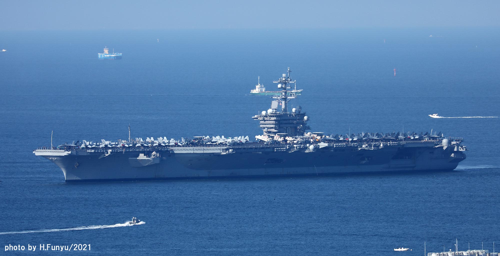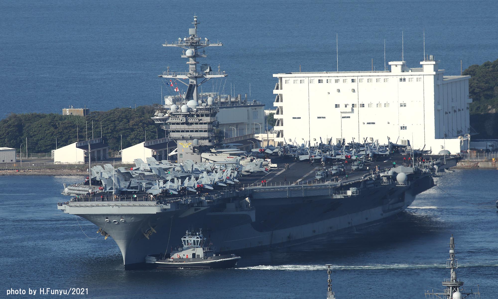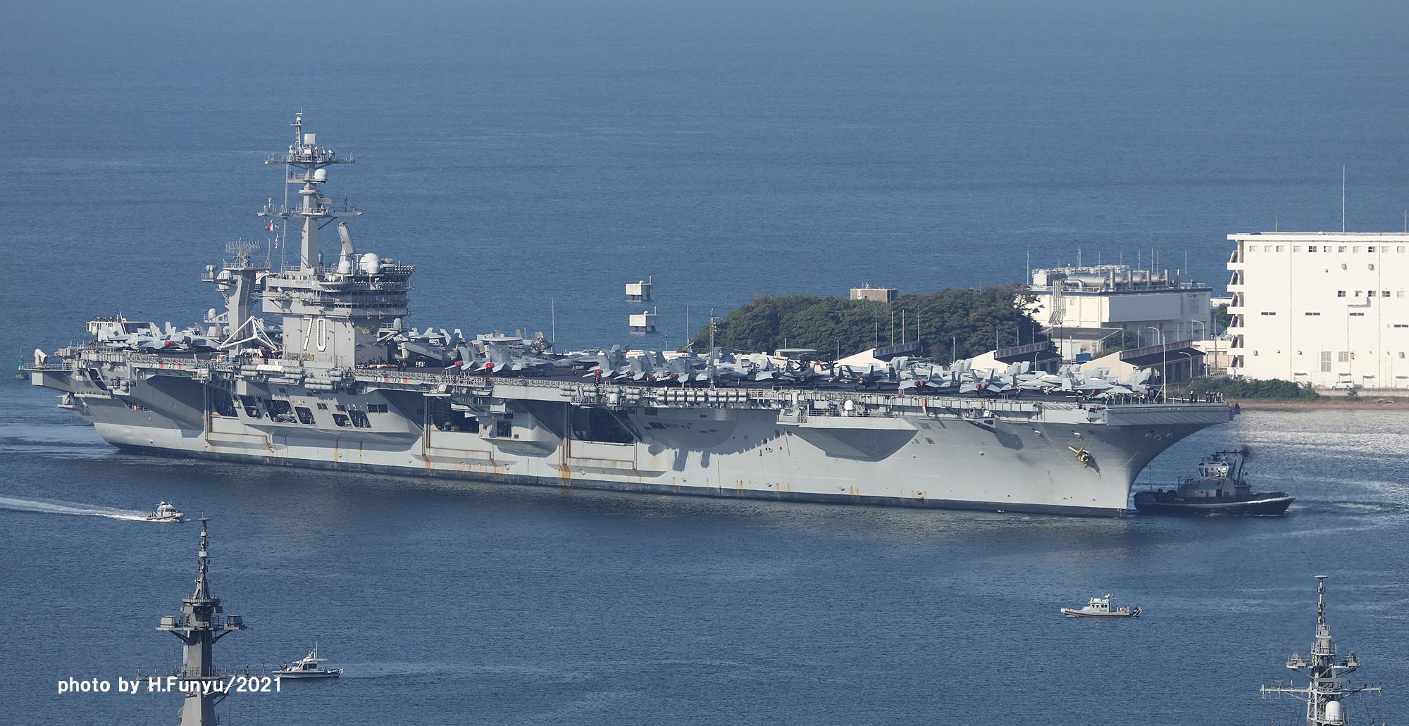 2隻のタグボートが、入港を支援しているが、空母の回頭では、艦首側一隻の力で充分な様子で、最近のタグボートは相当な力持ちである。甲板は、FA-18E/F/G系の機体であふれており、形が異なる機種は、E-2DとMH-60ぐらいで、昔のように5種~6種もの多彩な機体を積んでいた時代よりも運用効率は相当向上しているはずである。