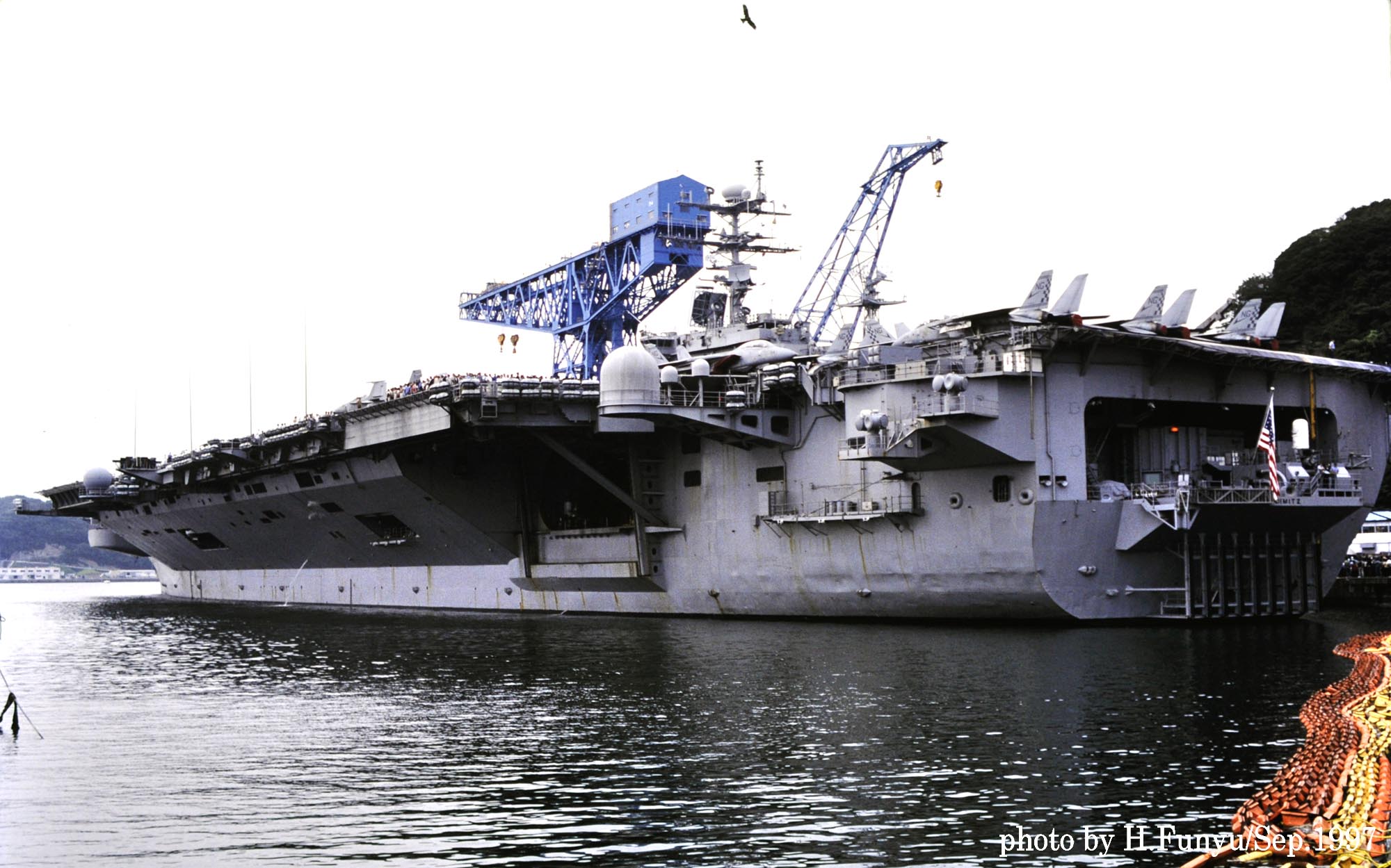 1968年に建造が開始され、1975年5月に就役している。就役当時の大統領はジェラルド.フォード大統領で彼の名前は、その次の世代の新型空母に付けられている。1996年台湾の総統選挙に圧力をかける為に中国軍が画策して発生した台湾海峡危機の際に、同海域で空母インディペンデンスとともに駆けつけ中国人民解放軍の動きを牽制して、その意図を阻止した事で有名である。その翌年の1997年9月1日 神奈川県の横須賀港に寄港し一般公開も行われた。下の写真はその時フニュ君が撮影した貴重なショットである。