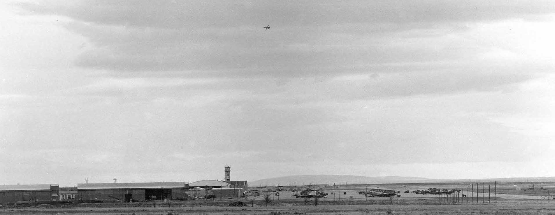 上述した丘から撮影したマウンテンホーム空軍基地の一部。写真左手には基地の主要施設が建ち並んでいた。上空に今帰ってきた1機のF-111が、旋回しているのがお分かりになるか。