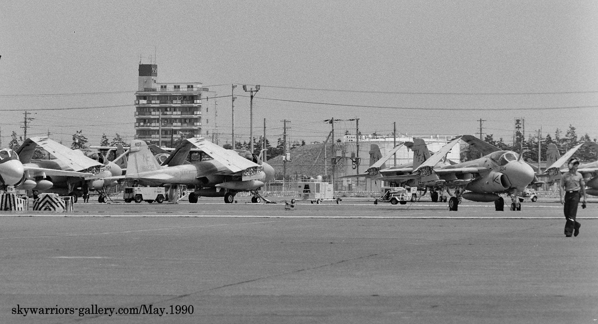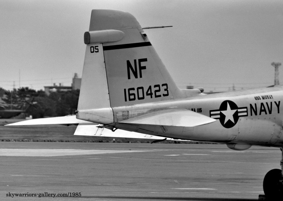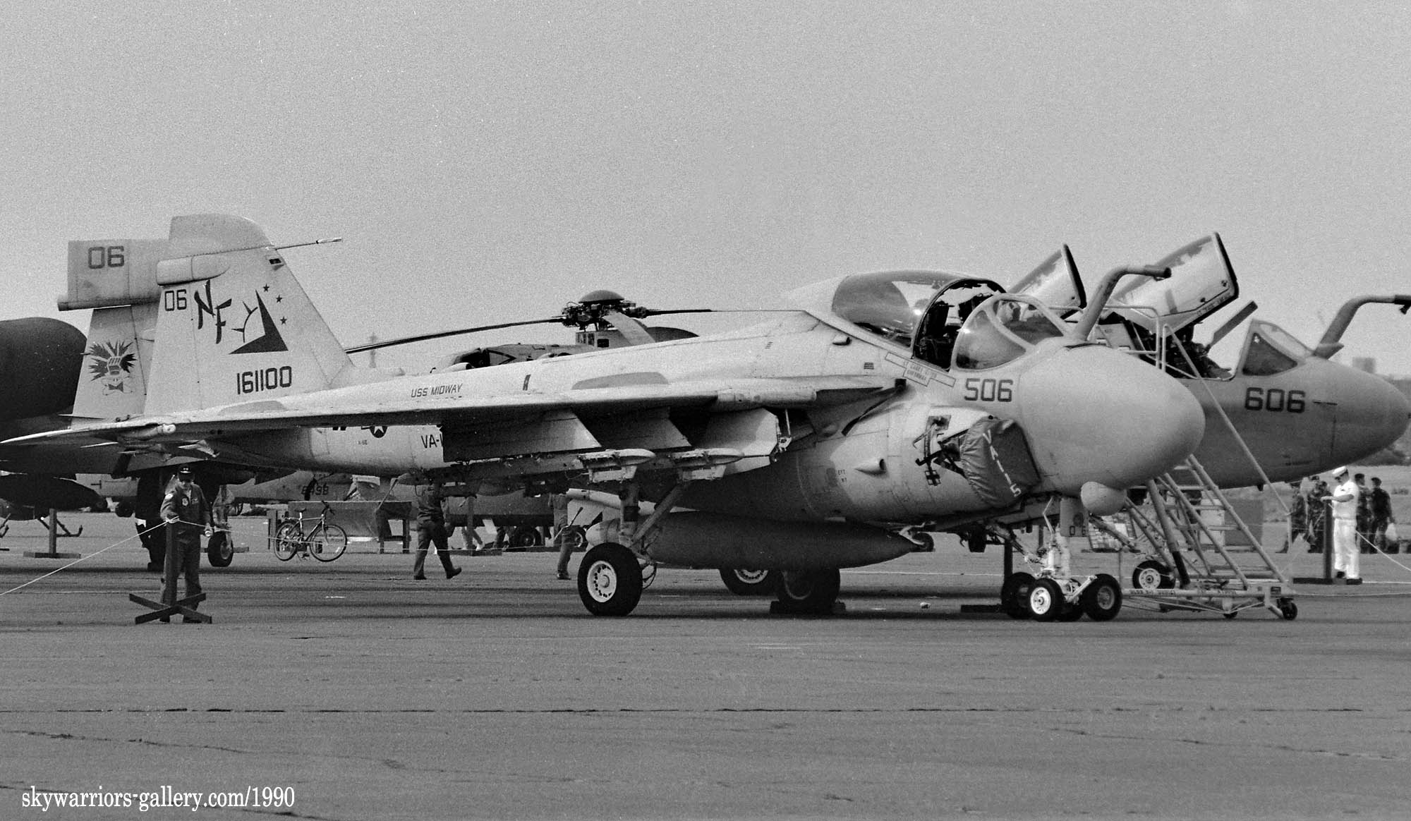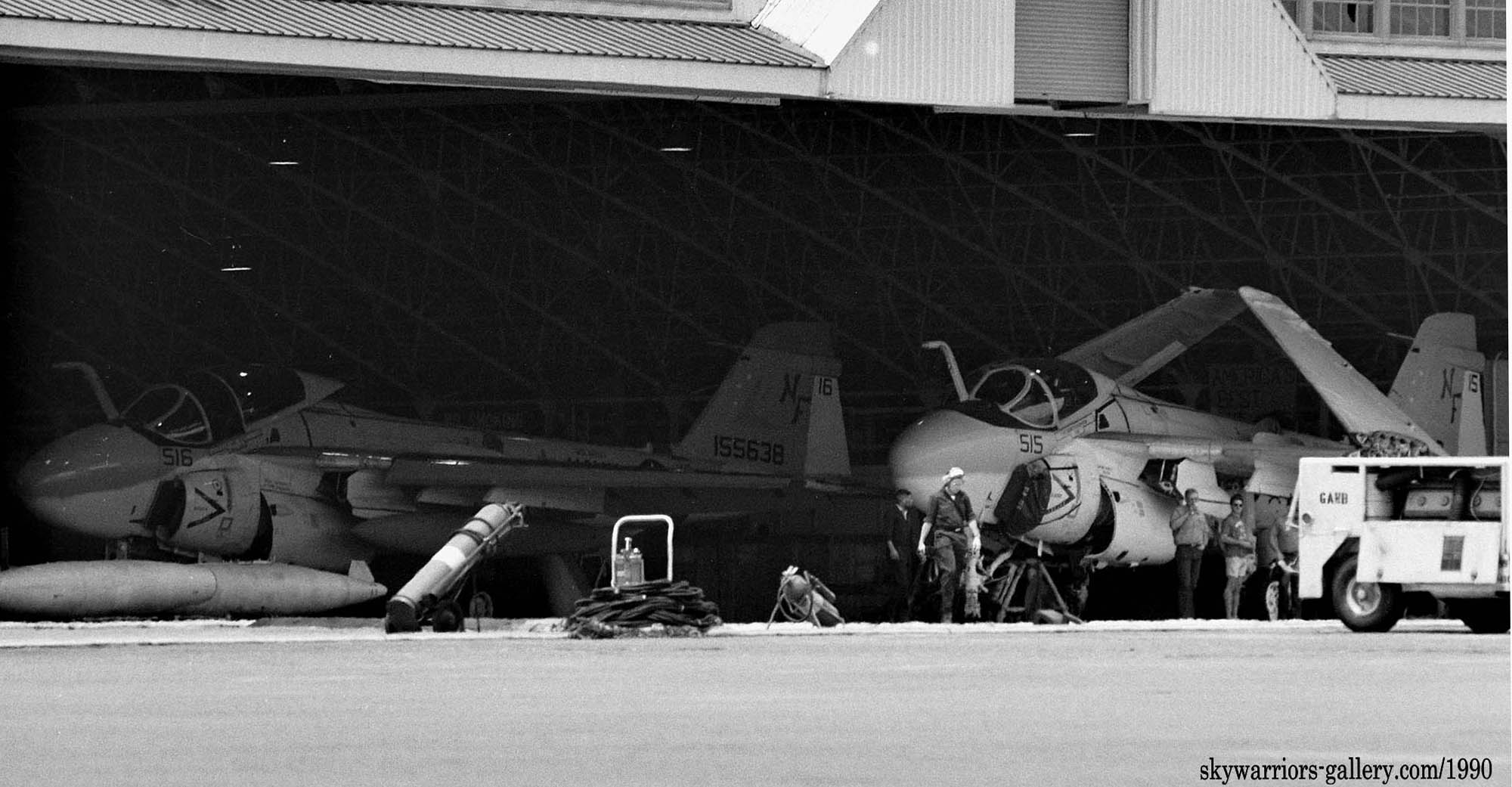 ↑ 1990年5月20日に開催された厚木基地航空祭でのVA-115の駐機エリア。展示機は、NF-506/Bu.No.161100が出展されている。格納庫内にあったNF-515/516以外は、ほぼグレーの濃淡を使ったロービジ塗装で統一されている。