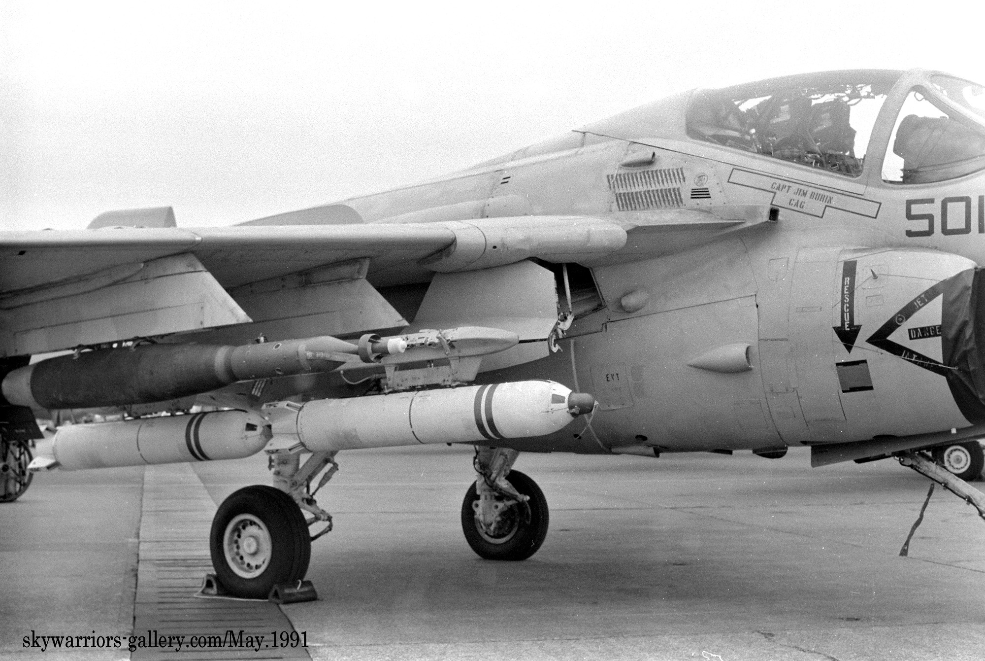 ↑ イラク軍のクウェート侵攻から始まった湾岸戦争に参加し、帰還した機体は出撃マークを付けて展示された。NF-501は、レーザー誘導爆弾とロックアイ クラスター爆弾を懸架した形で展示。艦名”USS