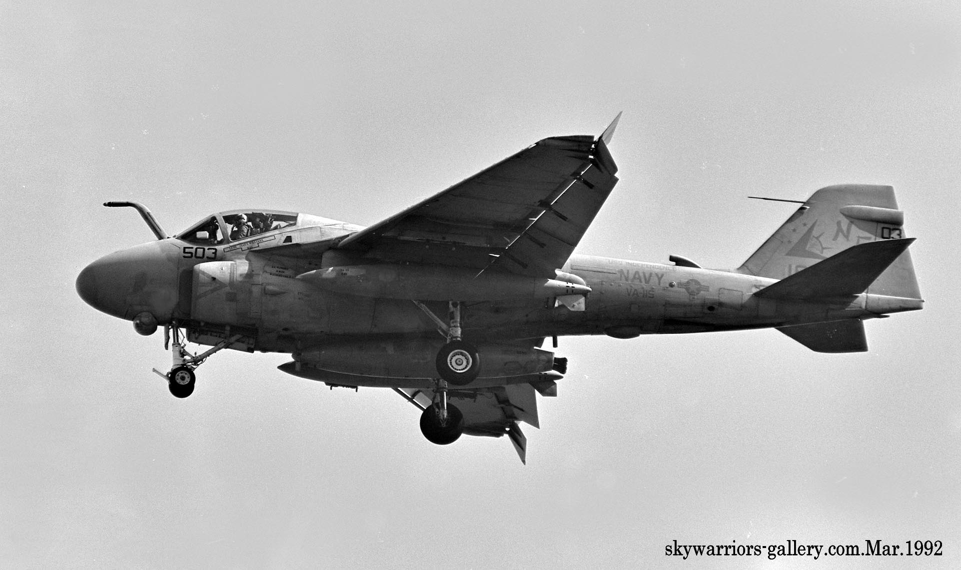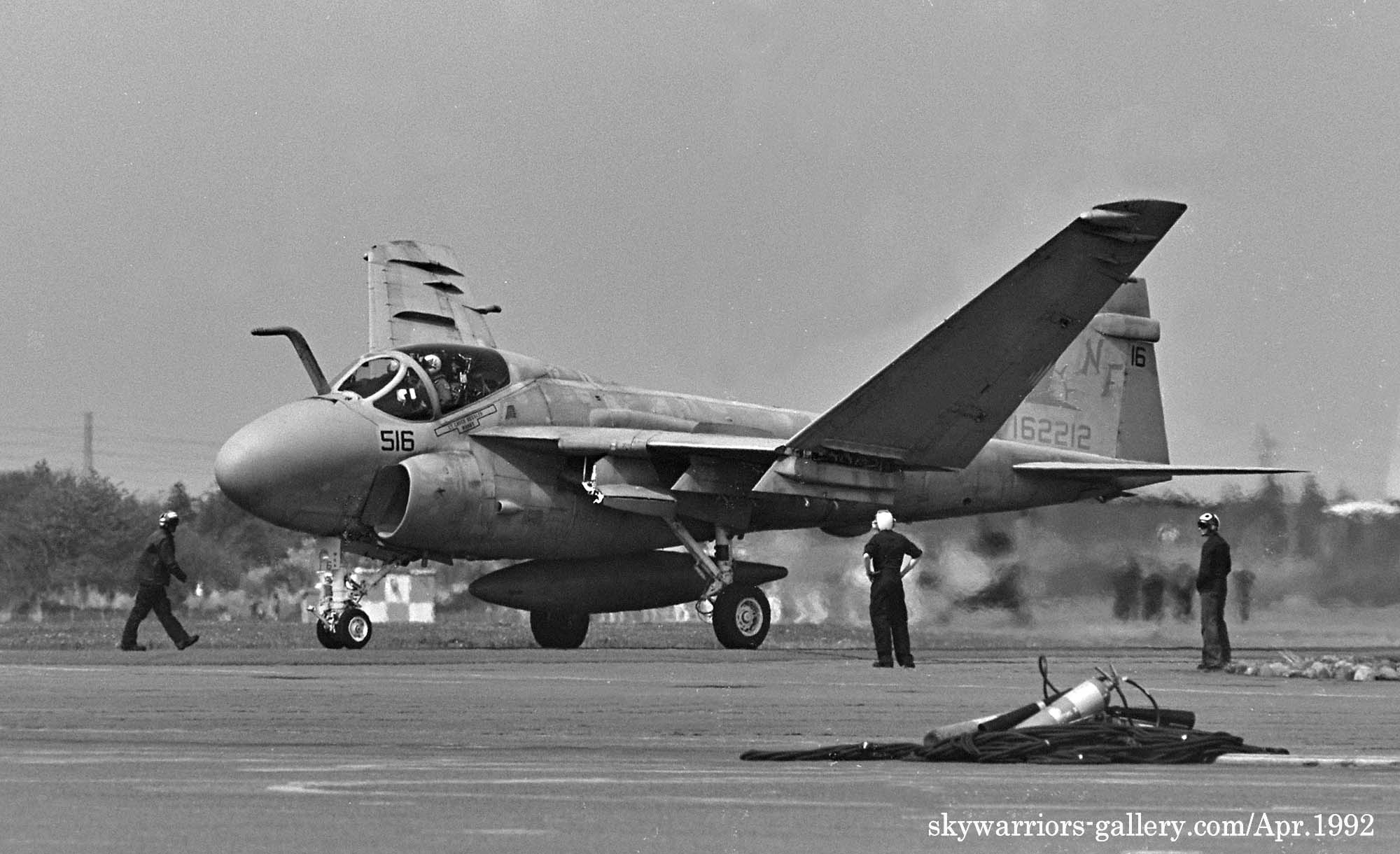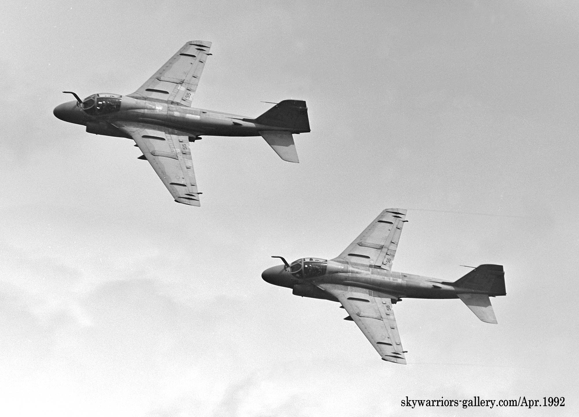 ↑ 1992年4月12日に開催されたWing-92にて展示飛行するVA-115のA-6E(NF-515/516)。