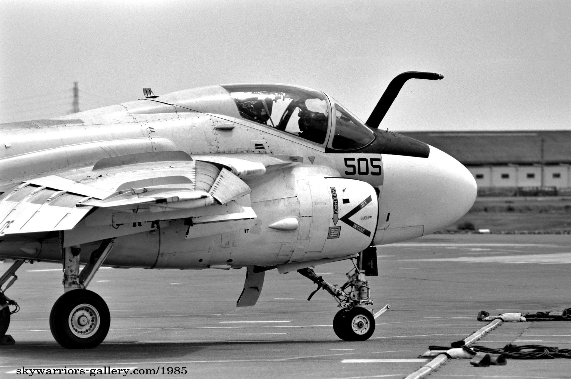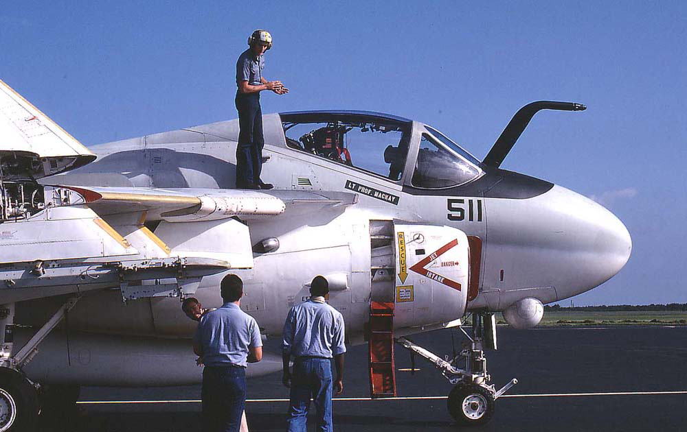 三沢を訪れたVA-115のA-6E(NF-511)、機首の様子がよく分かる。大型の機首レーダーがAN/APG-148。左側がパイロット席で右は航法士(ASO)、機首の下に丸い球形のものが TRAMで後期A-6Eにはほとんど追加装備された。エンジンの吸気口が前車輪のすぐ真上にあるため 空母での発艦作業の際 スチームカタパルトに前脚をセットする作業で 作業スタッフがエンジンに吸い込まれる事故が時々起きた。