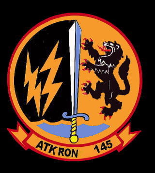 ”Swors Men”剣士という名の攻撃飛行隊、1978年にUSSレンジャーに載って西太平洋航海に入った際,厚木および嘉手納に数機のA-6Eを下ろしたのでシャッターチャンスが訪れた。1950年創設の部隊でVA-145となったのは1953年。砂漠の嵐作戦の際、この飛行隊がA-6で初めてAGM-88対艦ミサイルハープーンを実戦で使用し大きな成果を挙げたことが記録されている。尾翼には剣と電光を書き込み、500番は剣の色をCAG色に塗り分けていた。ロービジ塗装になってから一時グリフォンだけを書き込んだ地味塗装になった時期もある。1993年部隊は解散した。