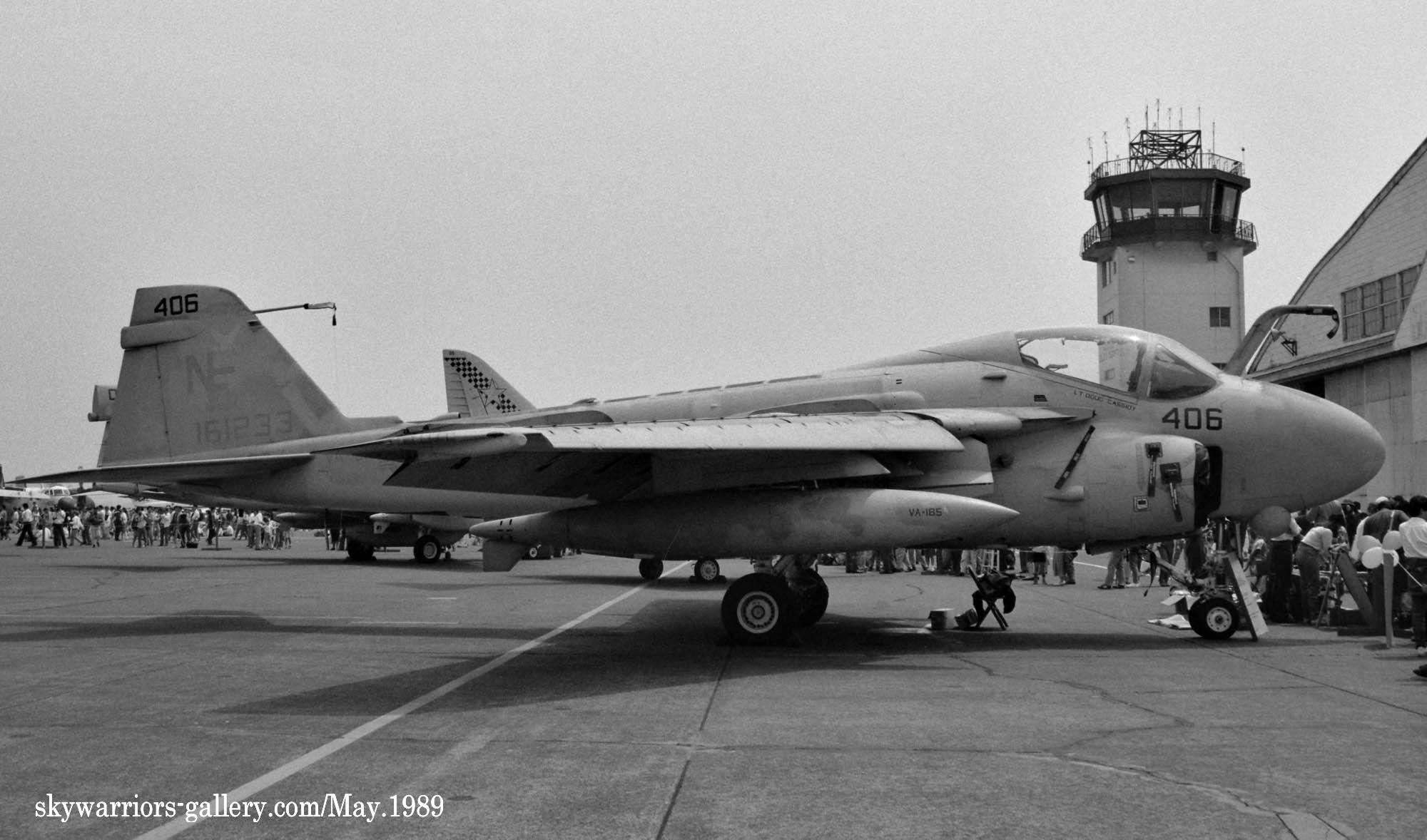 ↑ 1989年5月21日 厚木に展示されたVA-185のA-6E/Bu.No.161233。1988年に初めて展示されて以来2度目の展示である。