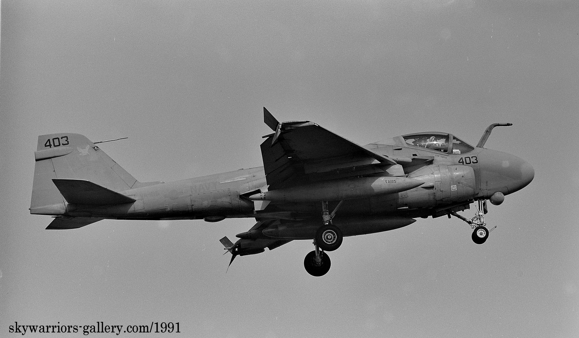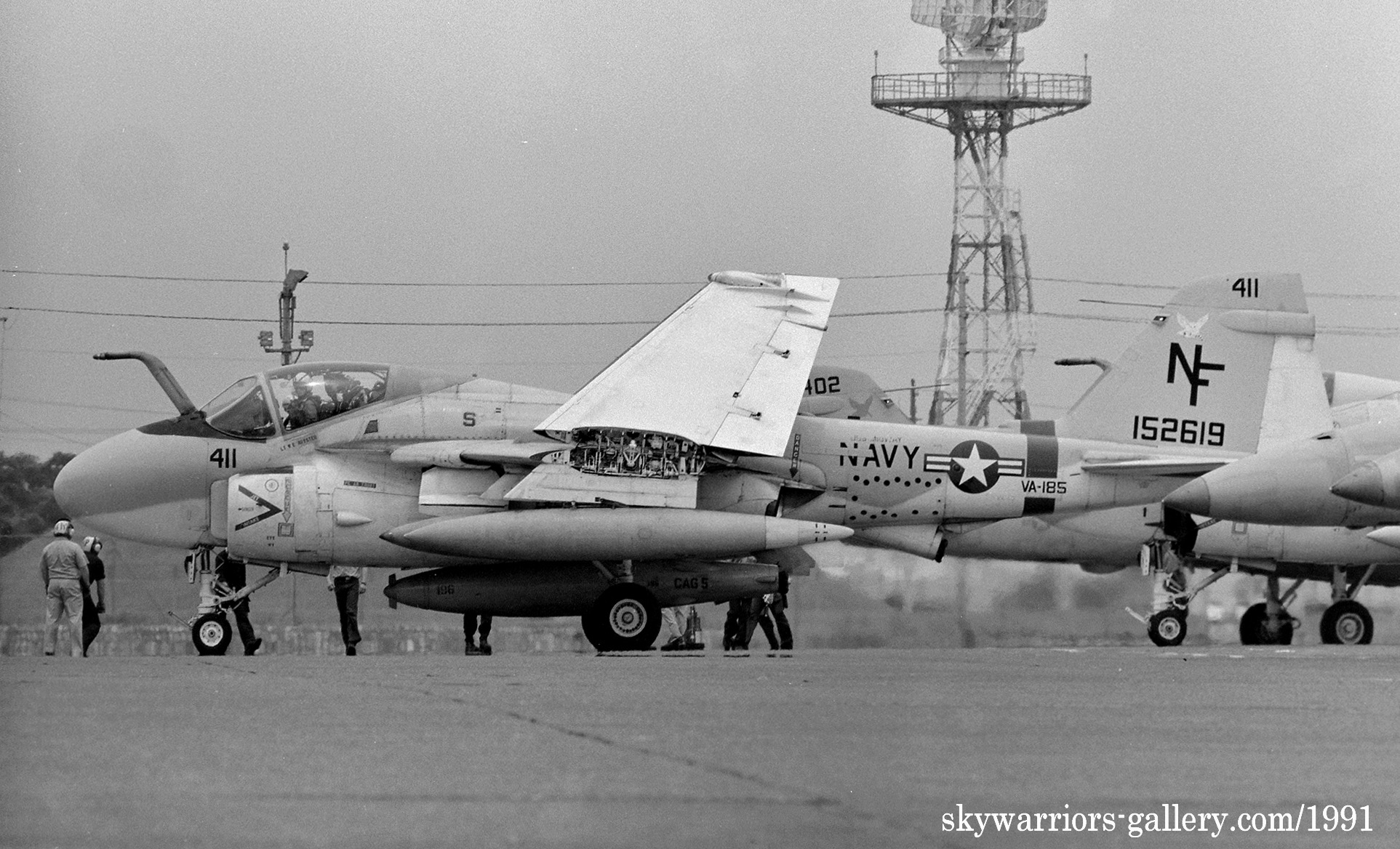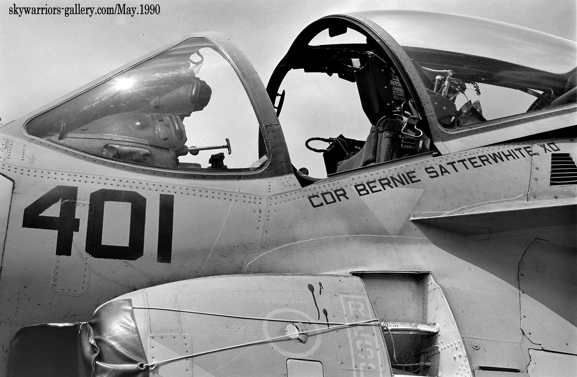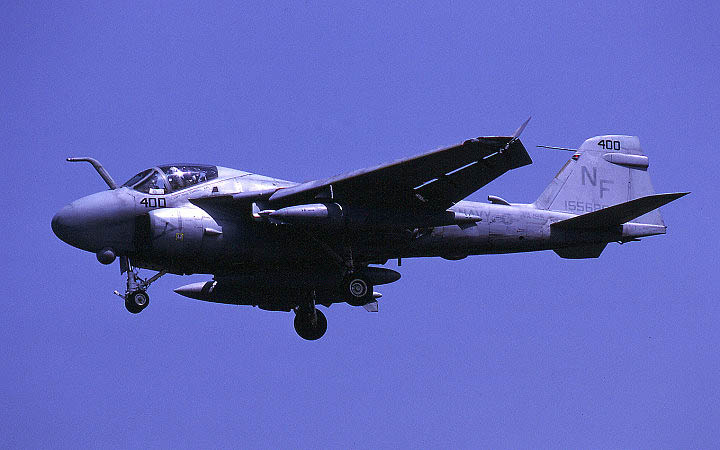 ↑ 1990年5月20日 厚木に展示されたVA-185のA-6E/NF-401,機首コックピットラインには飛行隊の副長(XO)バーニー・サッターホワイト中佐の名前が入っている。