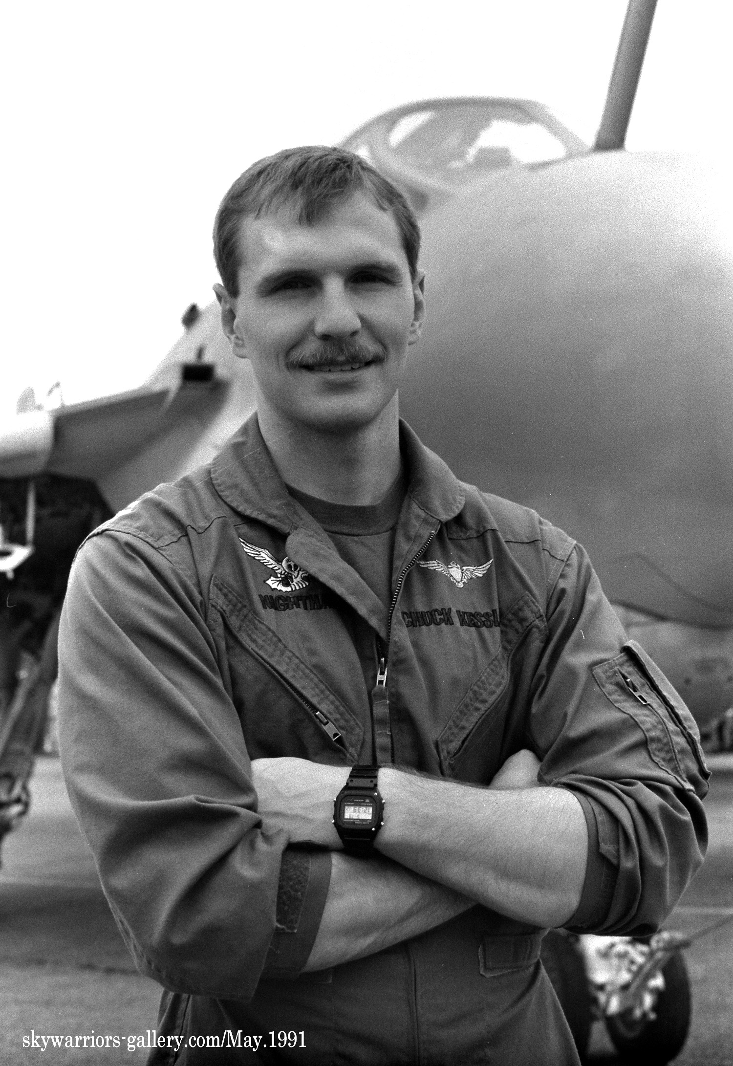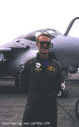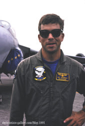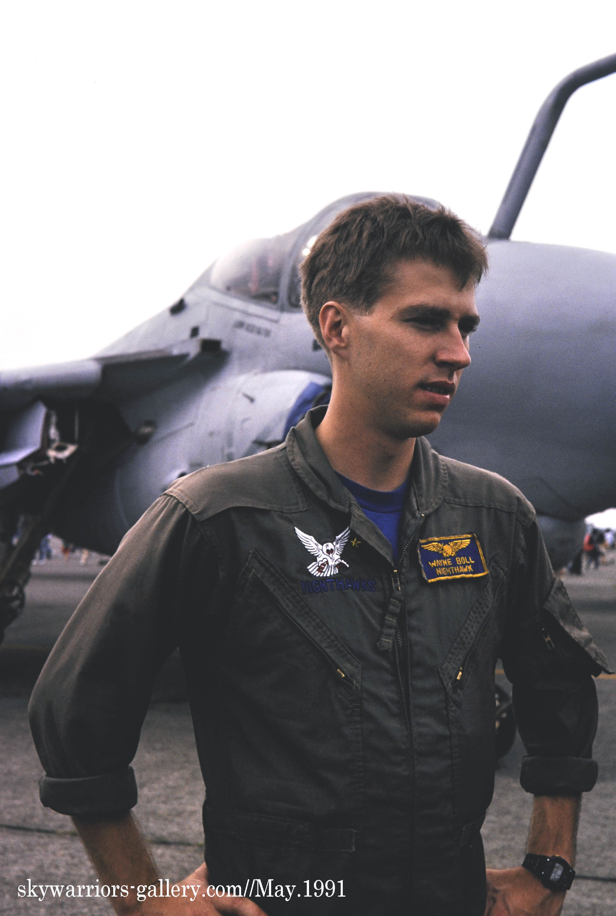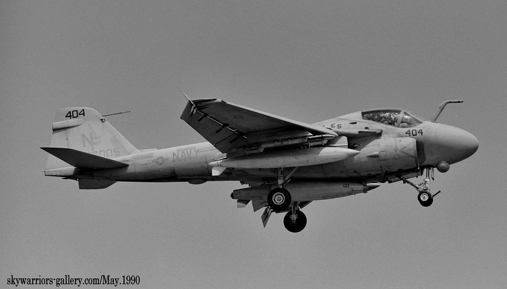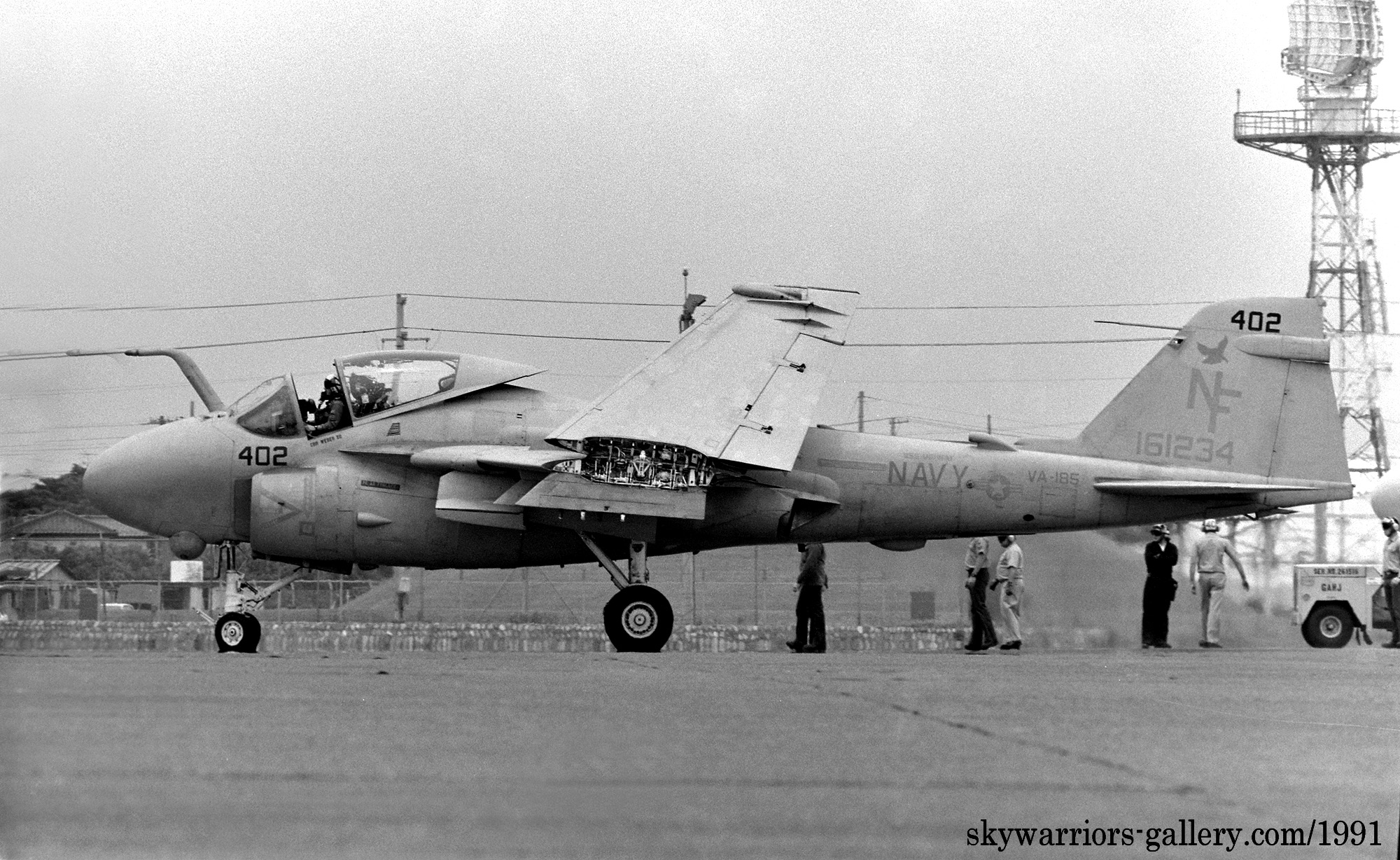 ↑ 1990年5月20日 厚木に展示されたVA-185のA-6E/NF-401,機首コックピットラインには飛行隊の副長(XO)バーニー・サッターホワイト中佐の名前が入っている。