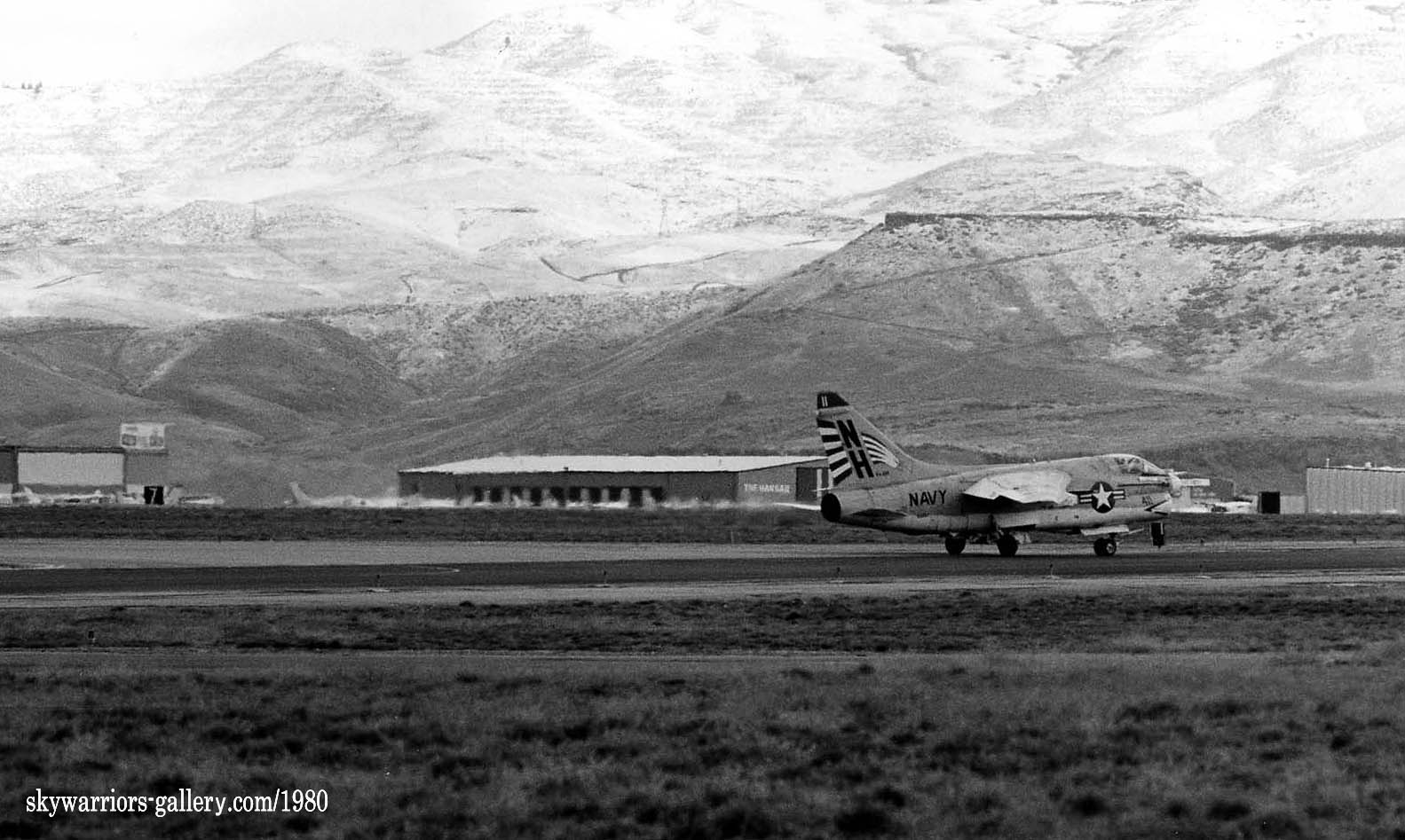アイダホ州ボイシー空港を離陸するVA-195のA-7E(NH-411)、2月のアイダホは、荒涼とした風景で灰色の世界である。我々は、RF-4Eを撮影しているさなか,1機のA-7Eが突然離陸して行くのに気が付いたが、すでに豆粒のように遠い光景だった。