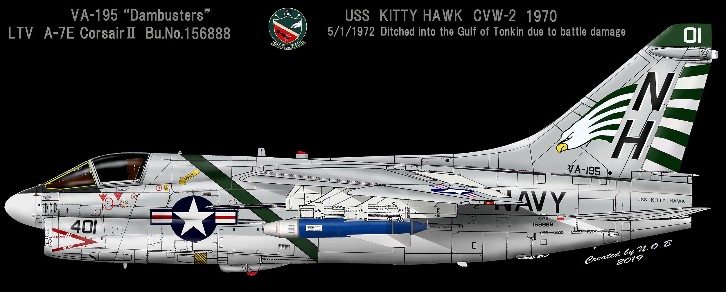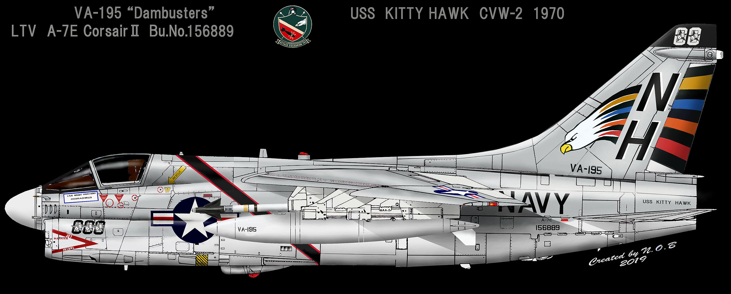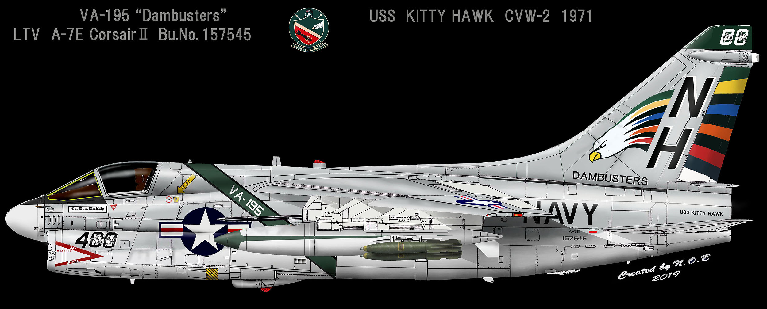 ”Dambusters”のネームから先ず連想するのは、元来大戦機に興味のあった私は、イギリスのランカスター爆撃機の改造機でドイツのダムを破壊した部隊の方である。VA-195ダムバスターズもご存知のとおり朝鮮戦争時のダム攻撃の功績が由来である。1951年5月1日AD-4スカイレーダーで北朝鮮に占領されていた華川ダム(フッチョンダム)を魚雷で破壊した事から ”ダムの破壊者”という部隊名となったもの。1969年にA-7を受領し、1985年にFA-18Aに転換、VFA-195と改称されたあと日本の厚木にCVW-5の一員として常駐した。