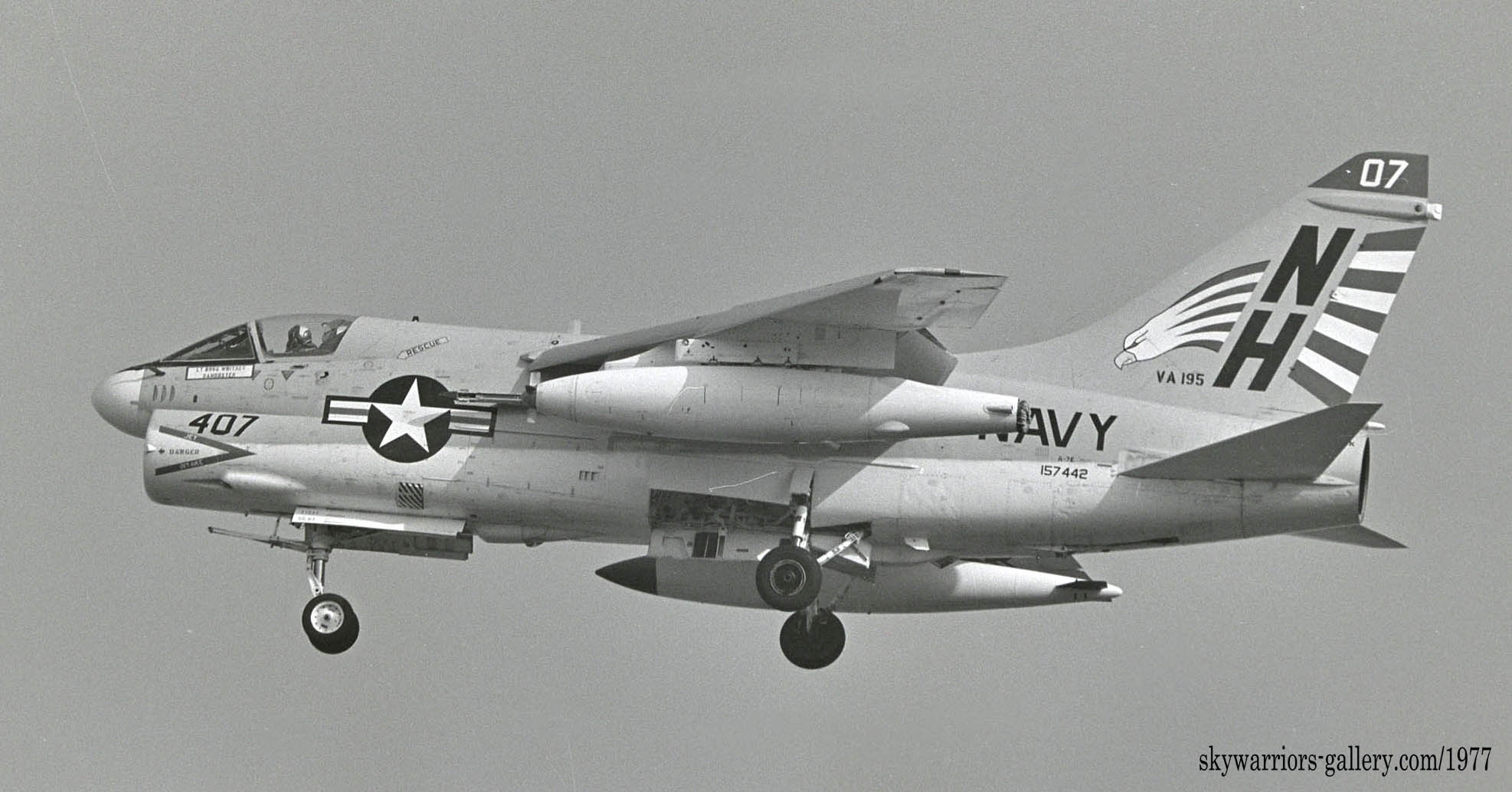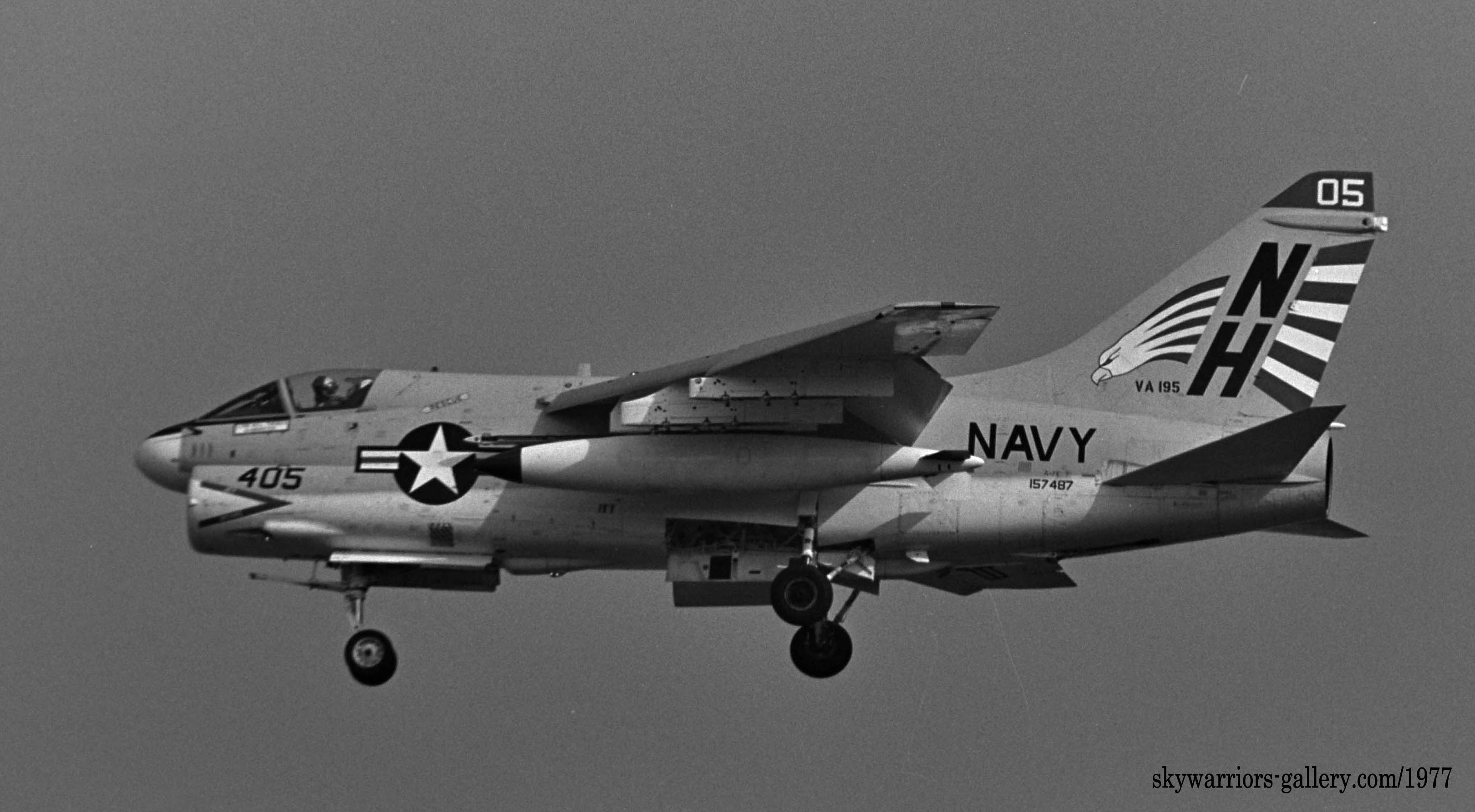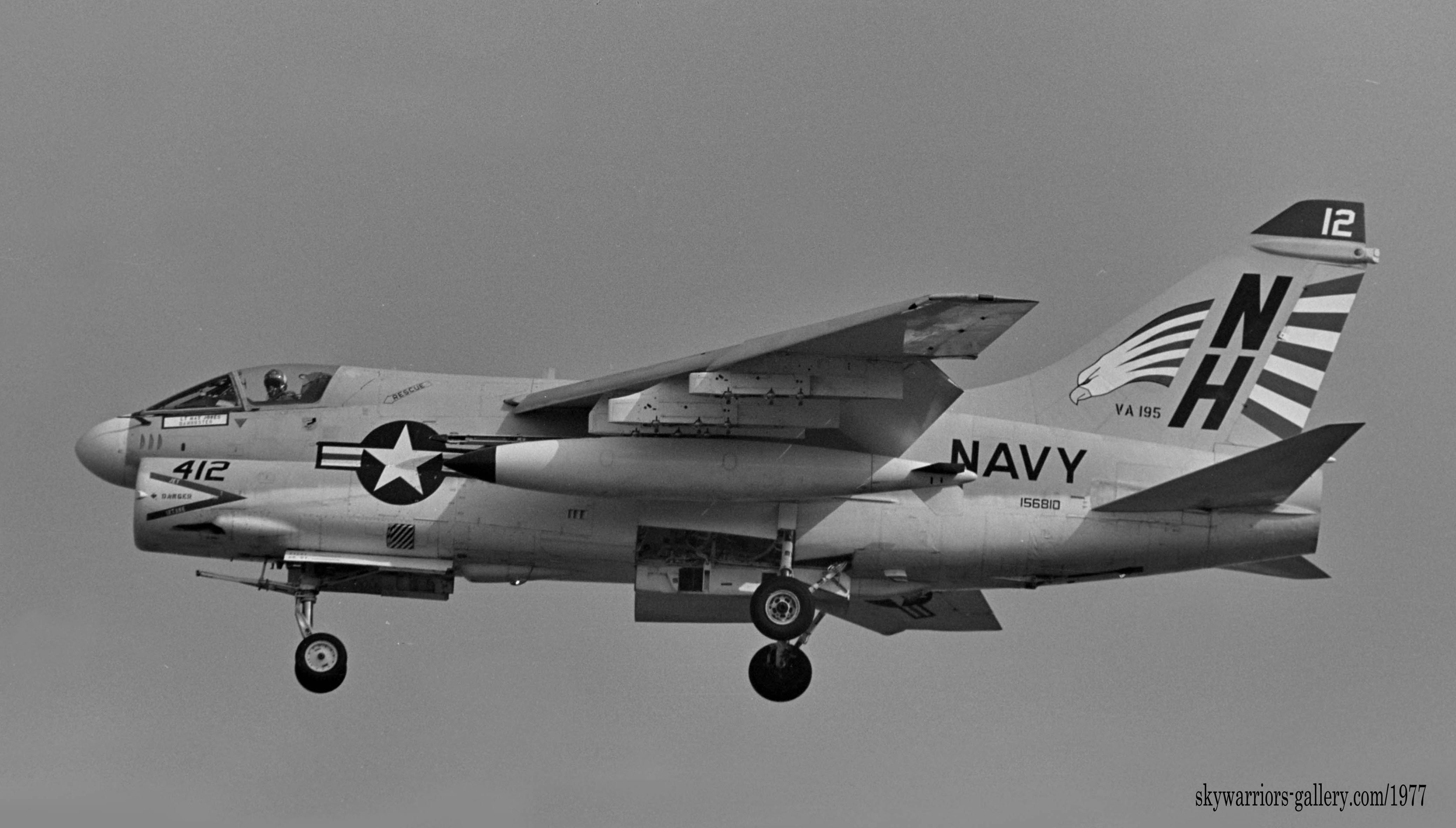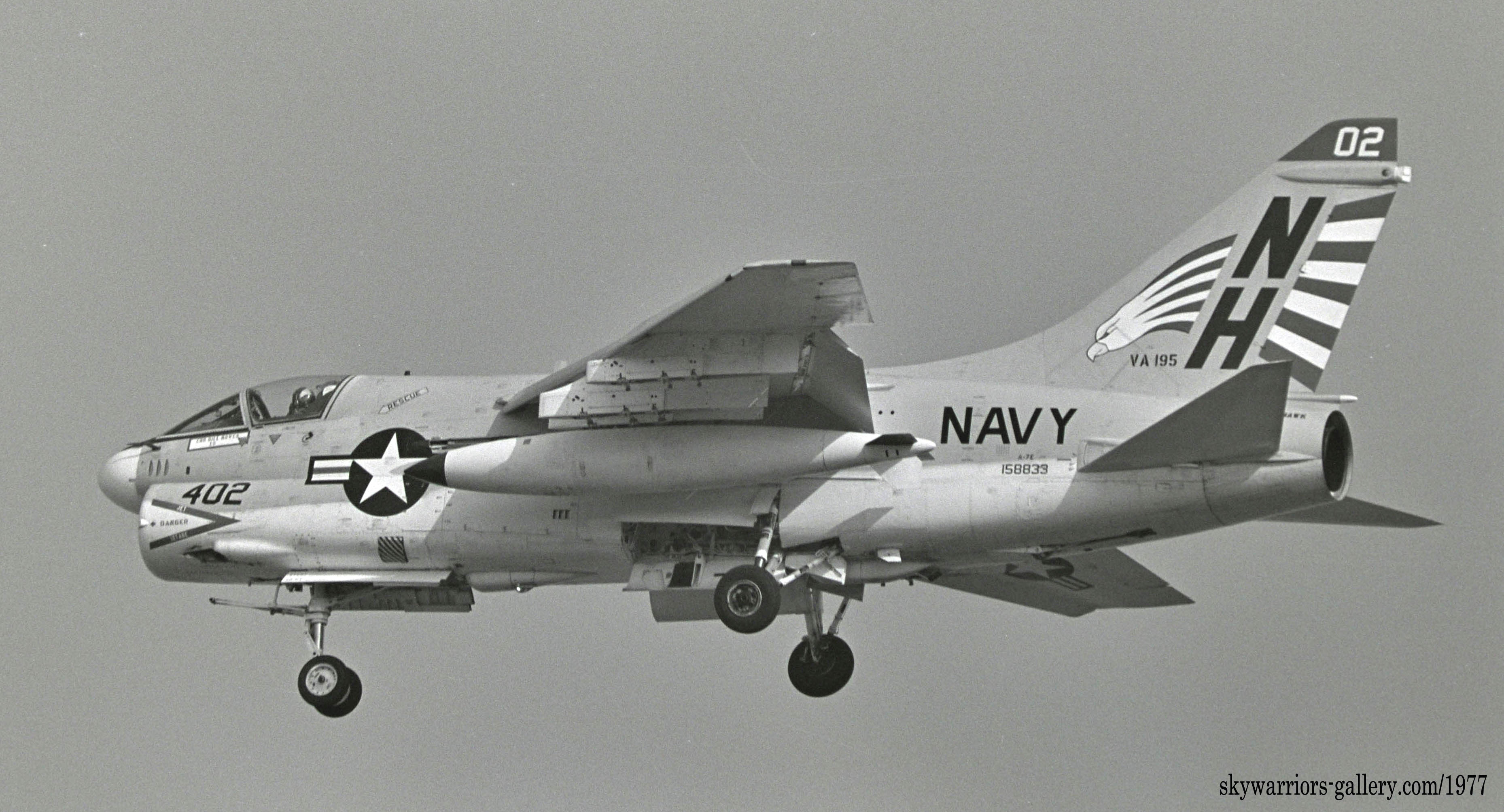 1977年 USSキティホークの横須賀入港と共に厚木基地に飛来したVA-195の数機のA-7e。尾翼に大きく書かれた鷲のマーキング!私にとってこの部隊との最初の対面だった。