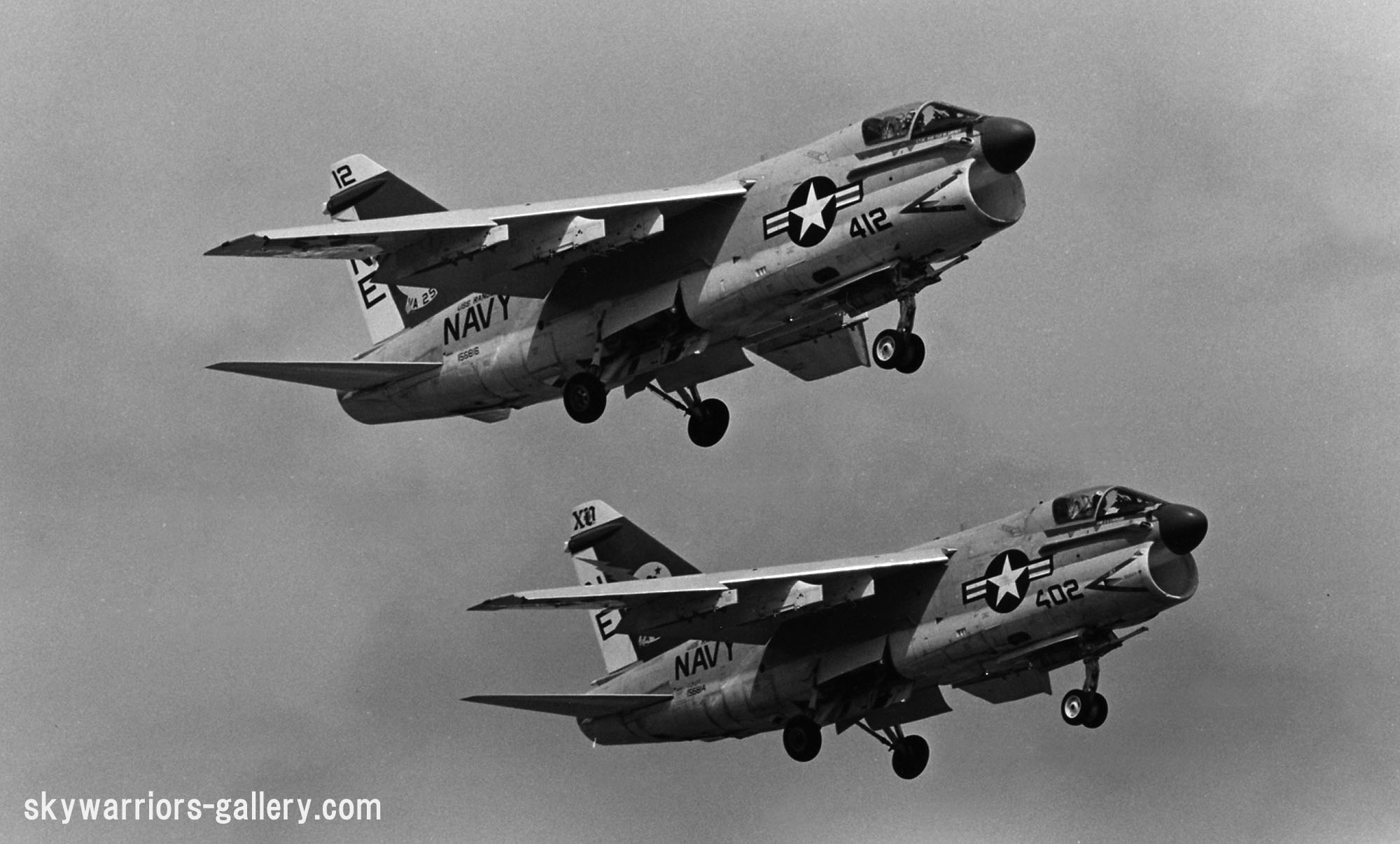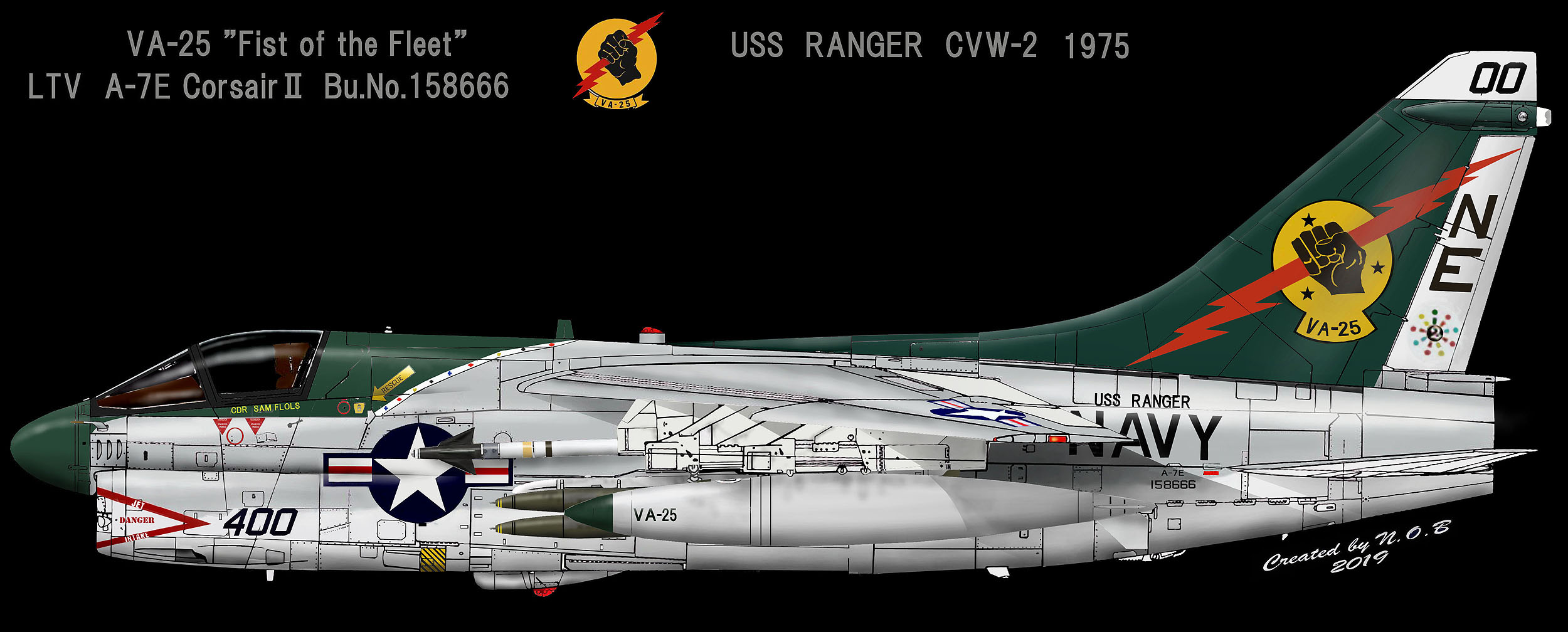 1972年当時のVA-25のマーキング、この時代は拳ではなくCVW-2の”NE”が書かれていた。1972年はVA-25にとって最後のベトナム戦参加となったが、ラインバッカーⅡの激しい戦闘を経験することになる。このマーキング時代の1970年と1972年の2回ベトナム戦に参加したが、1970年には1機が撃墜されている。本機は、400番の”00”は、ナットのデザインに換えてある。