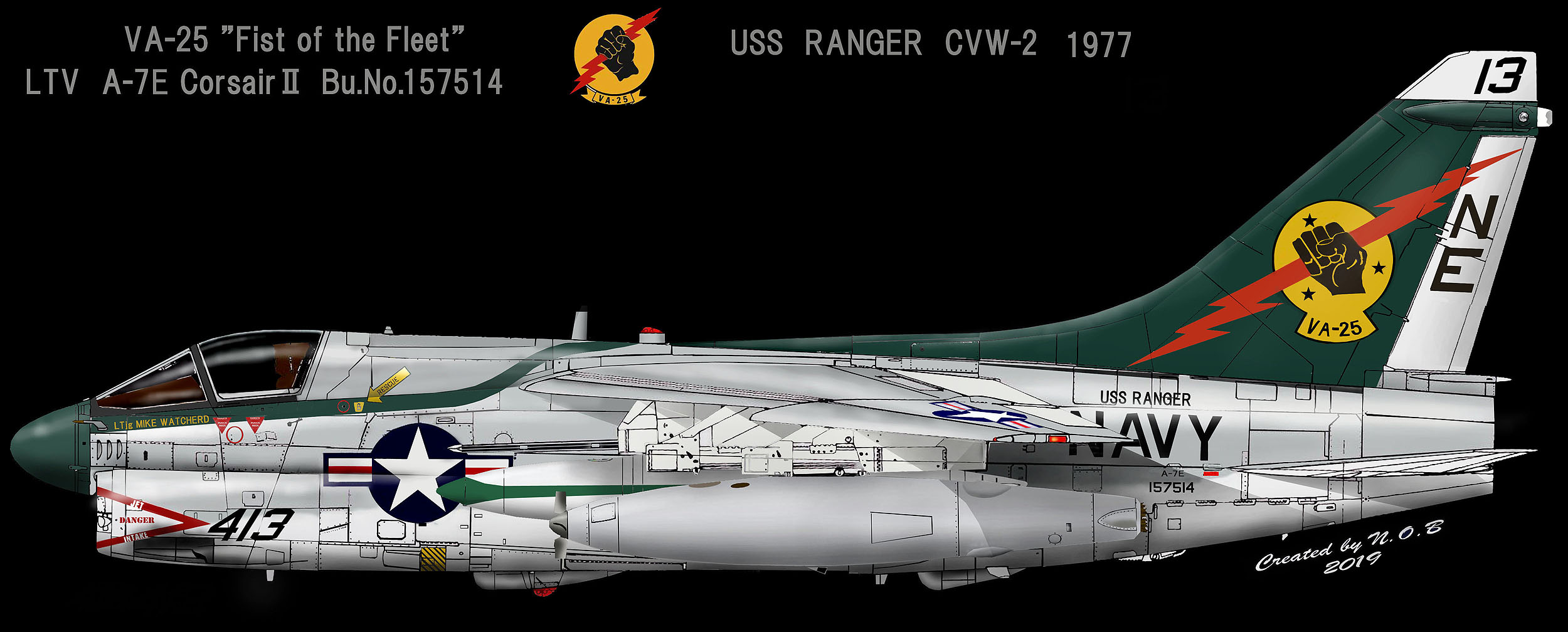 この部隊、レシプロのA-1スカイレーダーを装備していた時代から、この部隊マークを付けて有名だったのだ。スカイレーダーと言うレシプロ機から.突然最新の攻撃機A-7Aに機種変更したVA-25は、A-1時代からベトナム戦でも活躍した部隊でA-1でのMigの撃墜記録もある勇猛な部隊だった。但し下のイラストのようにA-7E装備初期の頃までは”NE”の文字を電光にからませたデザインで、古い白黒写真で見てもあまり印象に残らないかった。やはりマーキングは拳と電光の方が生えるのである。VA-25はCVW-2”NE"での期間が長く 1970年にA-7Eを受領し確かUSSレンジャーが引退するまでこの空母に載っていた部隊の1つだ。その後FA-18Cに機種変換し NASリムーアを相変わらずベースとして活躍している。(2003/10 記)
