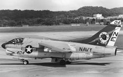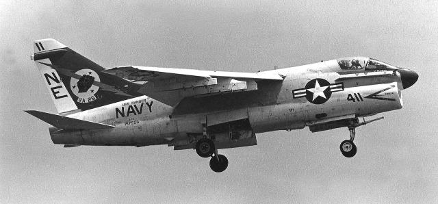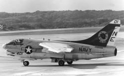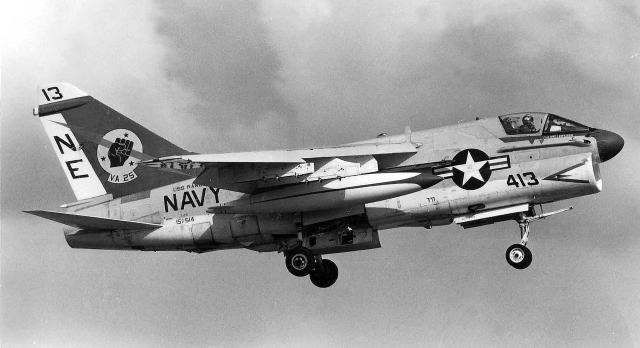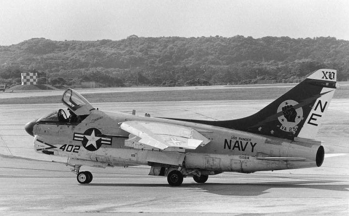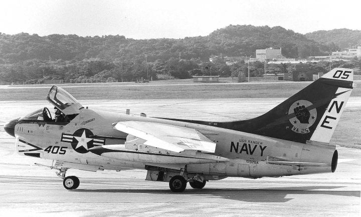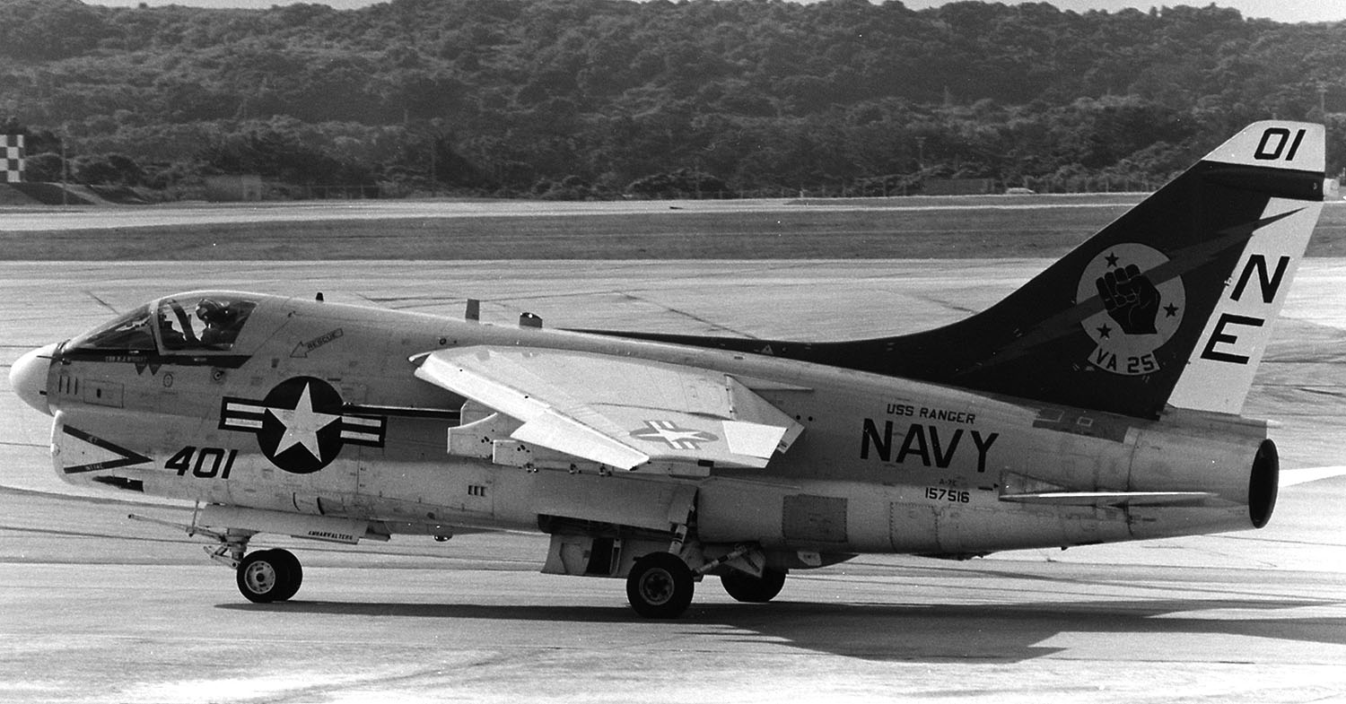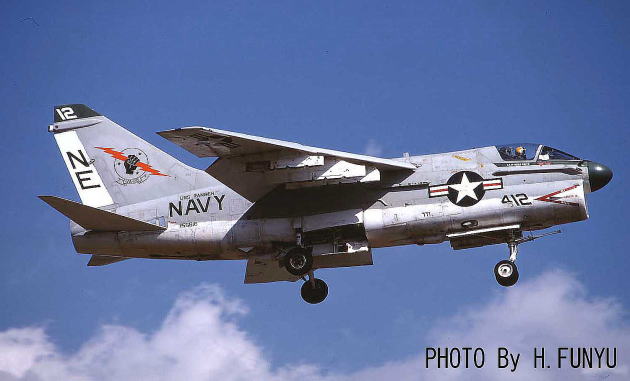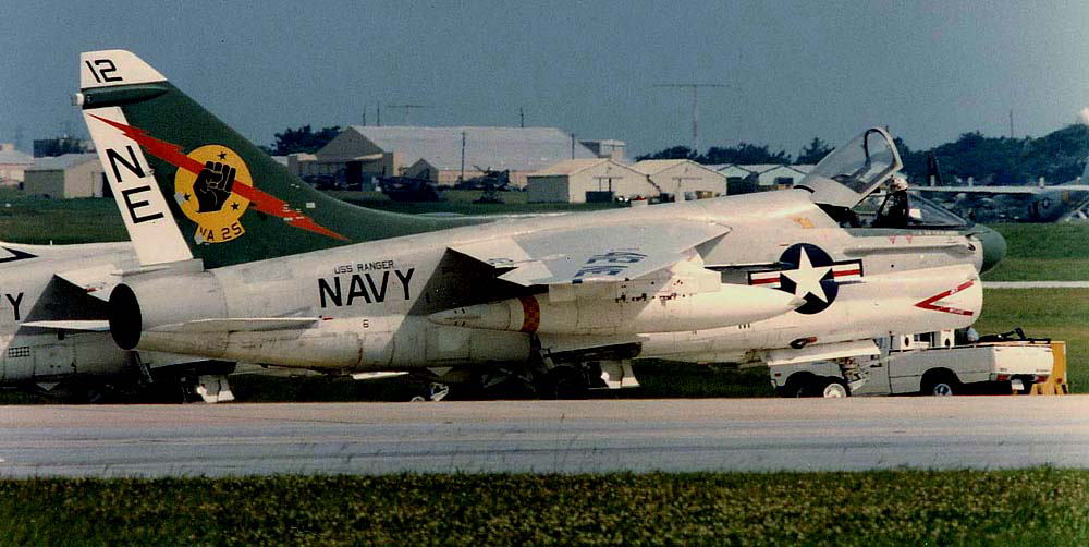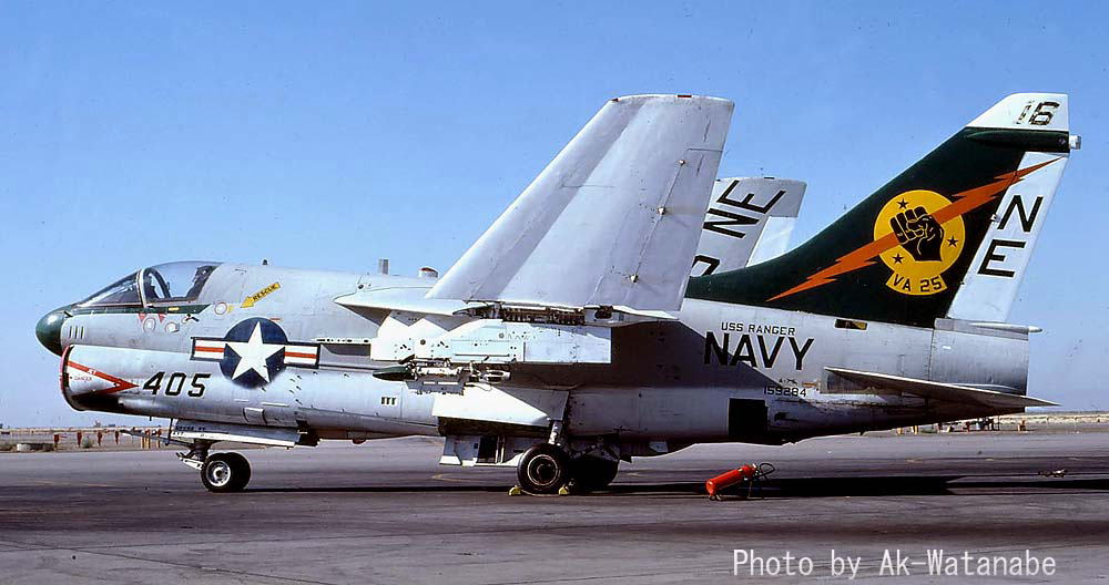 1979年7月USSレンジャーから突然飛来したVA-25のA-7Eは、その後8月末まで空母と嘉手納基地の間で頻繁に往来を繰り返した。8月には爆装をしての訓練も行われた。当時の嘉手納の海軍スペースは飛来した機体を上からGETできる絶好の撮影ポイントがあった。尾翼にオールドイングリッシュで”XO”と書かれているのは本来”02”番機で副長機である。
