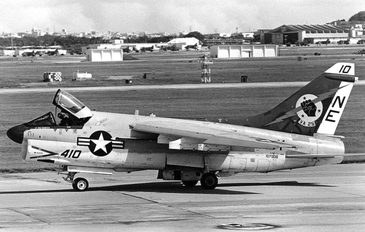 渡辺 明さんが1975年に撮影されたVA-25のA-7E。リムーアにおいて撮影されたものであるが、機首の20mmバルカン砲の砲口が煤けている事から撮影日前に訓練で使用された模様。Bu,No,159284