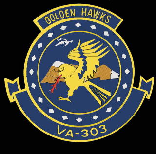 A-7全盛期 太平洋方面攻撃飛行隊の予備役部隊の1つとして、NASアラメダをベースにしていた部隊である。1970年代後半は、VA-303/VA-304/VA-305の3個飛行隊が予備役に存在し、有事の兵力不足を補う事になっていた。A-7の予備役の中で一際美しいマーキングを施していたのがこのVA-303。正にマリンブルーの尾翼に黄の鷹を描いていたが、写真のように夕日に照らされれば鷹はゴールデンホークに見える。MCAS ユマで初めて出会った彼らは、創設当初のマーキングからこのブルーベースの下地に黄色の翼を広げた鷹の絵柄に換えていた。これを目にした時は信じられないような派手なマーキングに小躍りしたものである。コルセアⅡ型のタイプは、少し古いB型であった。