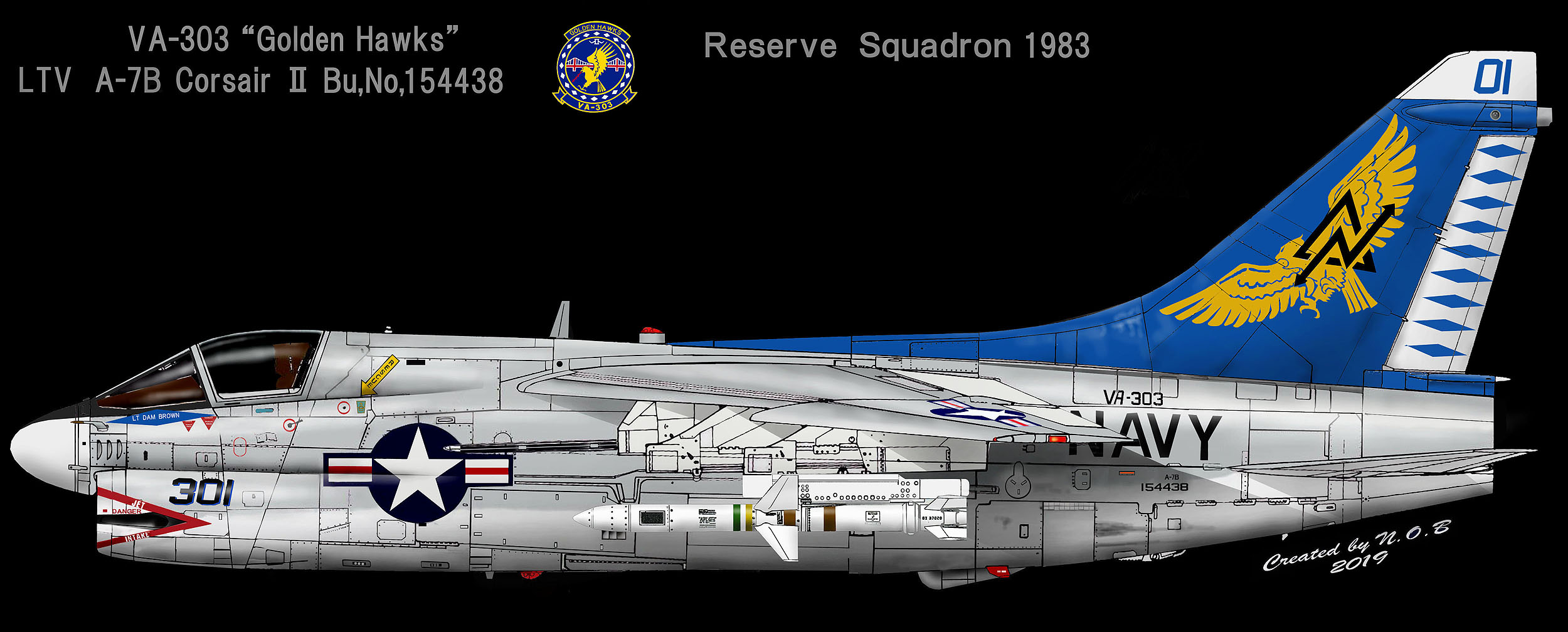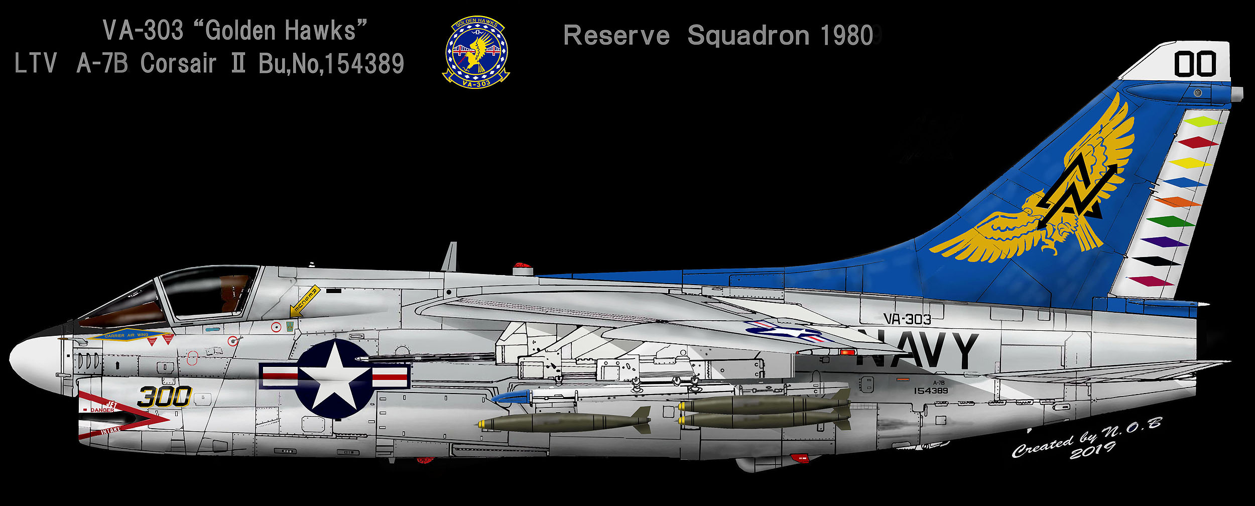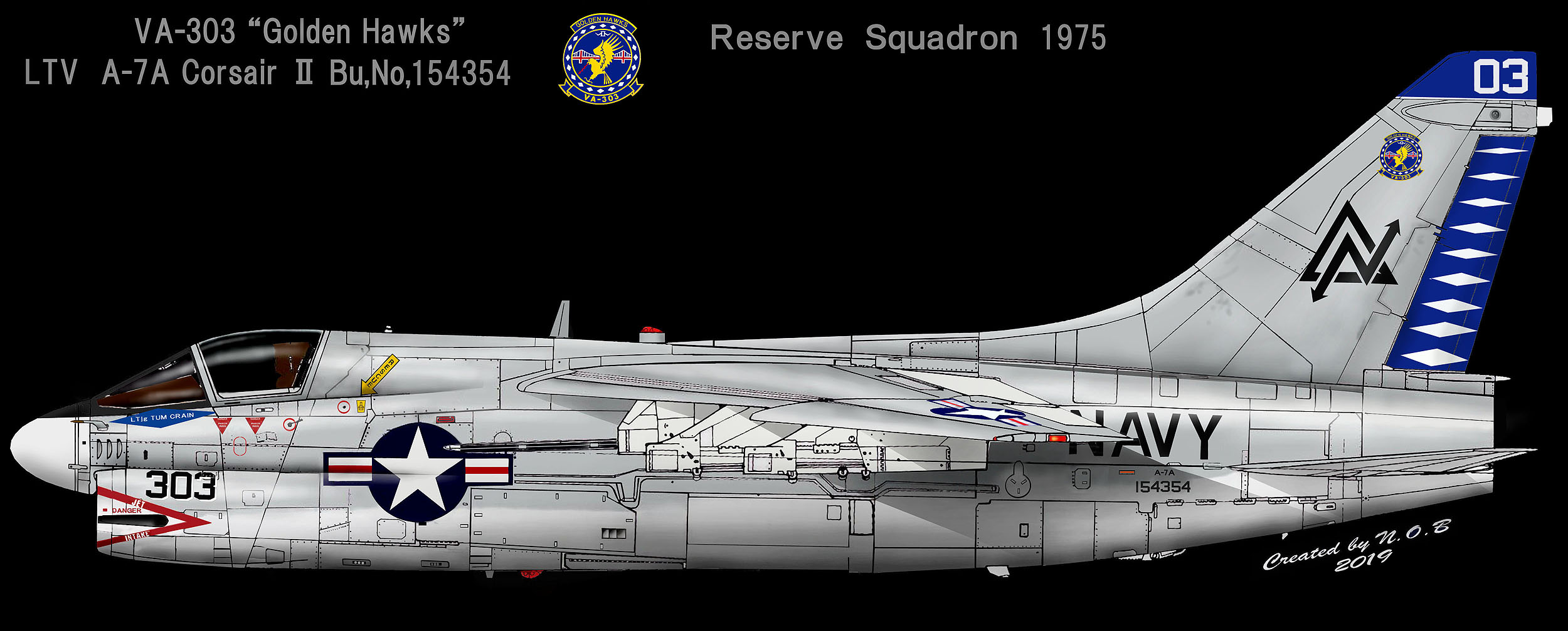 創設されてしばらくの間は、VA-303のA-7Bは、上のイラストの通り特に派手なマーキングではない。VA-303のインシグニアは、尾翼の上部に貼られており ラダーのダイアモンドが美しい。予備役部隊を示すテールレターは、”ND”。”D”がDelta(三角)を意味するので象形文字化されていて、一般的にはNDとは読めない。初期の塗装は、NDのレターの下にビューアルナンバーの下4桁を大きく書き込んでいた。
