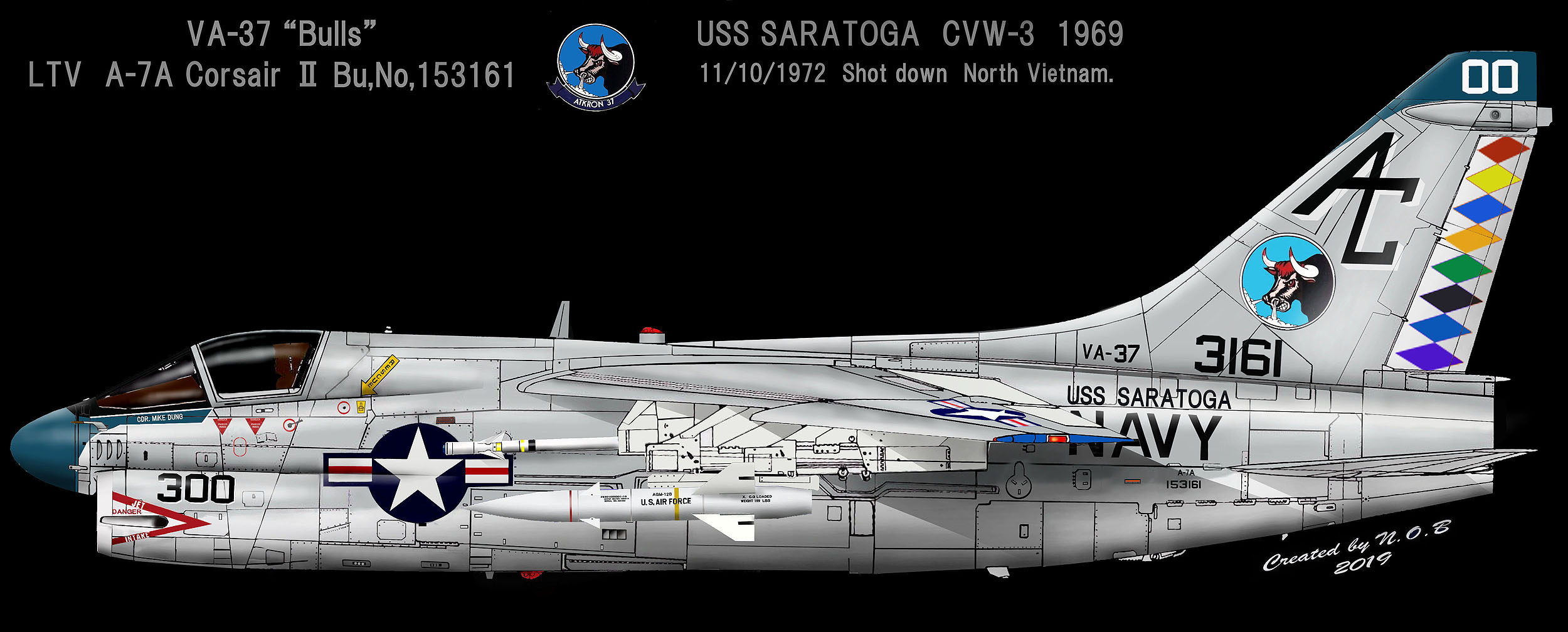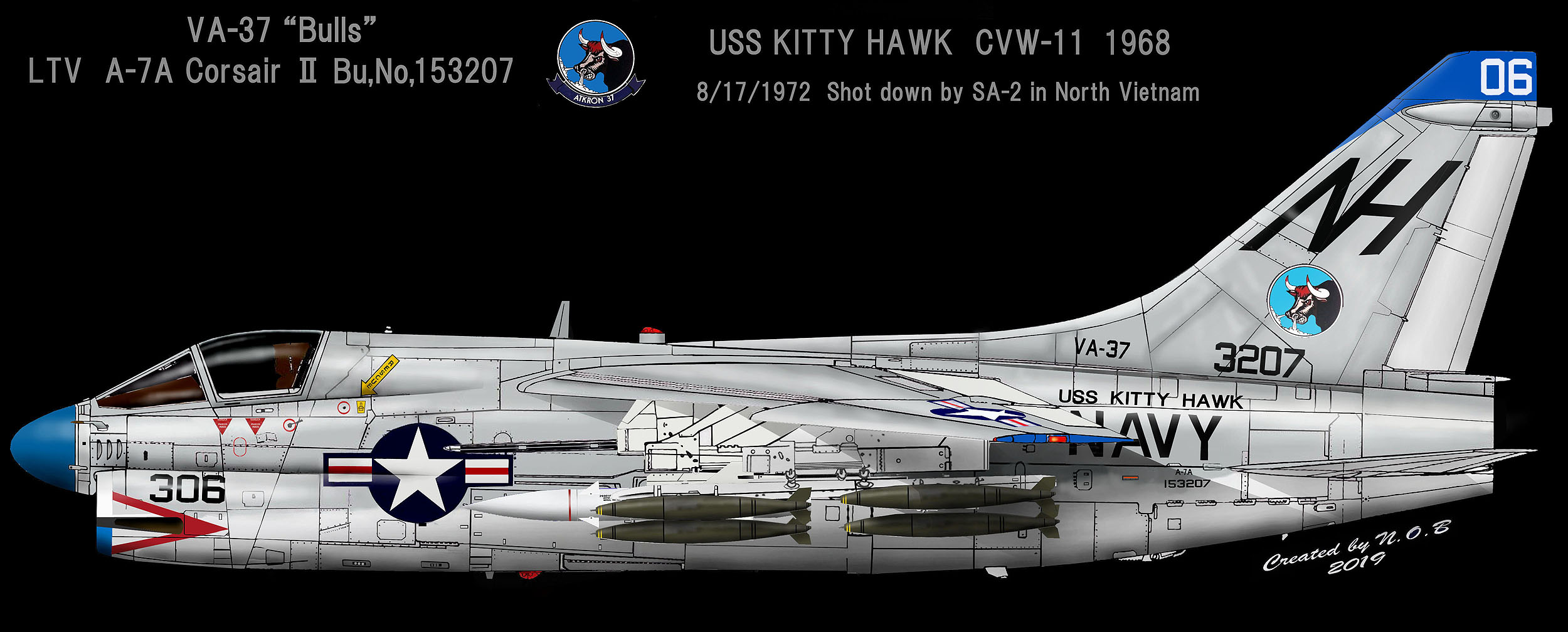 A-7コルセアの為に作られた部隊と言って良いVA-37、部隊番号末尾の「7」は恐らく創設1967年の7とA-7の「7」である。この飛行隊が最初に載った空母は我々にも親しみの深いUSSキティホークであった。1969年には、左側ベトナム戦へ駆り出され、ベトナムでテト攻勢以降の巻き返しでの爆撃任務に従事している。1968年11月に北爆が全面禁止になって以降の任務であるため、主たる目標は南ベトナム内のベトコン勢力および侵入した北ベトナム軍の一部に過ぎず、対空砲での激しい反撃は少なかったと思われる。そのためか1968-1969の間 飛行隊に被撃墜などの記録はなかった。