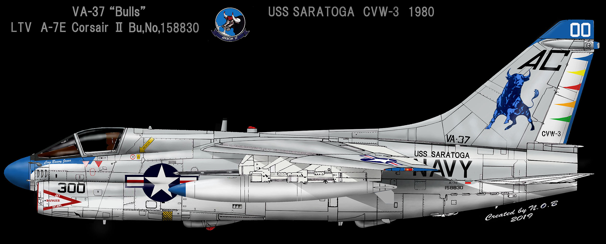 1970年後半にマーキングのフルモデルチェンジを行い、大きな牡牛を尾翼に書き込んだ。VA-37の300番CAG指定機は、A-7Eになっていくつかのマーキングパターンが存在したが、上のイラストは牡牛の角を各飛行隊カラーで並べた塗装例である。CAG機は尾翼に雄牛のシルエットをそのままスケールダウンしたカラーリングを並べていたものもあった。