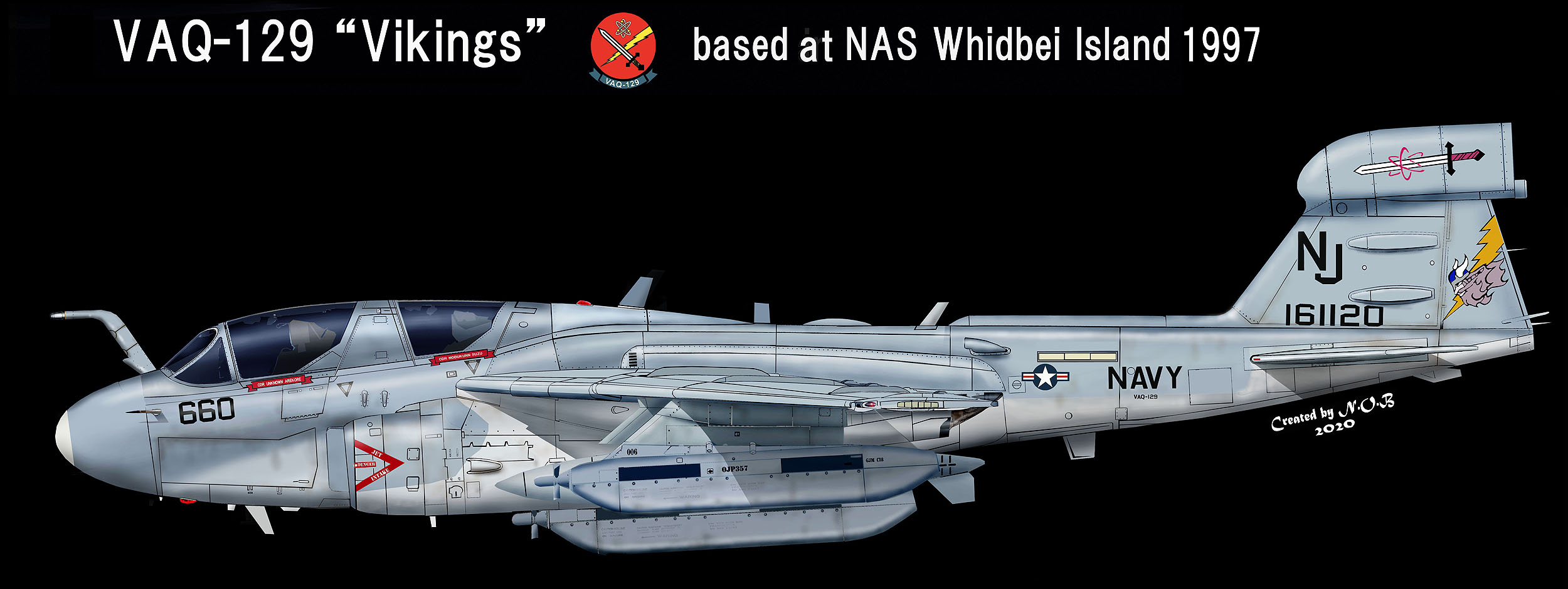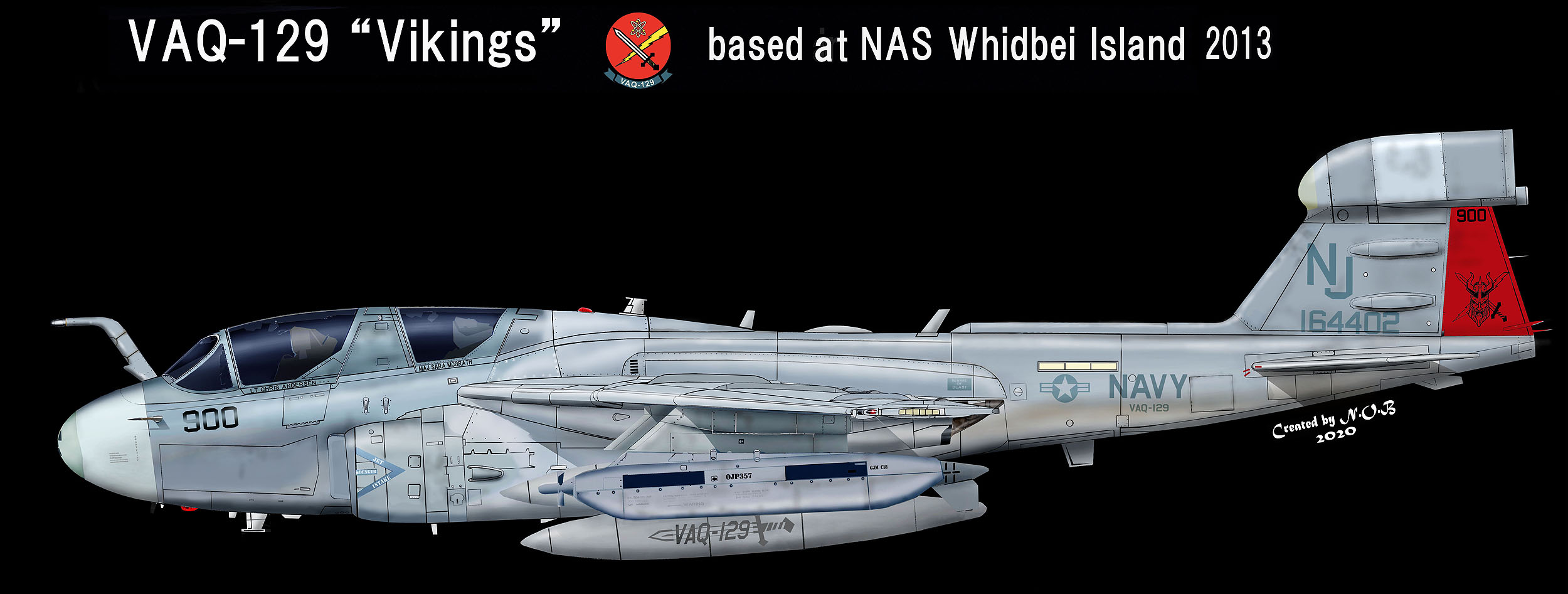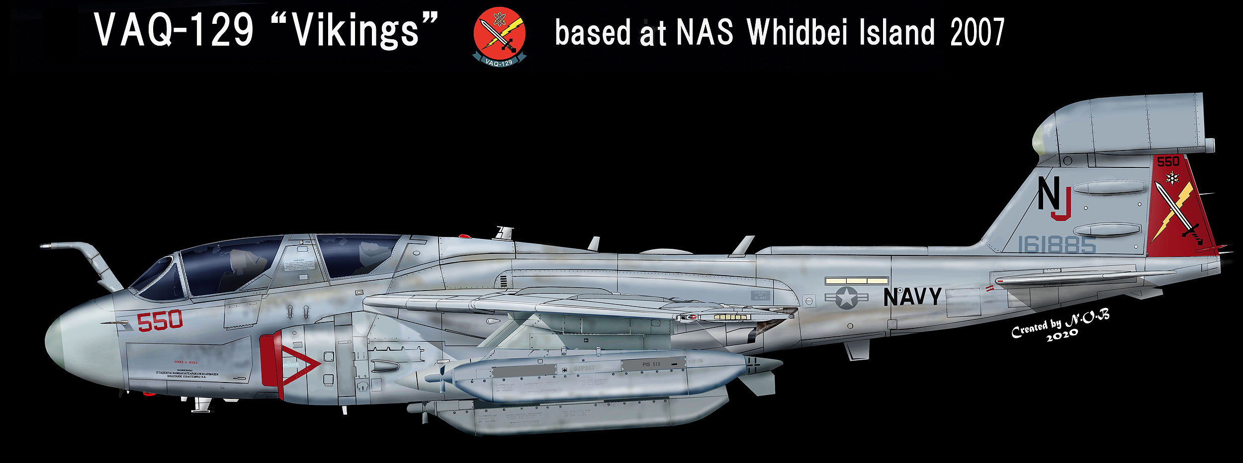 2000年代に入りラダーにはバイキングの顔が描かれるようになったが、ロービジの見本のような低視認塗装が主流であまり当時の写真は残っていない。2007年に現れた久々のカラーバードが上図の機体で、アメリカ各地で撮影されている。"NJ"を黒赤に色分けしているのもポイント。ラダーは元祖VAQ-129のデザイン。Bu.No161885