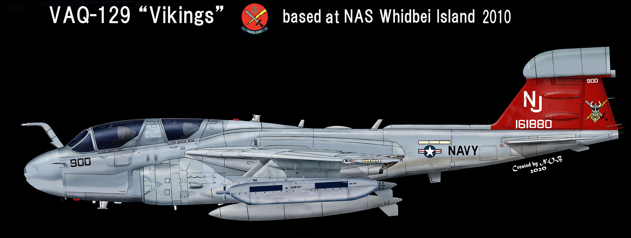 VAQ-129の2代目ショーバード、尾翼を全面的に赤く塗った派手なマーキングで注目された。ネリス空軍基地のショーなど各地で展示され航空機ファンを魅了したはずである。バイキングの顔の絵柄は、少なくとも5色を使ったフルカラーのもので凝ったデザインである。Bu.No161880