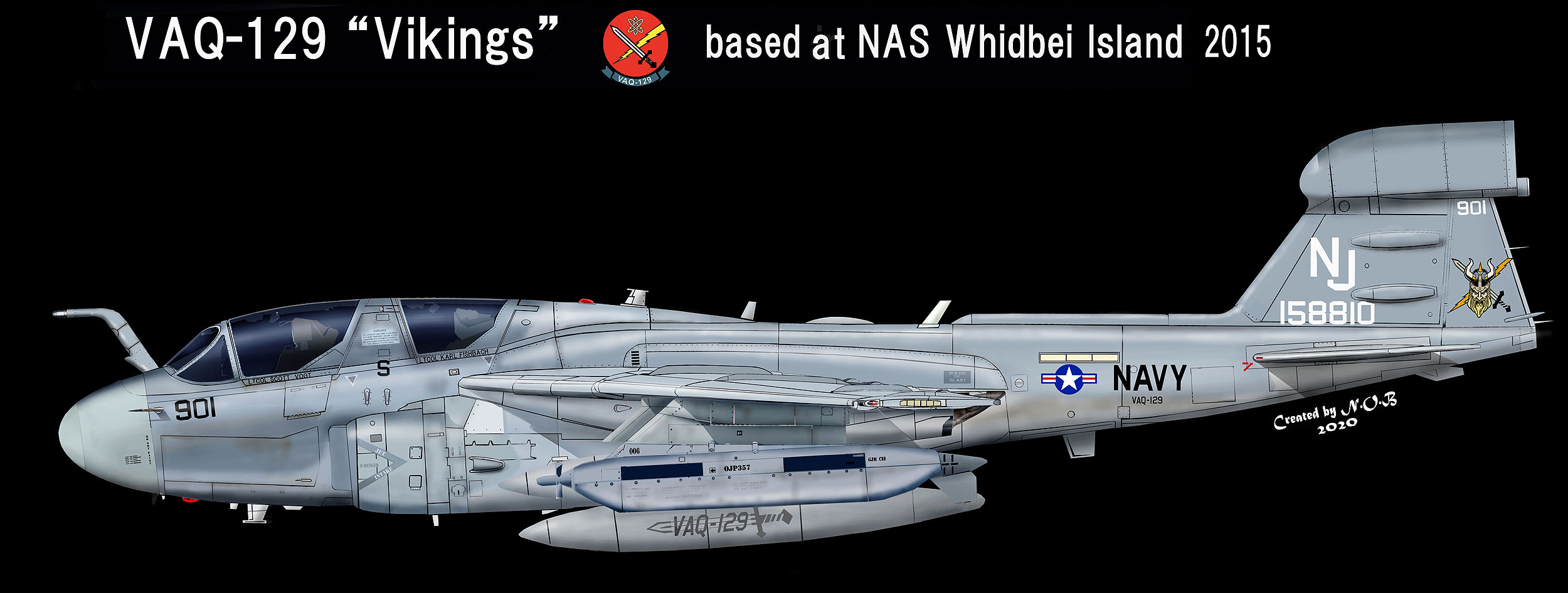 VAQ-129のEA-6B最後のショーバードNJ-901。国籍マークもフルカラーとなり、尾翼のレター”NJ”とビューアルナンバーは白というあっさりとした感じのデザインに仕上げられて、従来のショーバードと違いスコードロンカラ―の赤を使っていない。ラダーのバイキングの顔は非常に細かいデザインであった。 Bu.No158810。