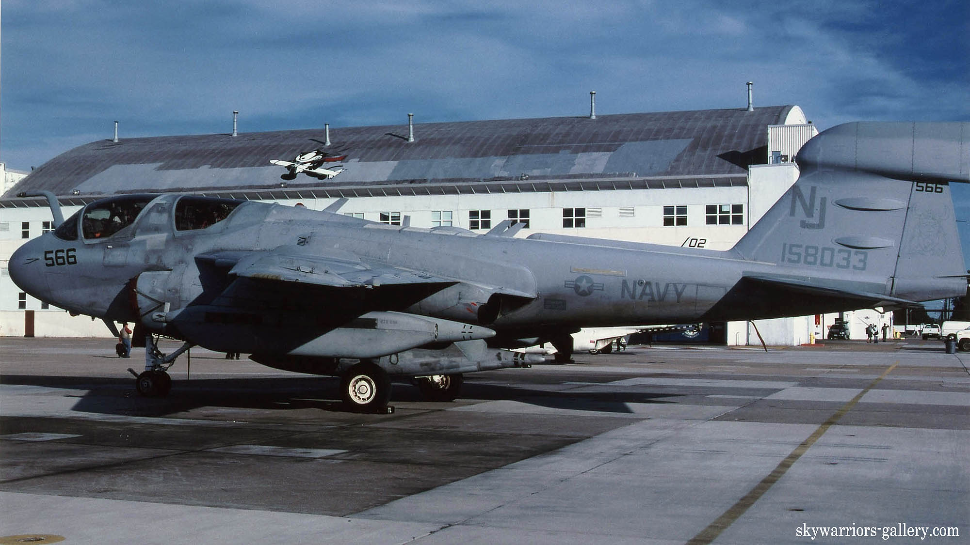 1999年東海岸のオシアナ海軍基地に展示されたVAQ-129のEA-6B。ラダーにバイキングの顔が書かれているが、あまりに薄いので良く目を凝らしてみないとわからない程の優秀なロービジ塗装であった。翼下のジャミング・ポッドはALQ-99と呼ばれる電子妨害装置で、EA-6Aが装備していたマニュアル操作のALQ-76と比較すれば、自動化が進んだ優れものである。Oct.2000