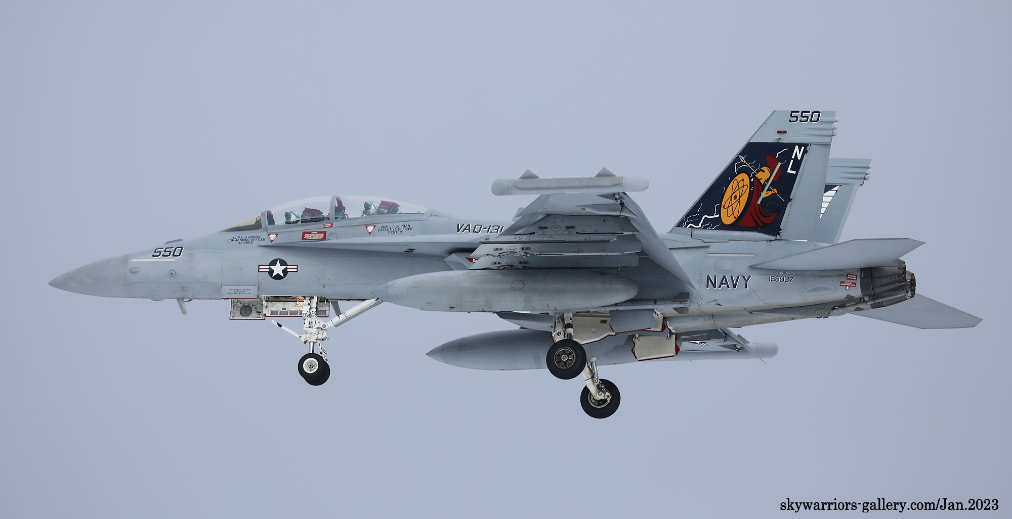 VAQ131の2023年1月現在のコマンダーは、マサチューセッツ州出身の女性士官である。クリスティン・ラルー中佐(Krisuten Laroux)”SNIF”。彼女は2021年10月にコマンダーに就任し、今年1月に飛行3000時間達成したベテランパイロットでもあるが、3000時間達成の日、可哀そうに大雪の寒い中、お祝いの水かけとシャンペンを浴びて、さぞかし寒かったと思う。
