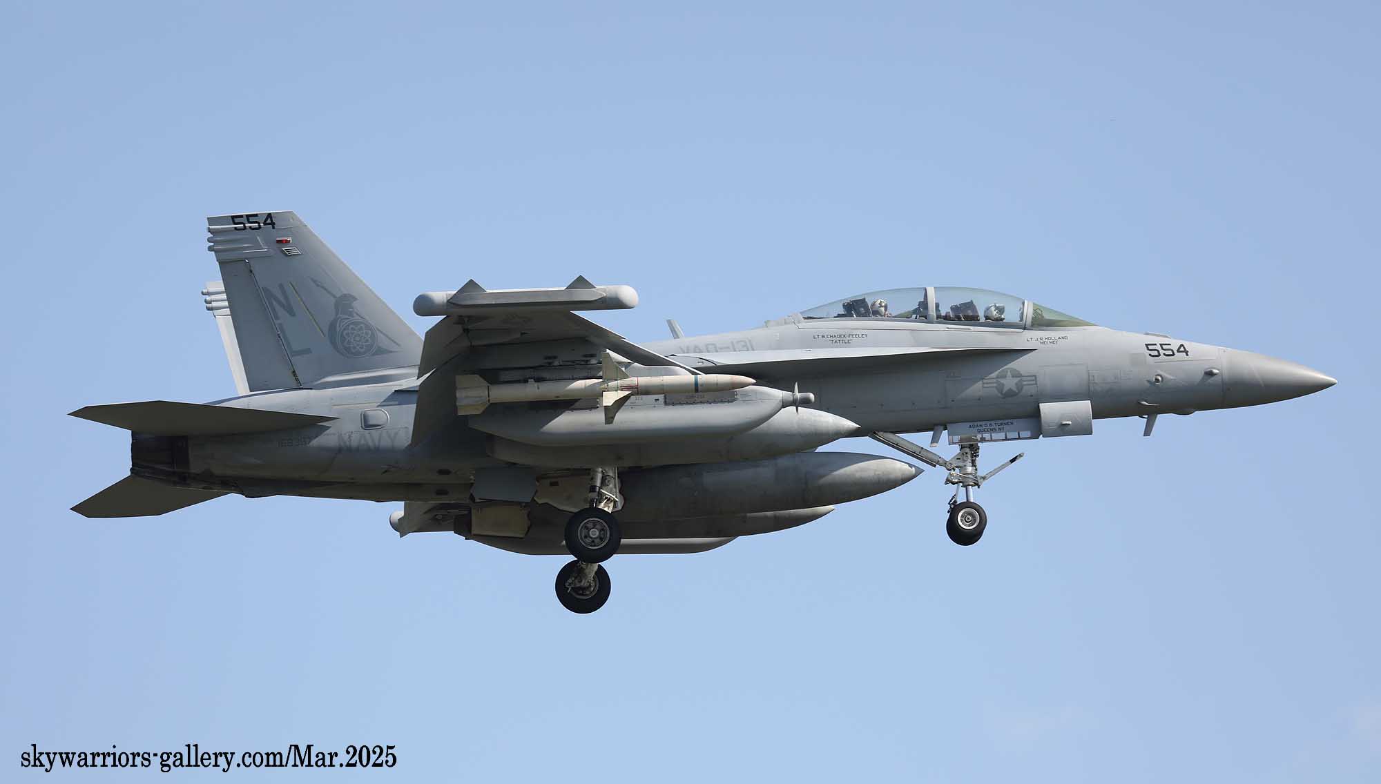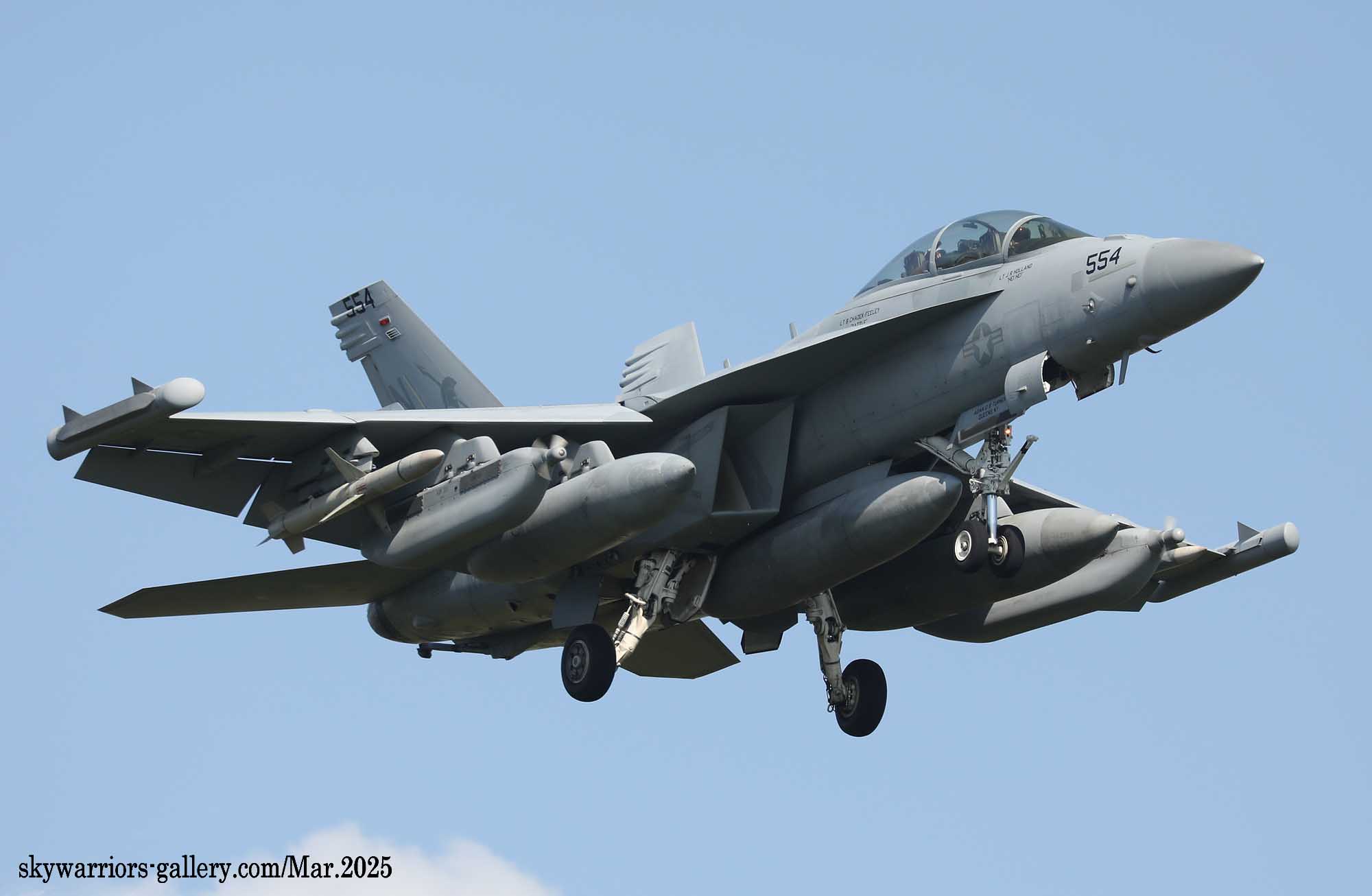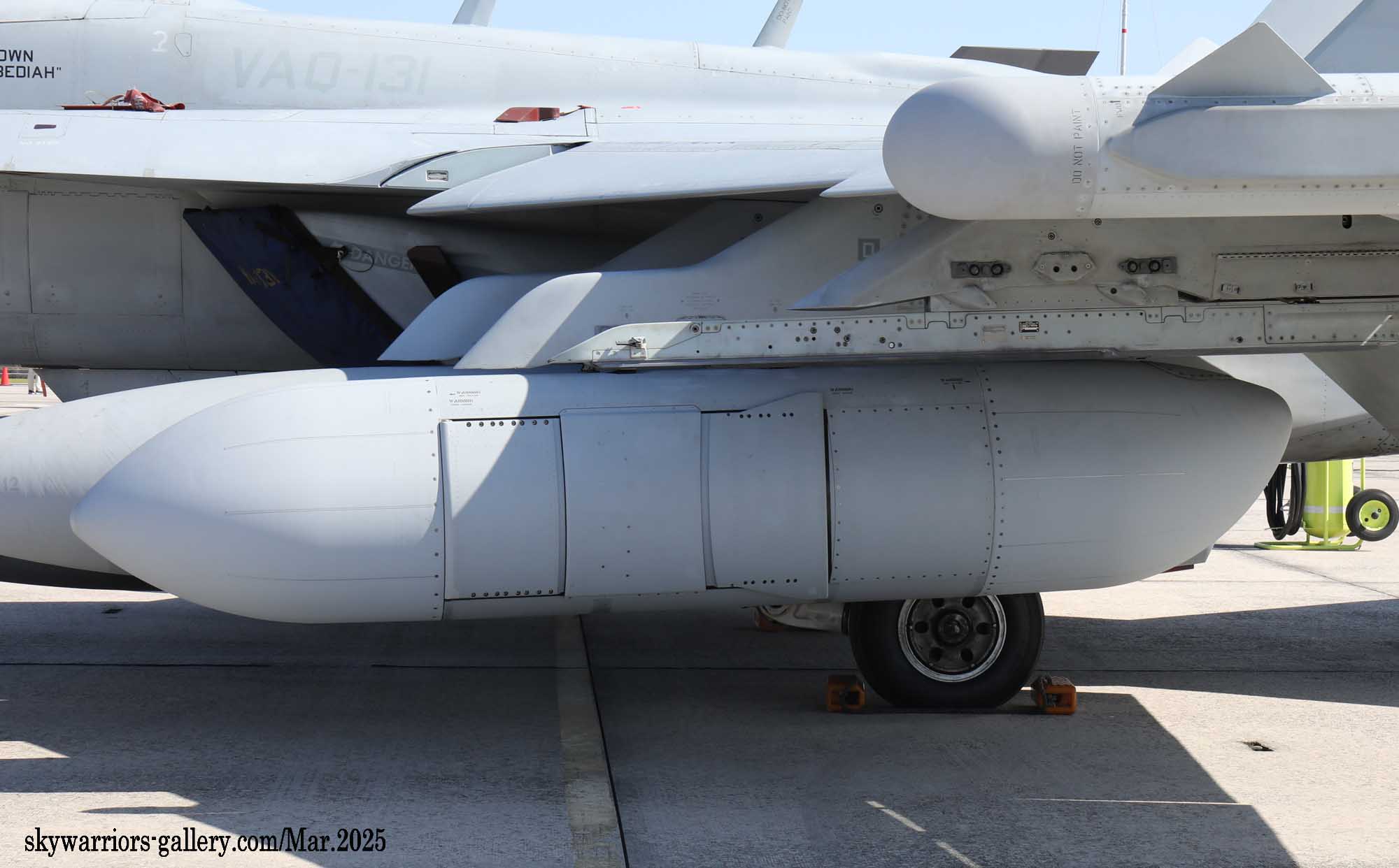 ↑ 新型ジャミングポッドは、全機に行き渡っているわけではなく、NL-554は従来のAN/ALQ-99を懸架して、ハームのキャプティブ弾を付け飛行訓練を行った。