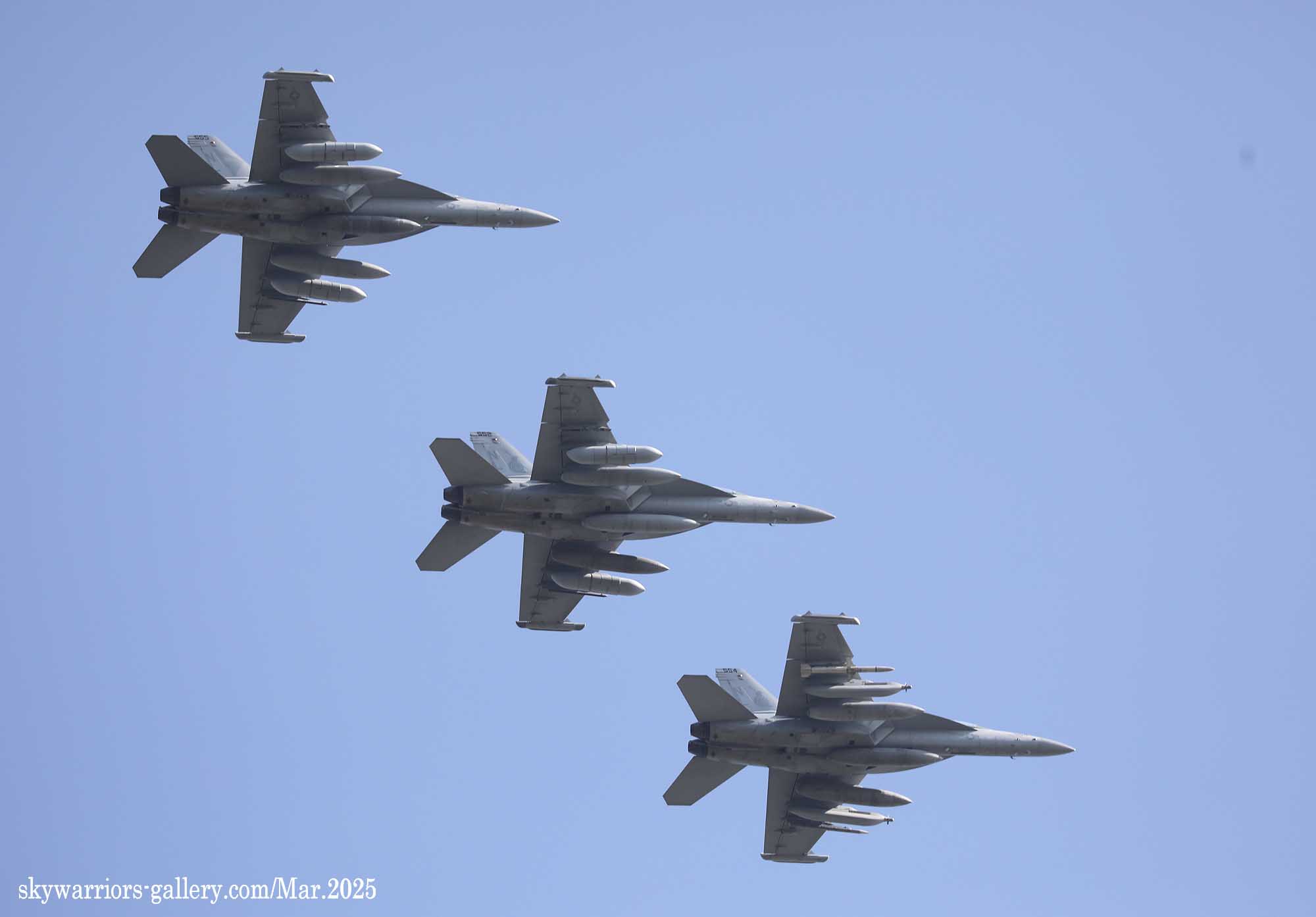 ↑ 2025年3月某日 嘉手納基地R/W23-Lで離陸するVAQ-131のEA-18G。この日も4機が飛行したが、もう長い間 隊長機の姿を見ていない。機体が不調のようである。