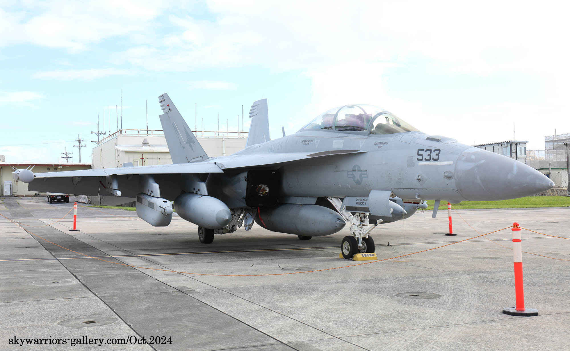 ↑ 2024年10月6日普天間基地で撮影したVAQ-134EA-18G/NL-533/Bu.No.166946。翌日 嘉手納基地での情報では彼らは嘉手納に来て1か月近いがあまり活発に飛行していないようである。特に色付のNL-530は1度しか飛行していないと、地元のマニアが嘆いていた。また調子が悪いのか・・・