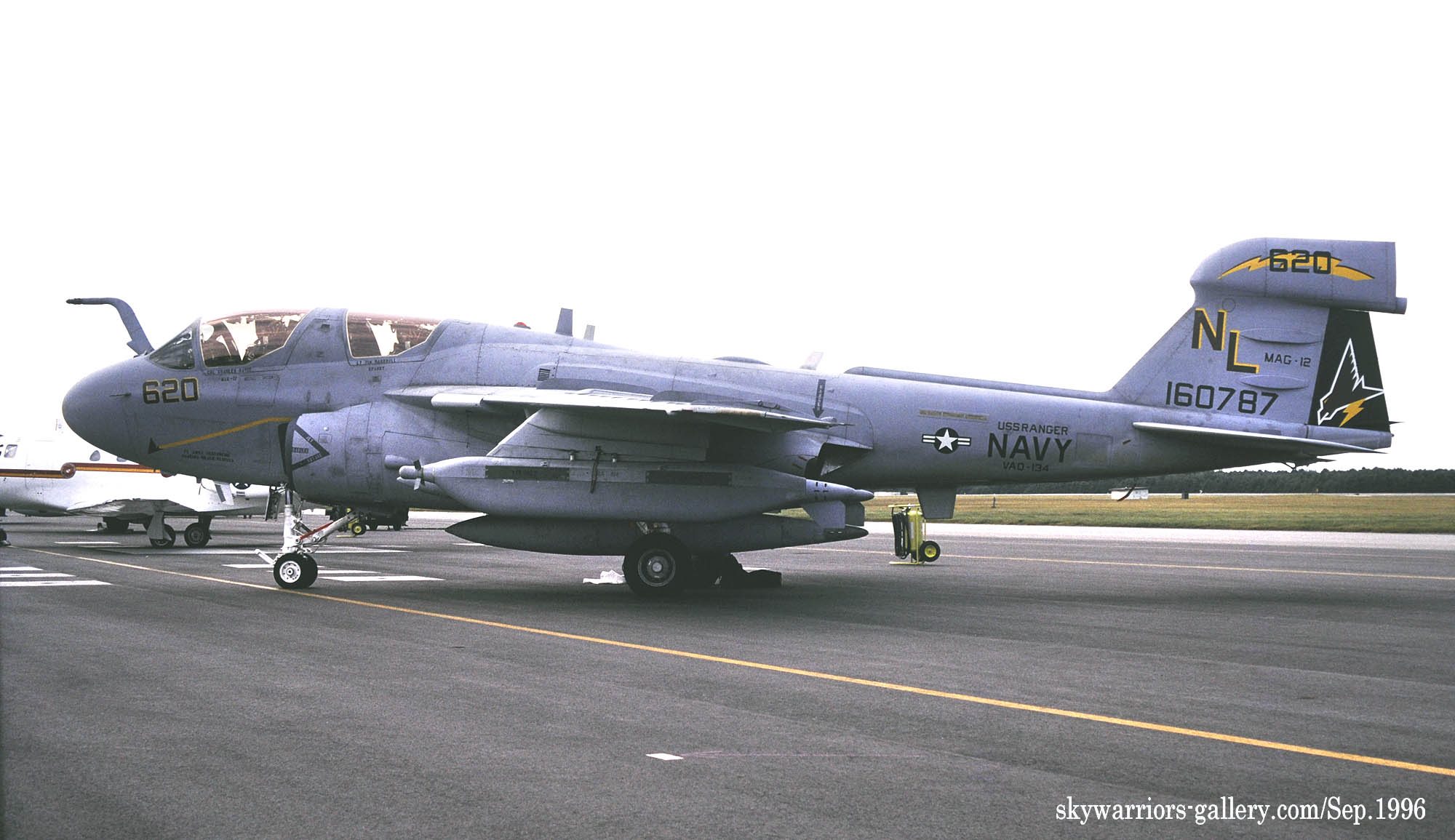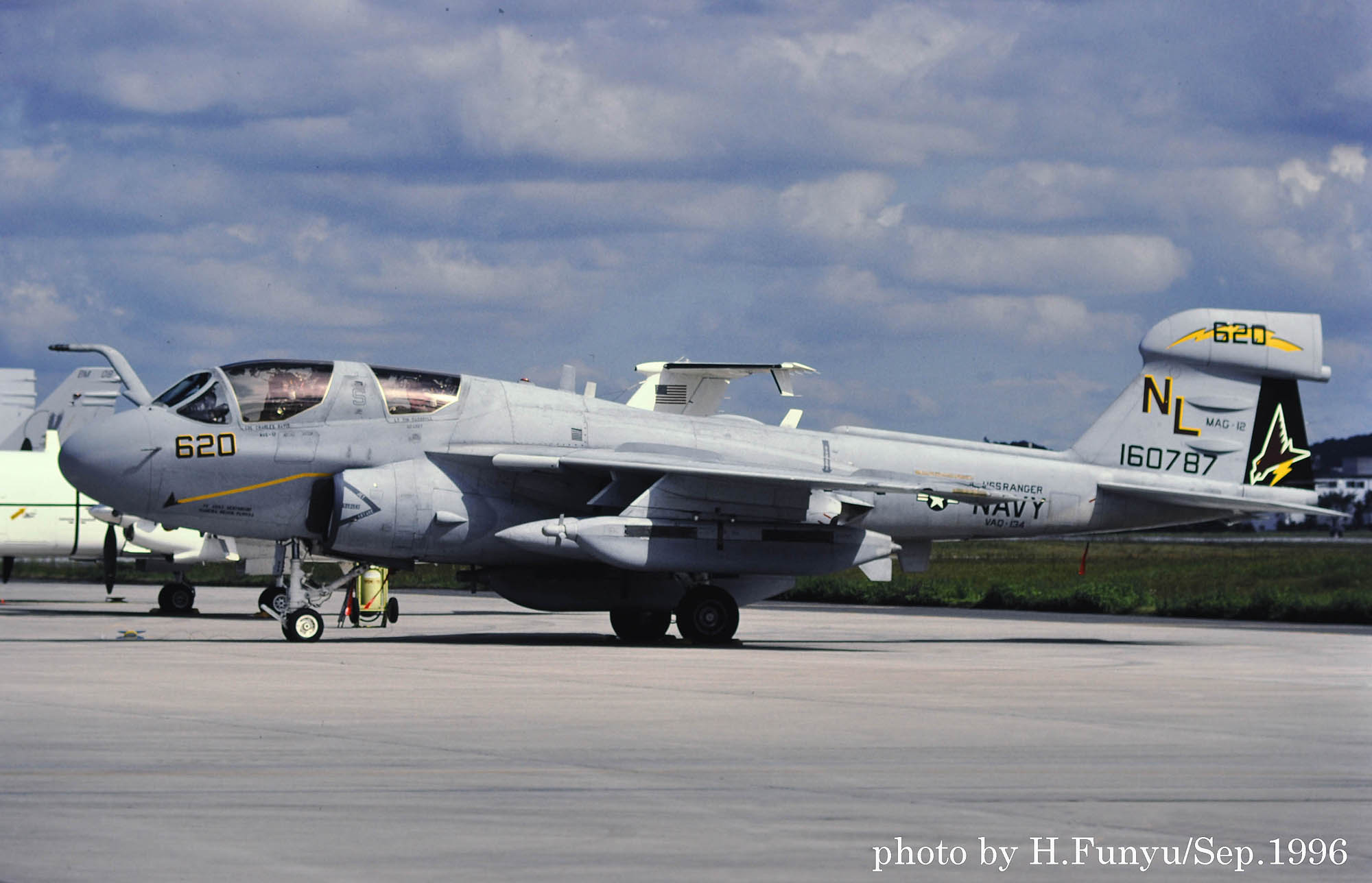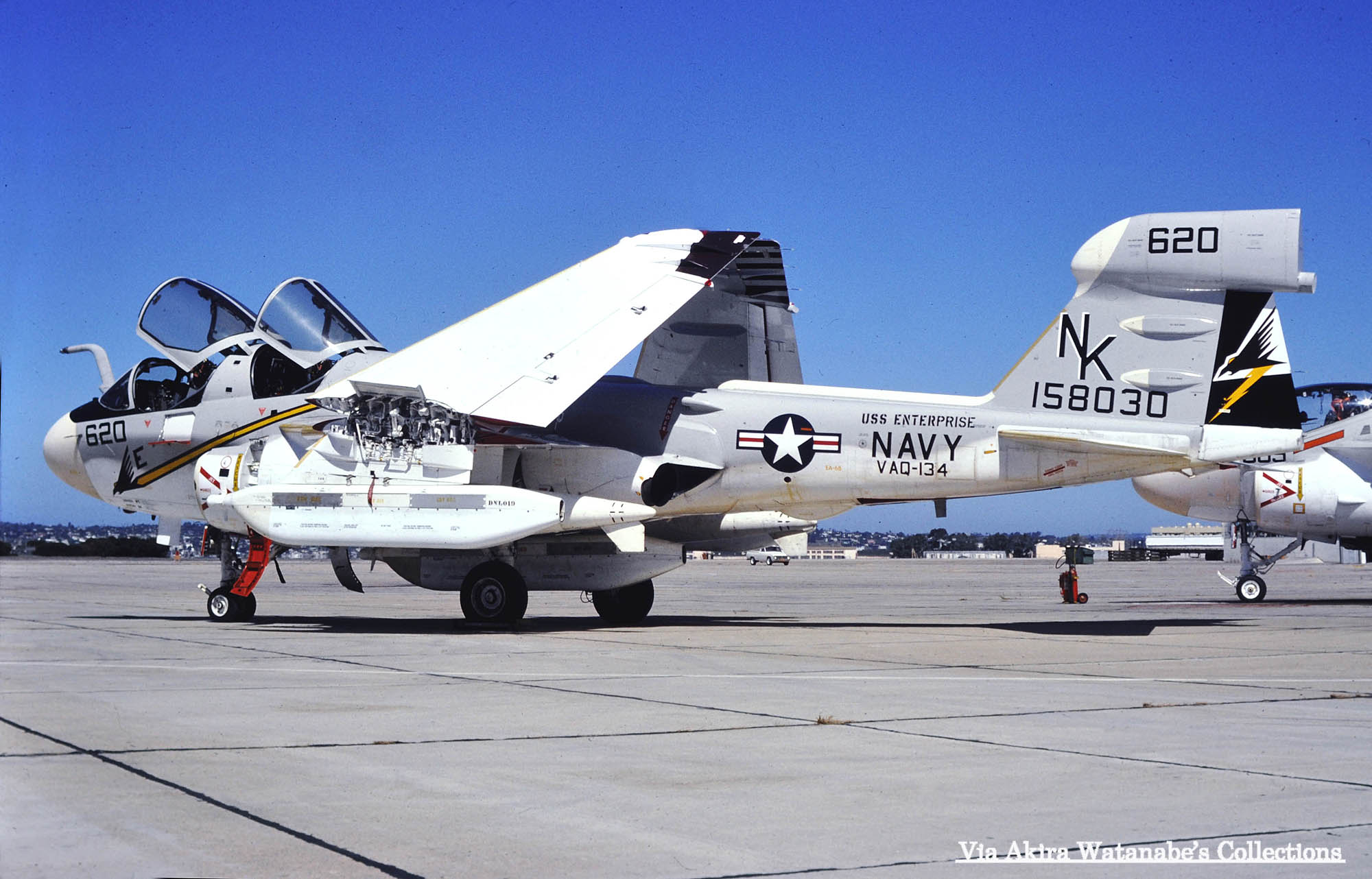 海軍/海兵隊/空軍の電子戦専用機統合計画により、岩国のVMAQ-2に加え幾つかの海軍VAQ部隊も日本をローテーションで訪れるようになった。その際、三沢のOHに展示されたVAQ-134は既にロービジ全盛の時代にも関わらず、フルカラーマーキングで飛来し多くのマニアを驚喜させた。多分これが撮影できただけで遥々東京方面から出掛けたマニアも満足して帰ったのでないだろうか。VAQ-134は、1969年6月創設された部隊で、当初USSニミッツのCVW-8に所属していたが、後にCVW-15に移動して”NK"のレターをつけたNK-620(158030)が1979年に嘉手納にも飛来している。