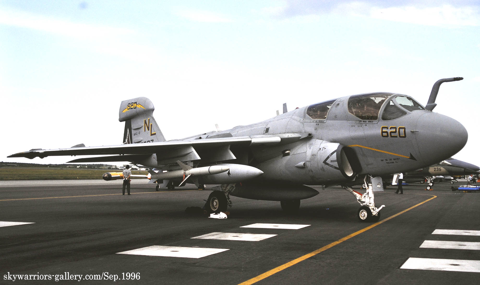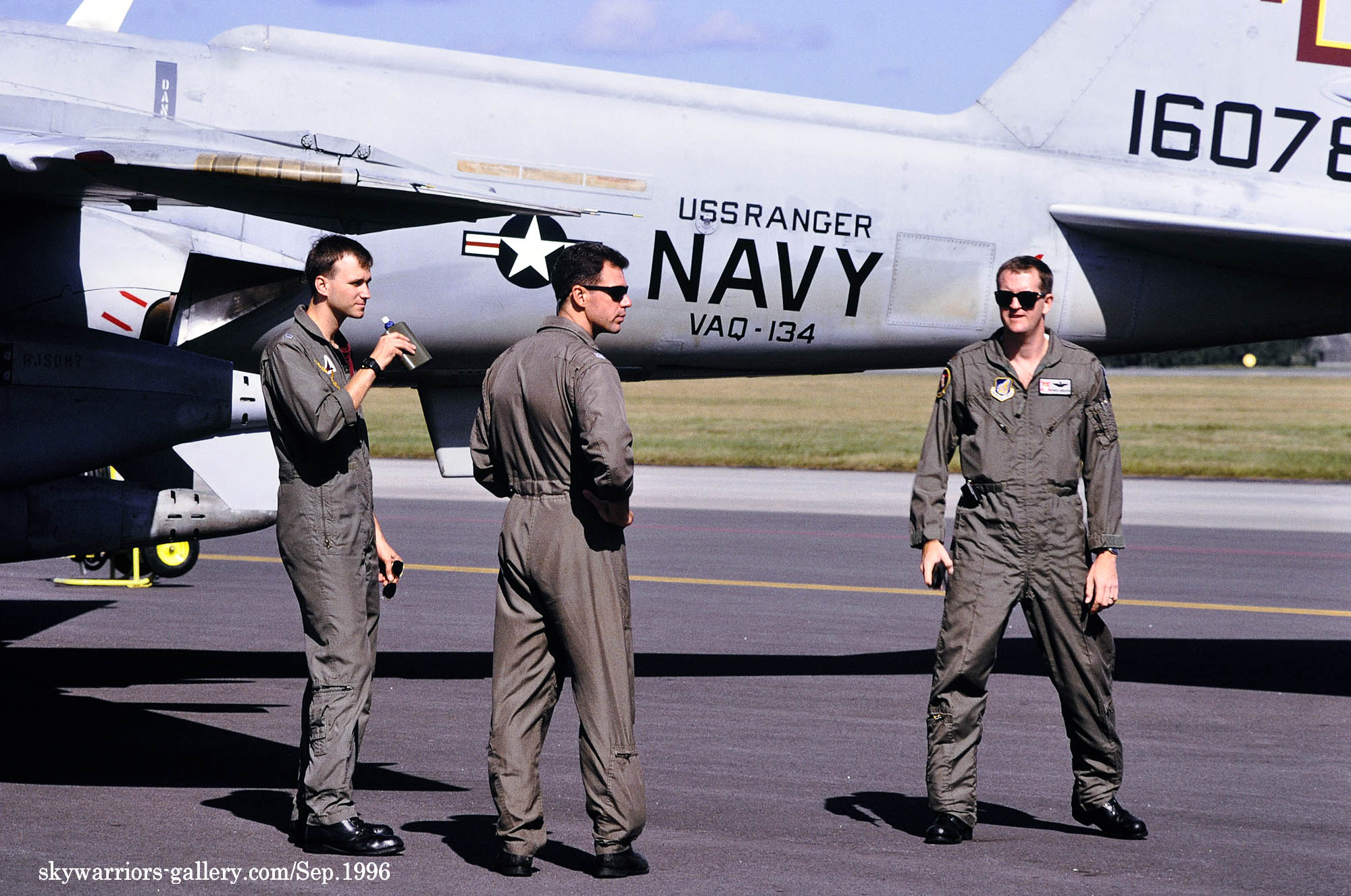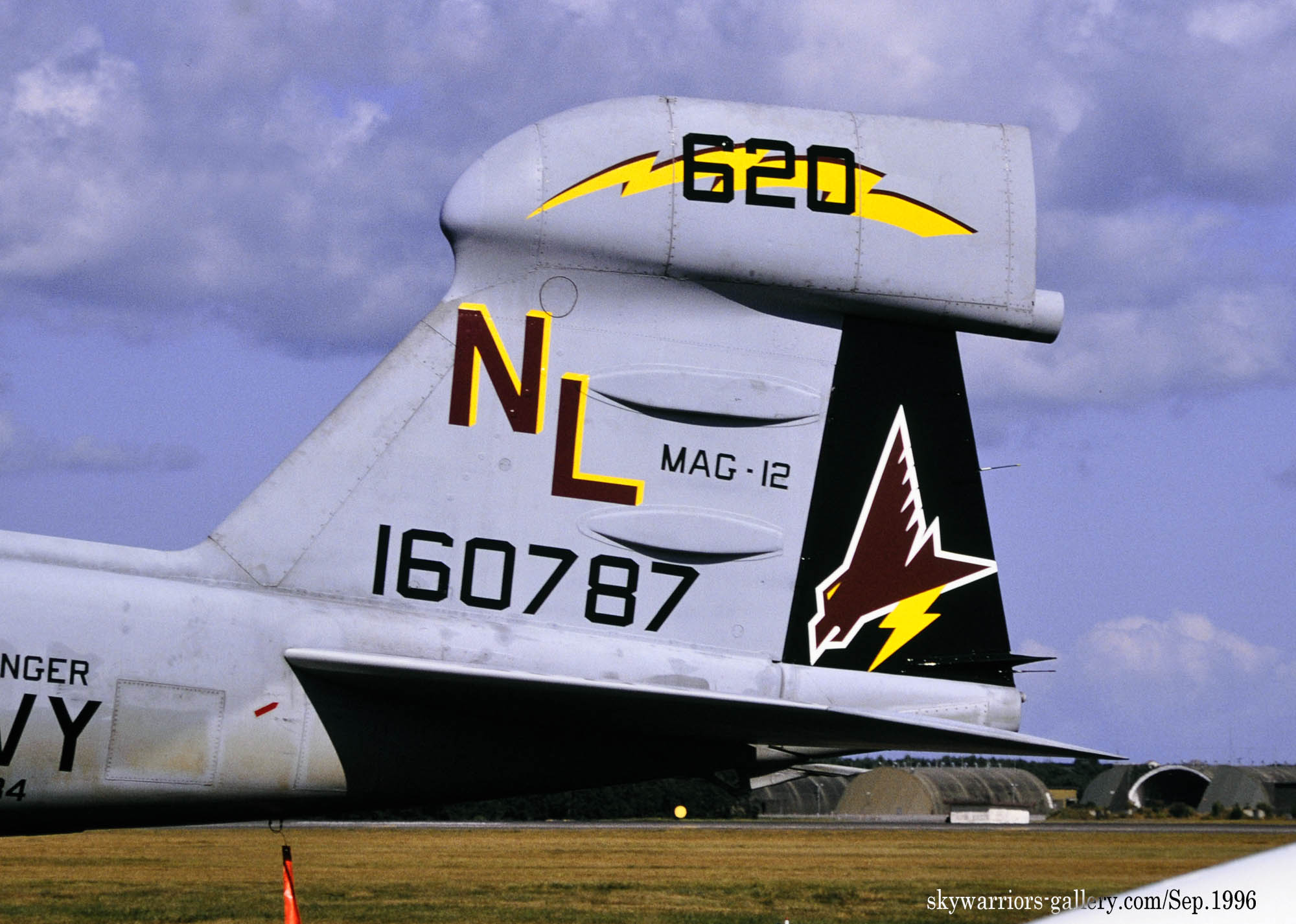 海軍/海兵隊/空軍の電子戦専用機統合計画により、岩国のVMAQ-2に加え幾つかの海軍VAQ部隊も日本をローテーションで訪れるようになった。その際、三沢のOHに展示されたVAQ-134は既にロービジ全盛の時代にも関わらず、フルカラーマーキングで飛来し多くのマニアを驚喜させた。多分これが撮影できただけで遥々東京方面から出掛けたマニアも満足して帰ったのでないだろうか。VAQ-134は、1969年6月創設された部隊で、当初USSニミッツのCVW-8に所属していたが、後にCVW-15に移動して”NK"のレターをつけたNK-620(158030)が1979年に嘉手納にも飛来している。