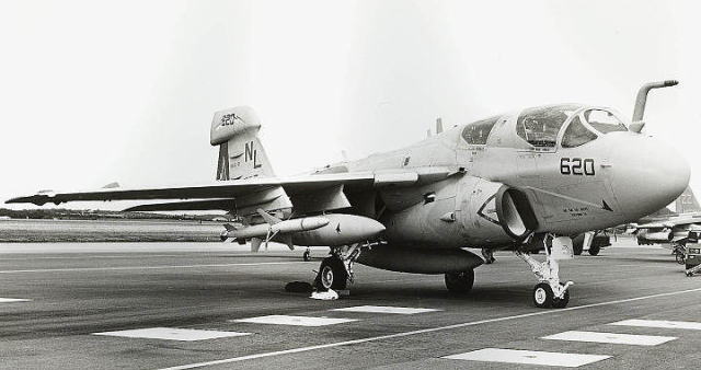 ↑ 1974年4月ノーフォーク海軍航空基地にて撮影されたVAQ-134のEA-6B/Bu.No.158035。機首に伸びるラインはまだ書かれていない。この機体は後に海兵隊に移管され、VMAQ-1所属時代は岩国にも飛来している。