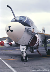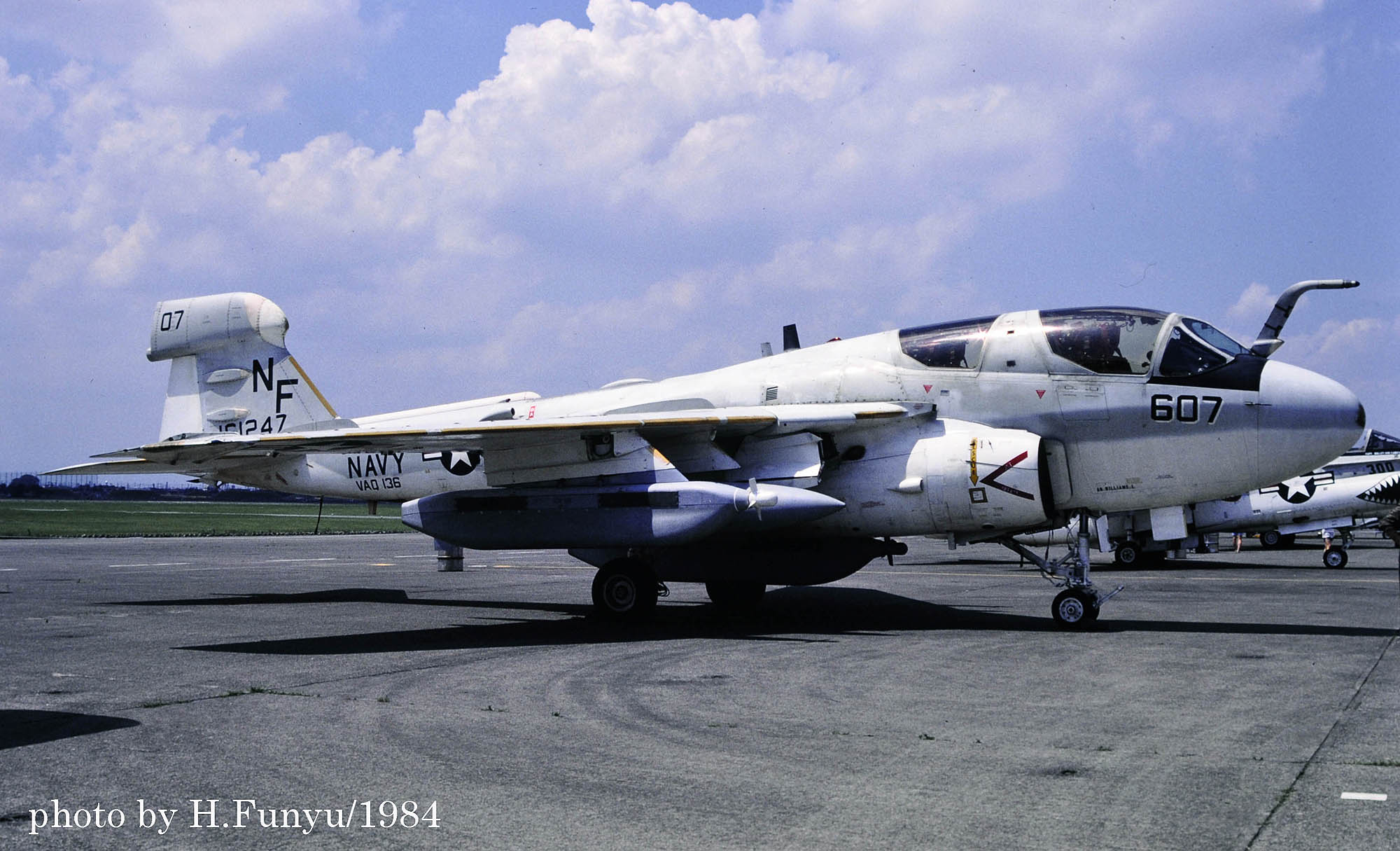 ↑ 1982年7月4日 横田基地航空祭に初めて展示された空母ミッドウェイ搭載のVAQ-136 EA-6B。この年の横田航空祭では新鋭のF-16A(朝鮮半島のクンサン基地より飛来)もデモフライトした。またA-10も初めて展示されるなど、新しい世代を感じさせる航空祭だった。