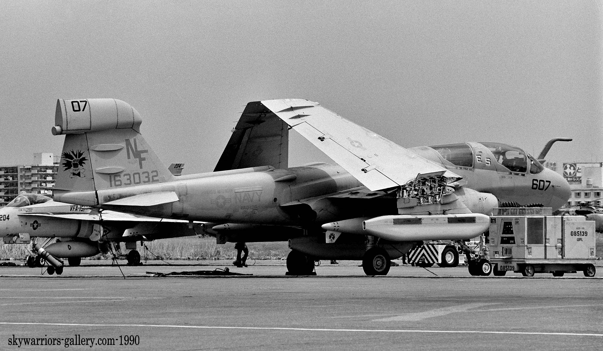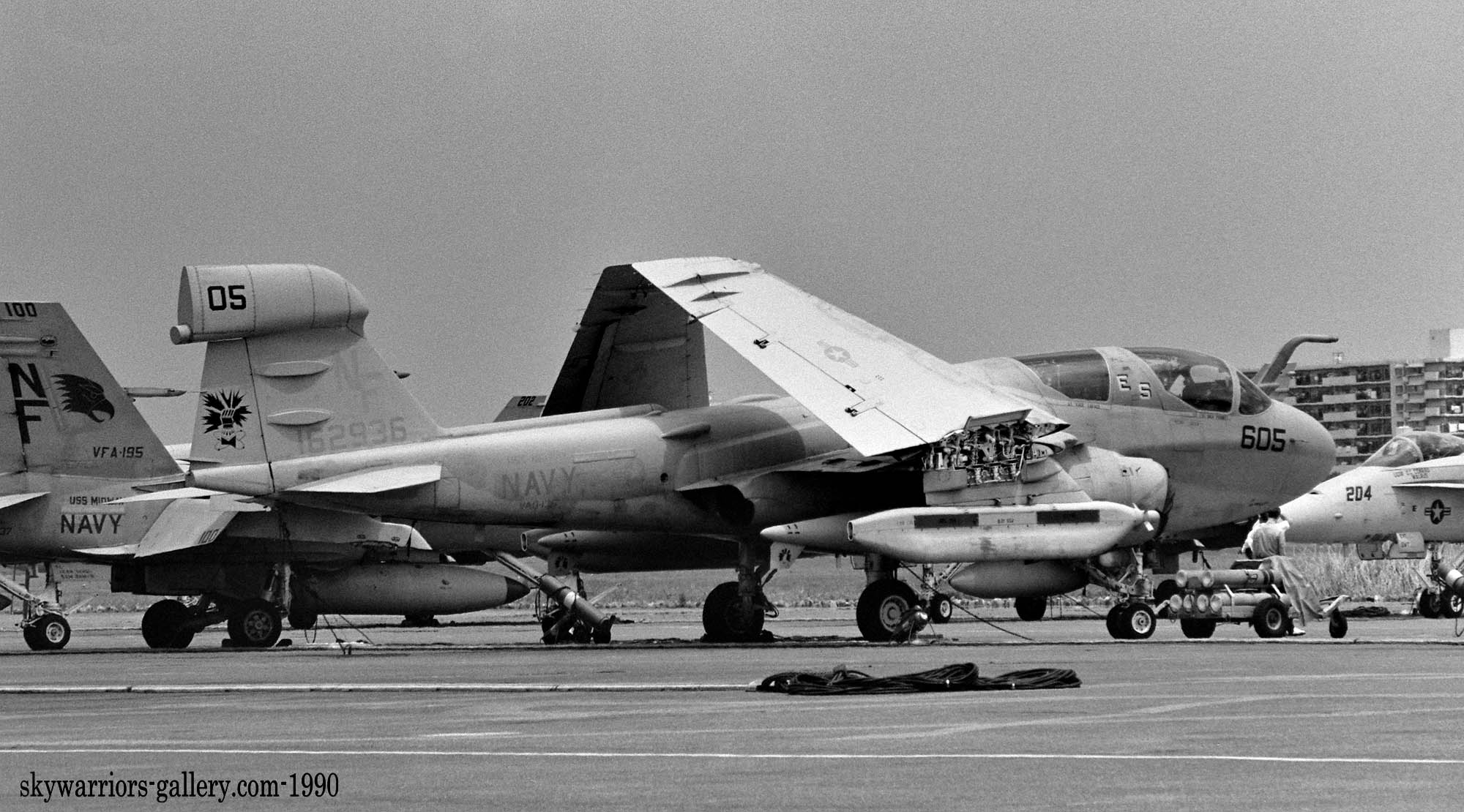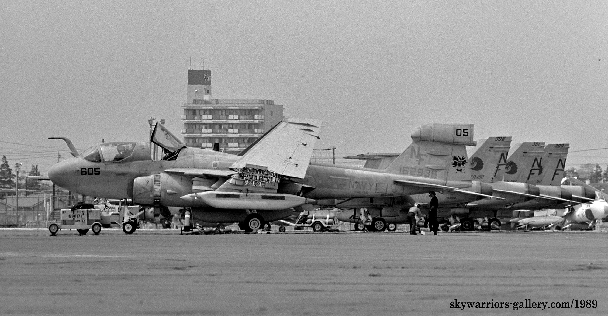↑ 1989年厚木基地航空祭で絵プランで確認できた数少ないEA-6Bの1機 NF-605/Bu.No.162936。この年の主役は、3個飛行隊が揃ったFA-18Aホーネンとの展示飛行だった。