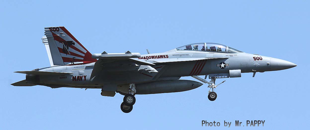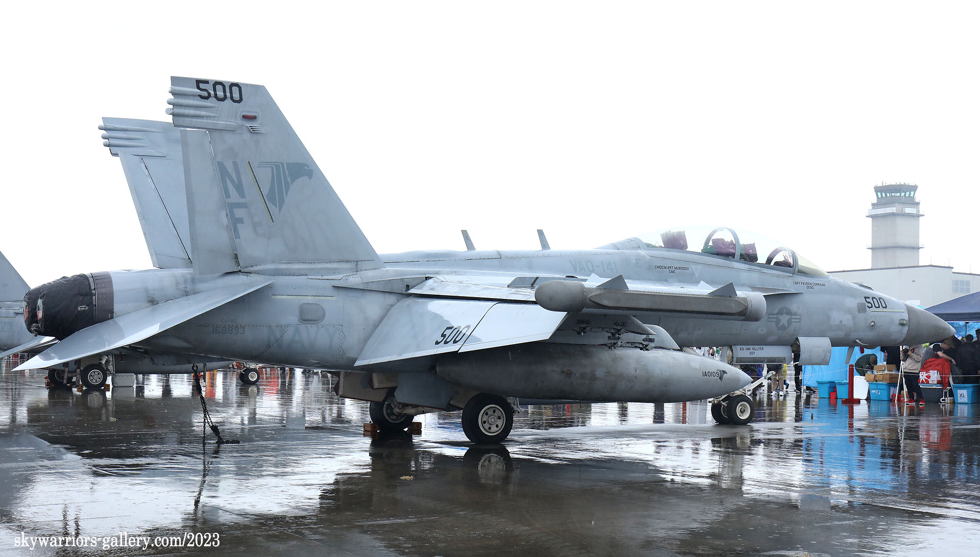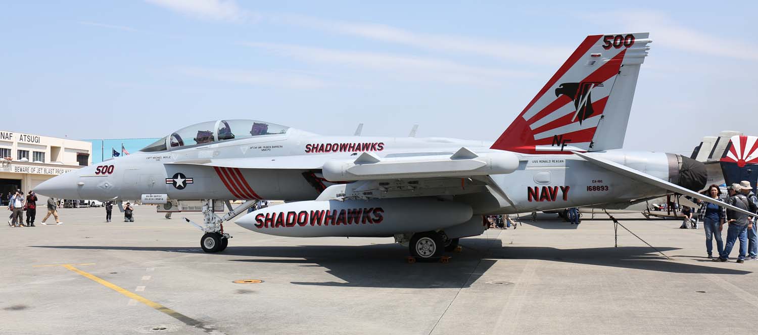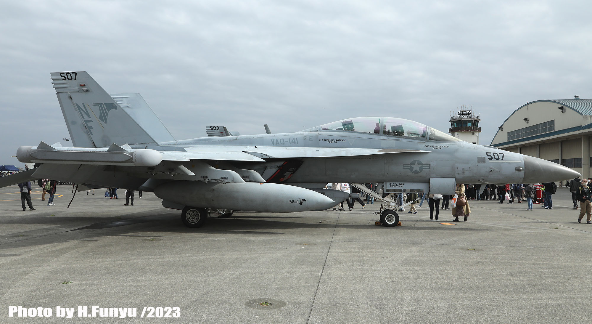 ↑上写真は、2017年4月29日 厚木公開の日展示された新塗装の500番。在日米軍機には旭日旗のモチーフが多いが、これはVAQ-136のEA-6B時代のマーキングの踏襲かもしれない。私的にはVAQ-141本来の黒い塗装をしてほしかった。