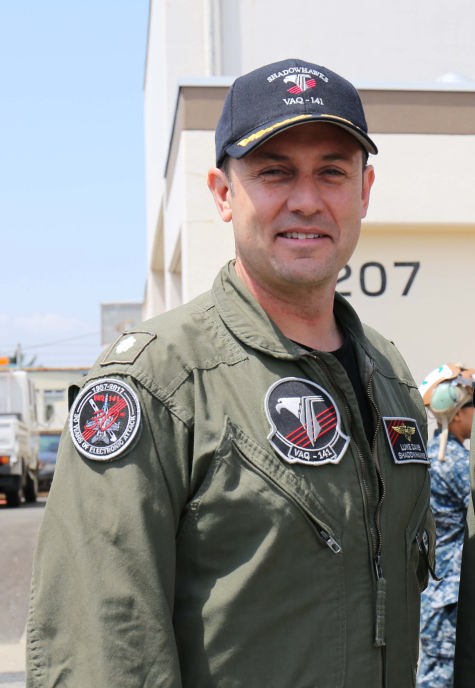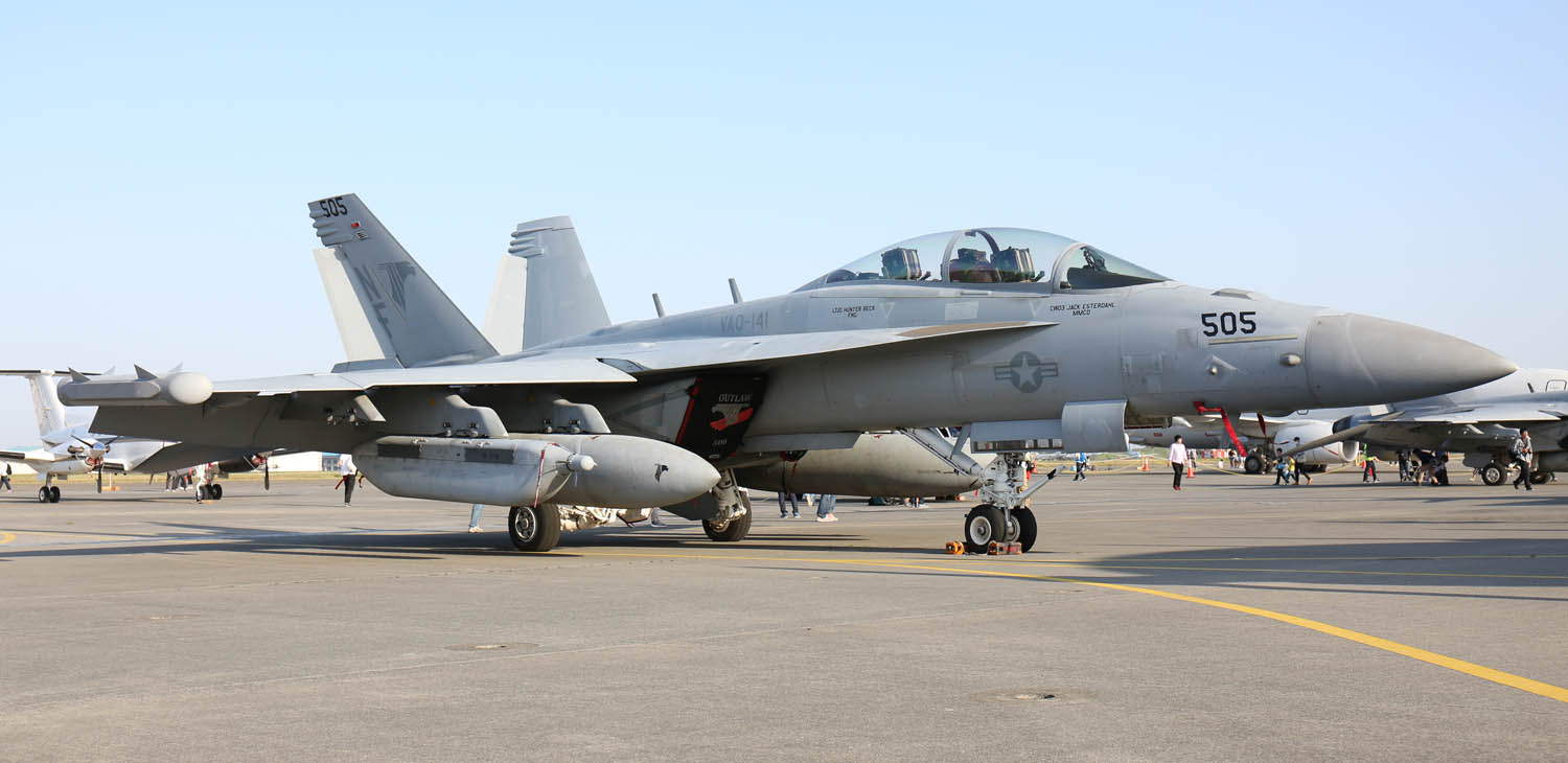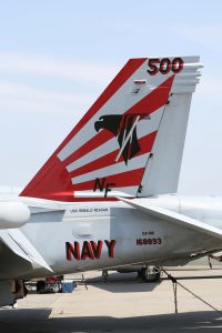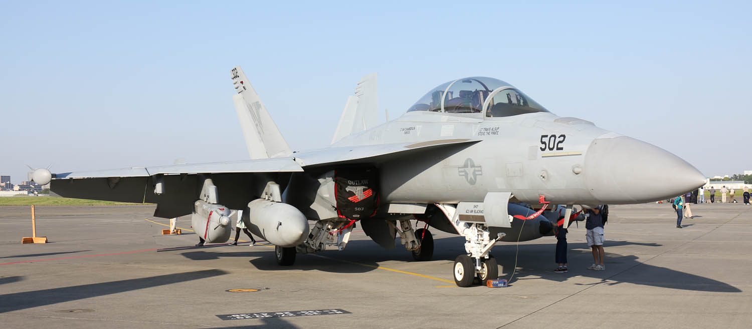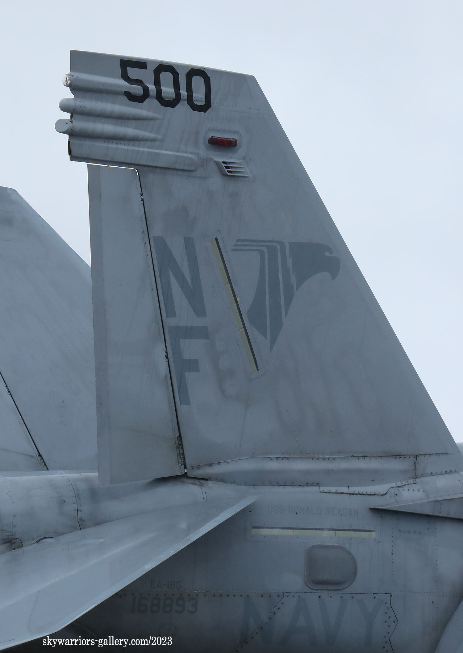 ↑上写真は、2017年4月29日 厚木公開の日展示された新塗装の500番。在日米軍機には旭日旗のモチーフが多いが、これはVAQ-136のEA-6B時代のマーキングの踏襲かもしれない。私的にはVAQ-141本来の黒い塗装をしてほしかった。