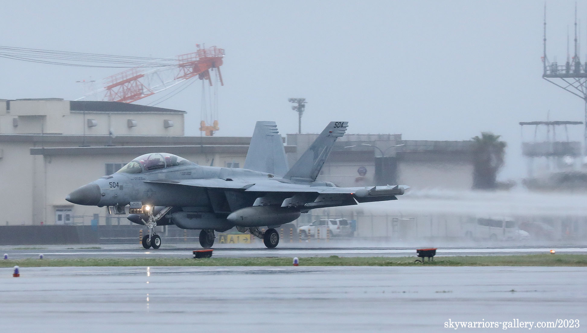↑ 2023年4月15日 雨の降る中、午前中のデモフライトを終えて岩国基地に飛沫を引きながらランディングするEA-18G/NF-504