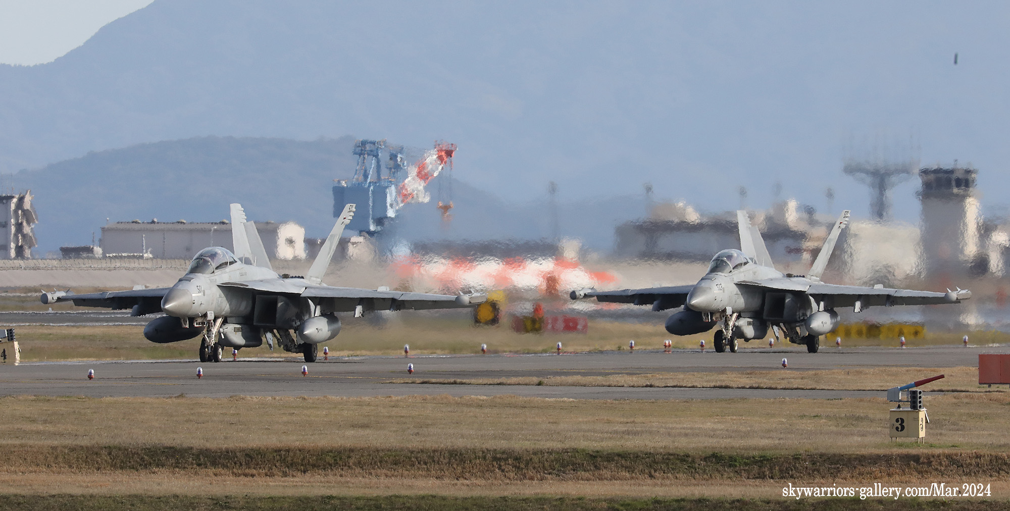 ↑ 夕方 最後のフライトに向かうVAQ-141のEA-18G。夕方になると気温の低下のせいか、陽炎が収まりすっきりとした写真が撮れるようになった。