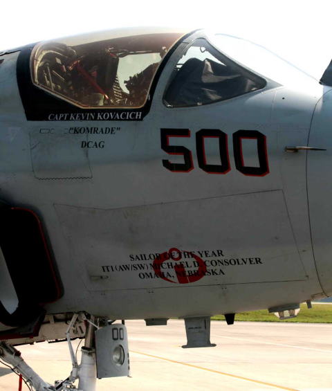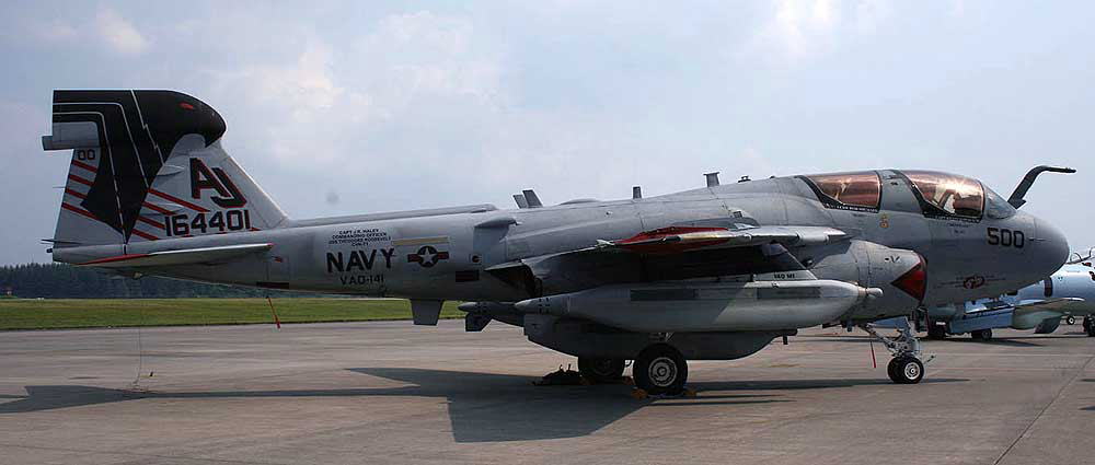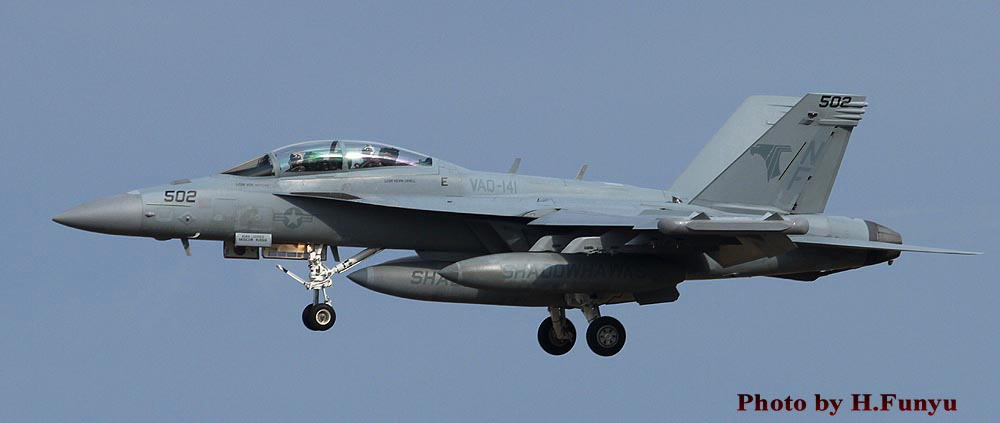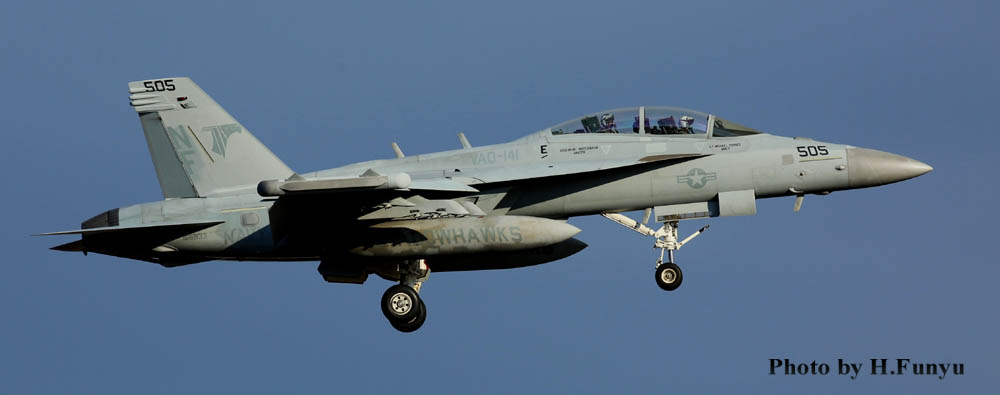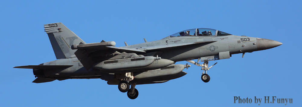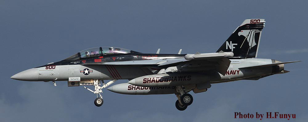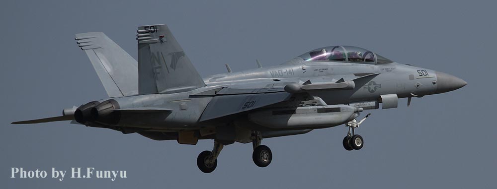 2007年岩国に配備されてマニアの話題になったVAQ-141シャドーホークス。2007年8月の横田基地公開に引き続き、9月9日の岩国基地の公開時に展示されたAJ-503(161350)は、尾翼のレーダードームにカタカナで”シャドーホークス’と書き込む等、センスの良し悪しは別としても、注目を集めた。当時の飛行隊長/中隊長が相当の日本びいきだったらしく、パイロットのネームタグも日本語入りの物をわざわざ作っていた。5機配備された所属機全てのマーキングが異なっていたのも面白かったが、某国からの遠征ではAJ-500が撮れただけでも幸運だったと考える。国内のOHに結構参加していたので、多くのマニアが撮影の機会を得たであろう。VAQ-141はFA-18Gへの転換を2009年中に予定しているので、次に出会うときはグロウラーとなっているはずだ。(2009年2月記))