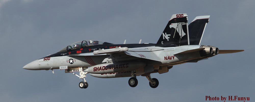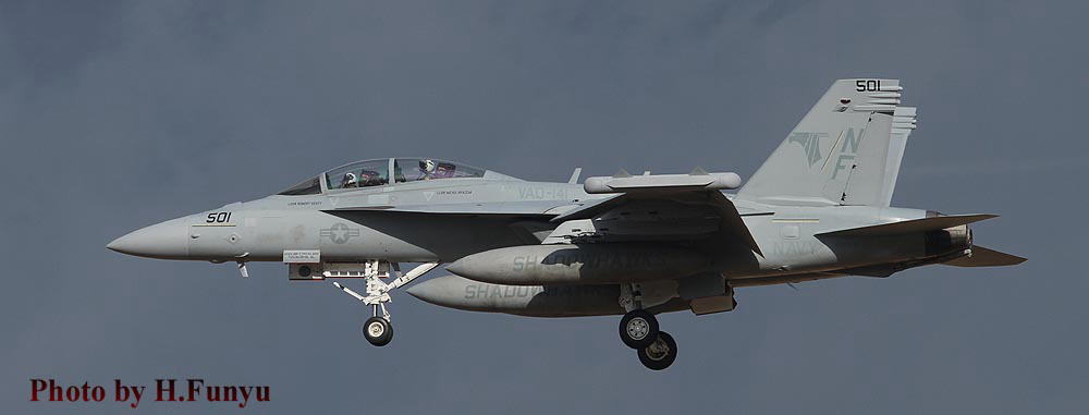 フニュフニュ君の何時もながら見事なショット!! 当日は、決して天候に恵まれた1日ではなかったそうだが、EA-18Gがランディングした時間だけが幸運にも日差しが出て、光のあたった機体を捉える事が出来たそうである。運にも恵まれている。
