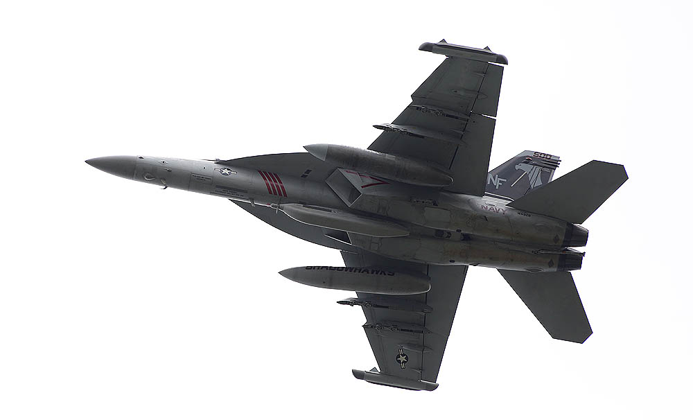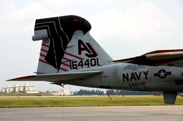デザイン的には、EA-6B時代の尾翼の赤い4本線をストレーキ下部の胴体に移したことにより、長い胴体のラインに締りが出て、正解である。流石はアメリカ海軍、専門のデザイナーを使ったかどうかは不明だが素晴らしいマーキングである。