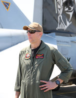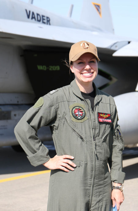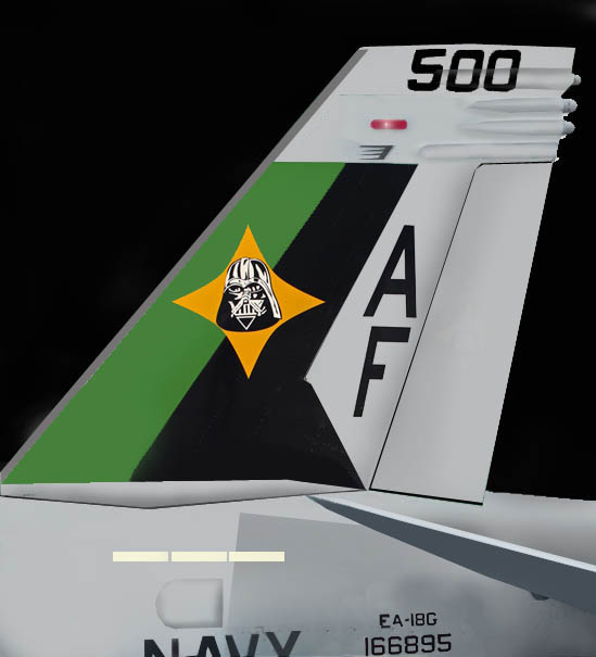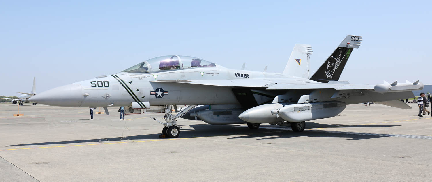 スタ-ウォーズのダースベーダー卿の顔を尾翼に大書きしたデザインに更新され,再び日本を訪れたVAQ-209。なんと2018年4月,厚木の公開にも展示されたのでこの日一番の目玉展示となった。但し 部隊としてこのデザインは、EA-6Bプラウラー時代に使ったものであり,人気があったので再度カムバックさせたのだろう。当日、この展示機の周辺は映画スターウォーズのテーマ曲が流れ、若いご婦人達も尾翼のマークの正体が悪しきベーダ―卿と判るのにそう時間はかからなかったようだ。